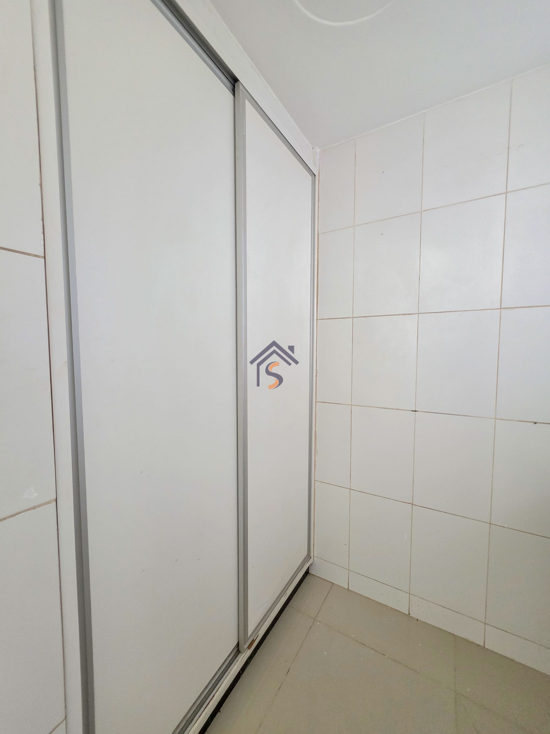 Apartamento com dois quartos, sendo uma suíte, sala de estar integrada à sala de jantar, varanda com blindex, cozinha, banheiro social, área de serviço com armários e uma vaga de garagem descoberta.