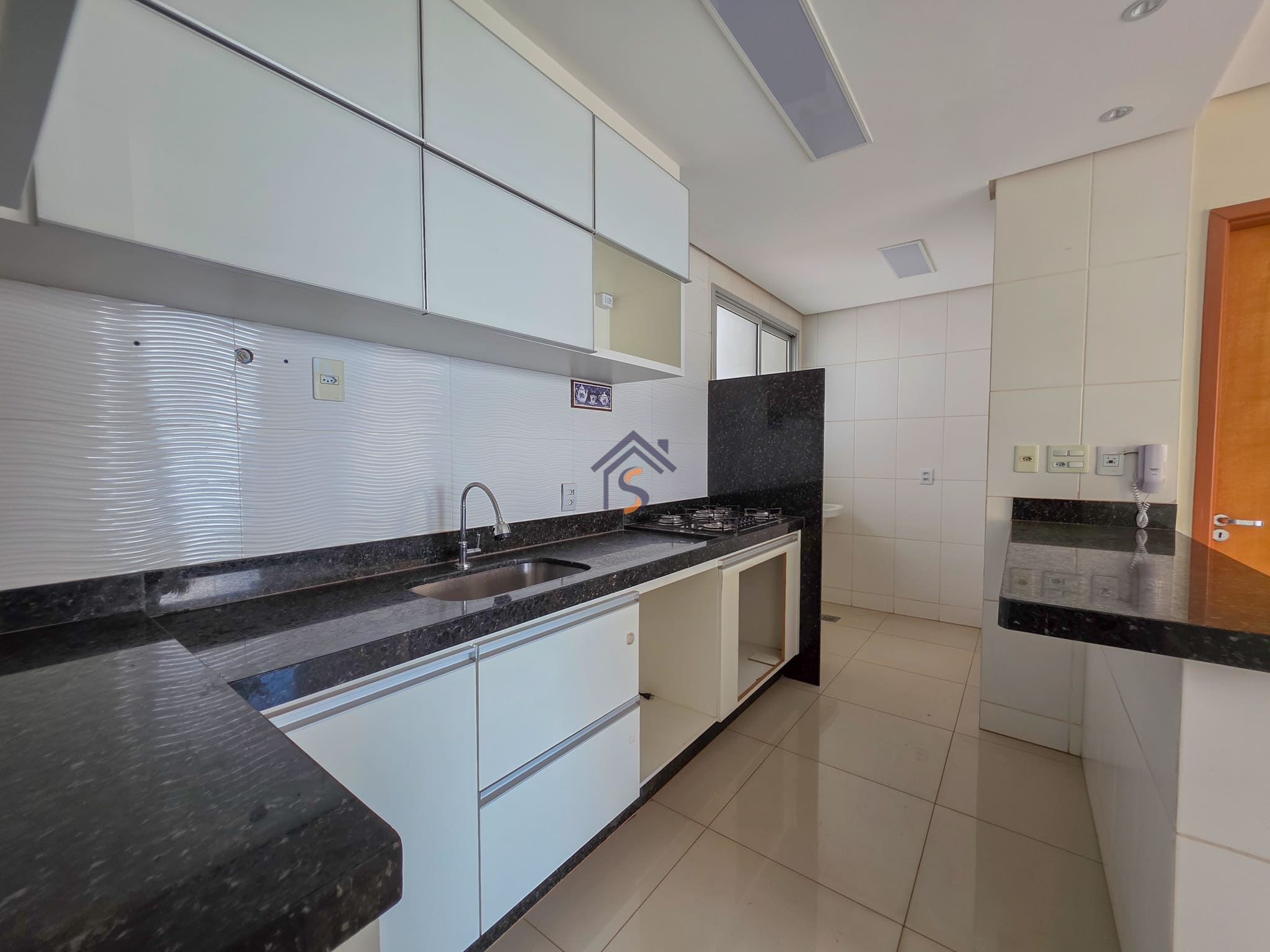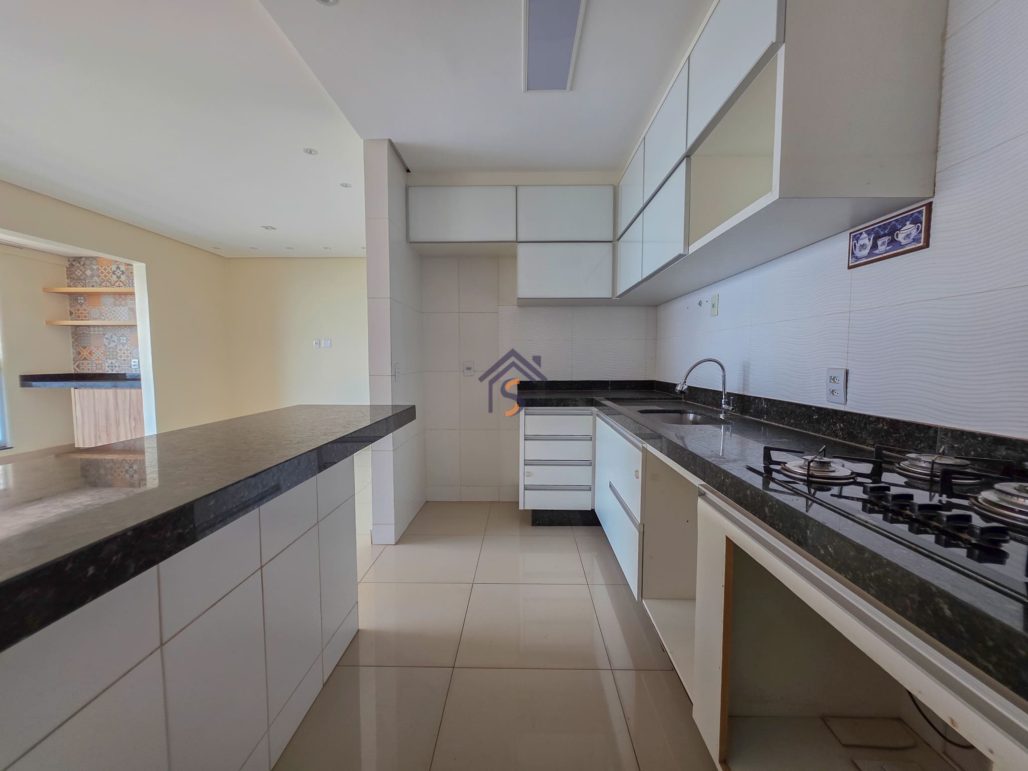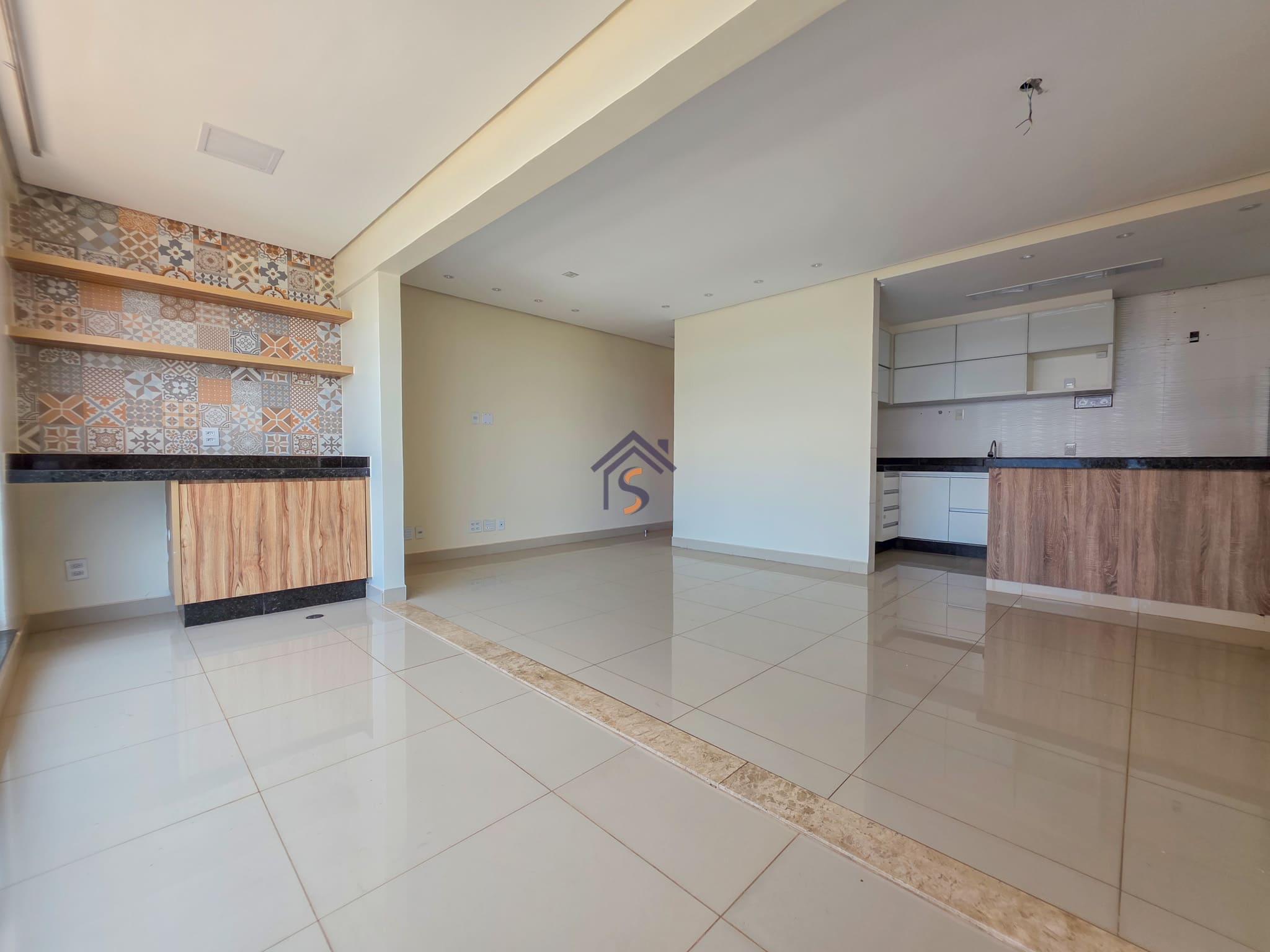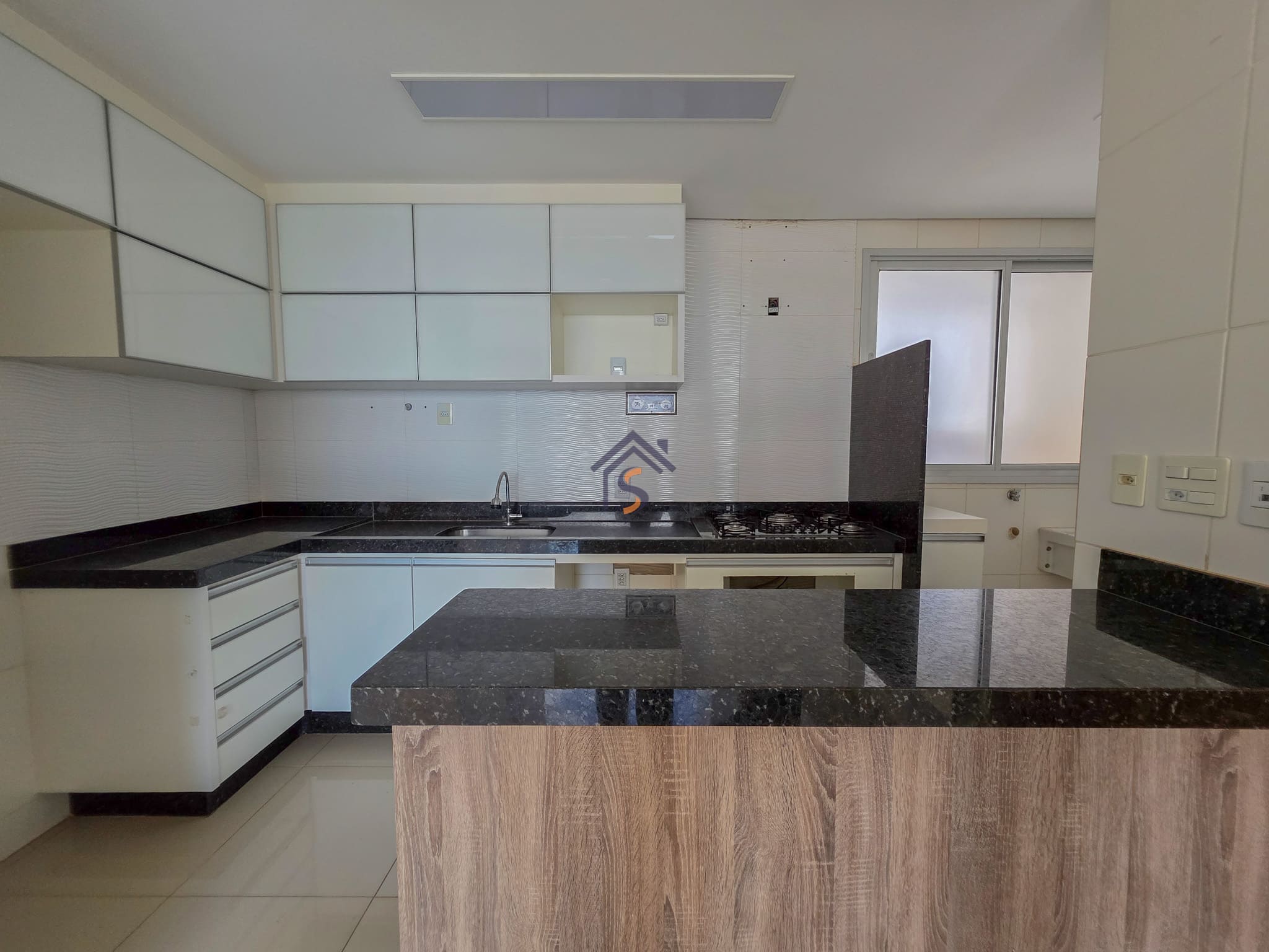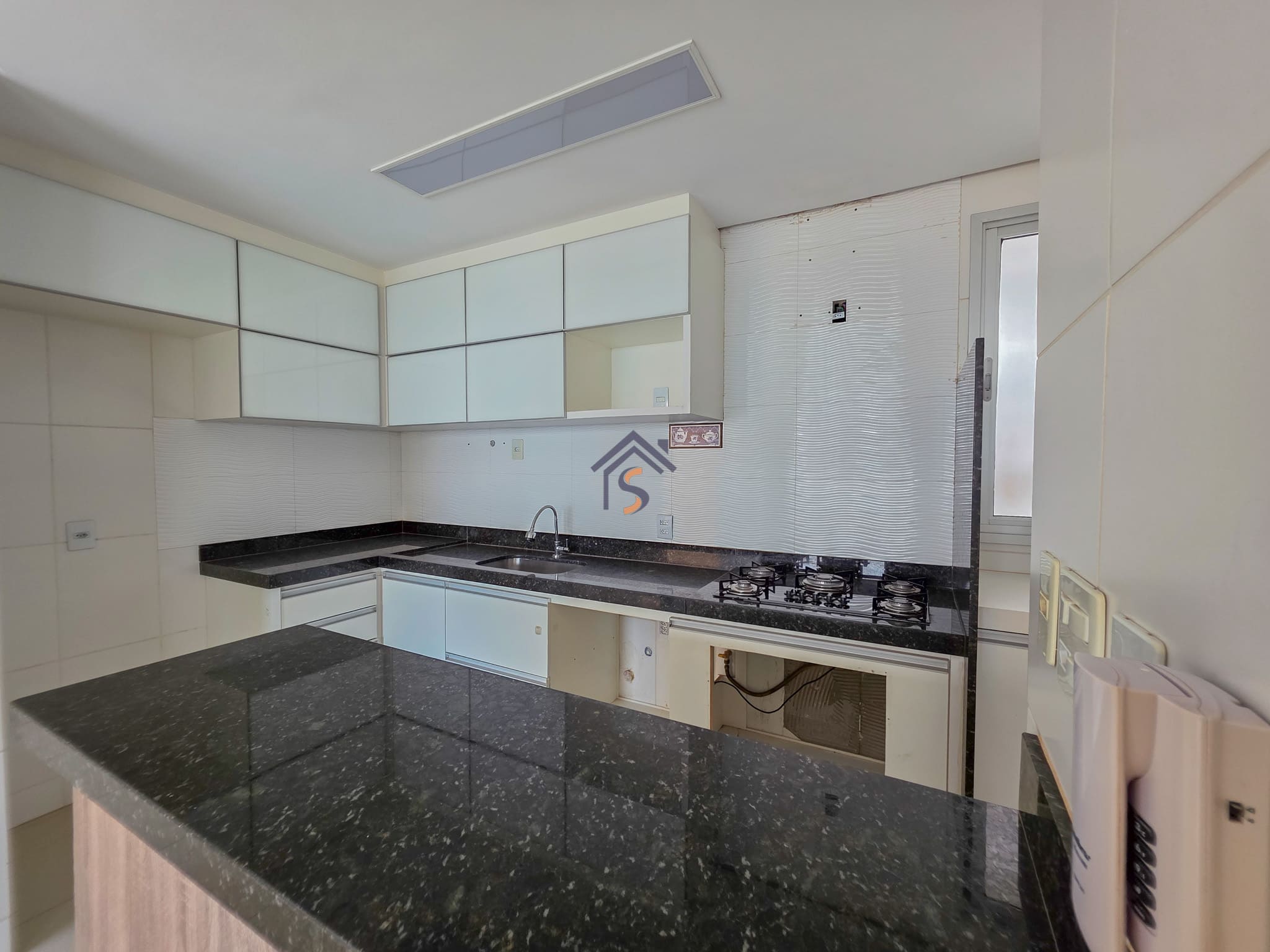 Apartamento com três quartos, sendo uma suíte plena e duas suítes americanas, sala de estar integrada à sala de jantar, cortina de vidro, cozinha, lavabo, área de serviço com armários e duas vagas de garagem cobertas.