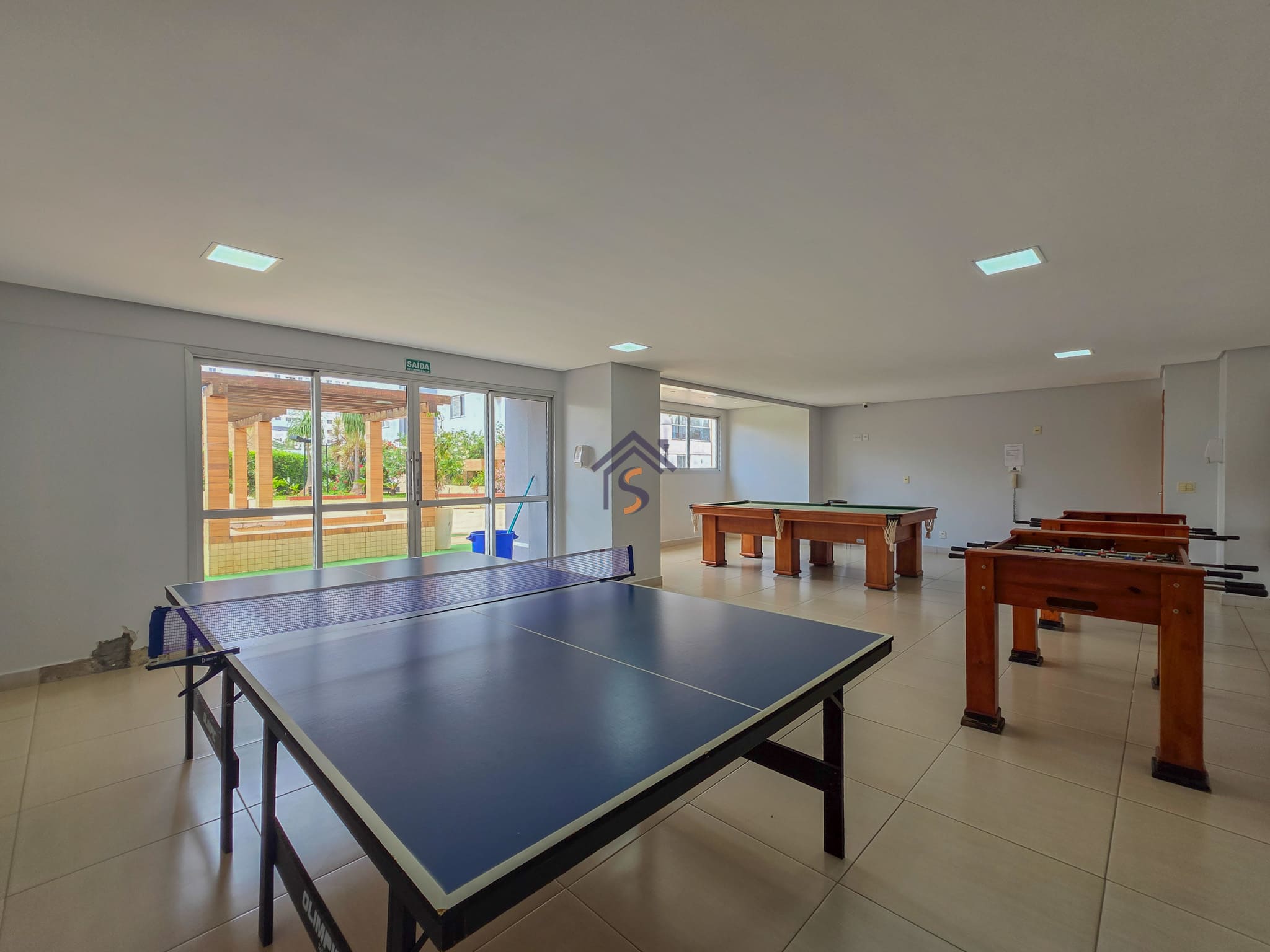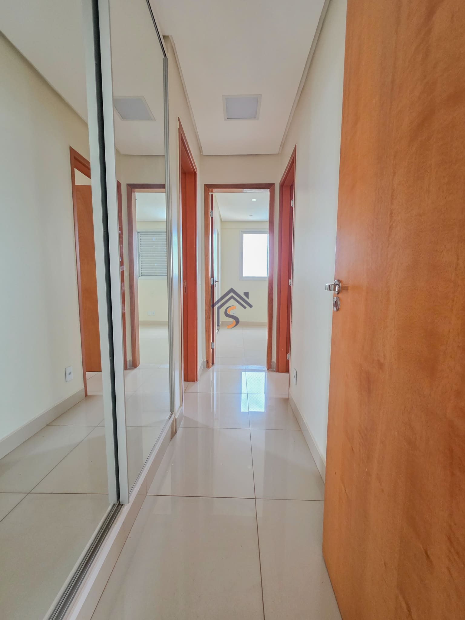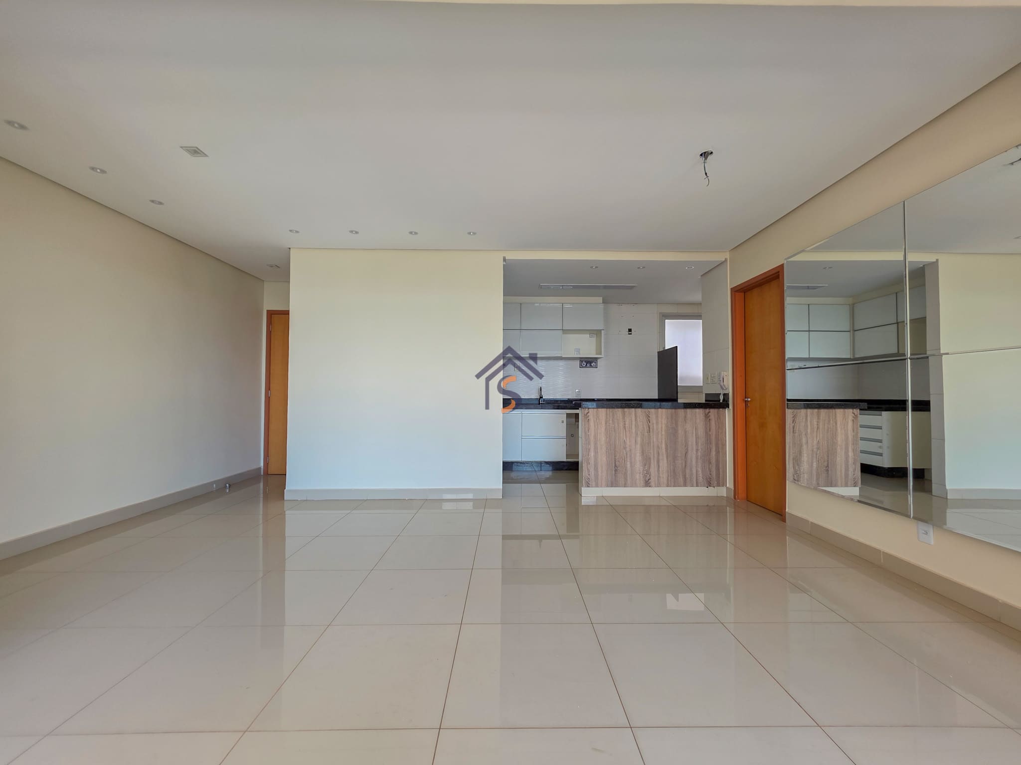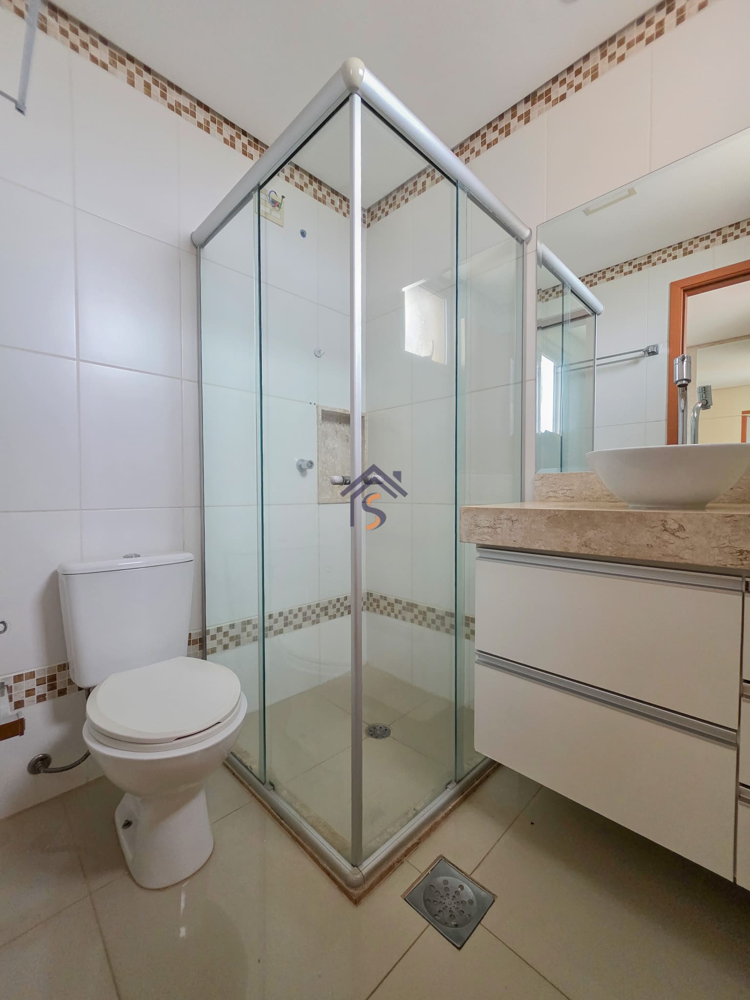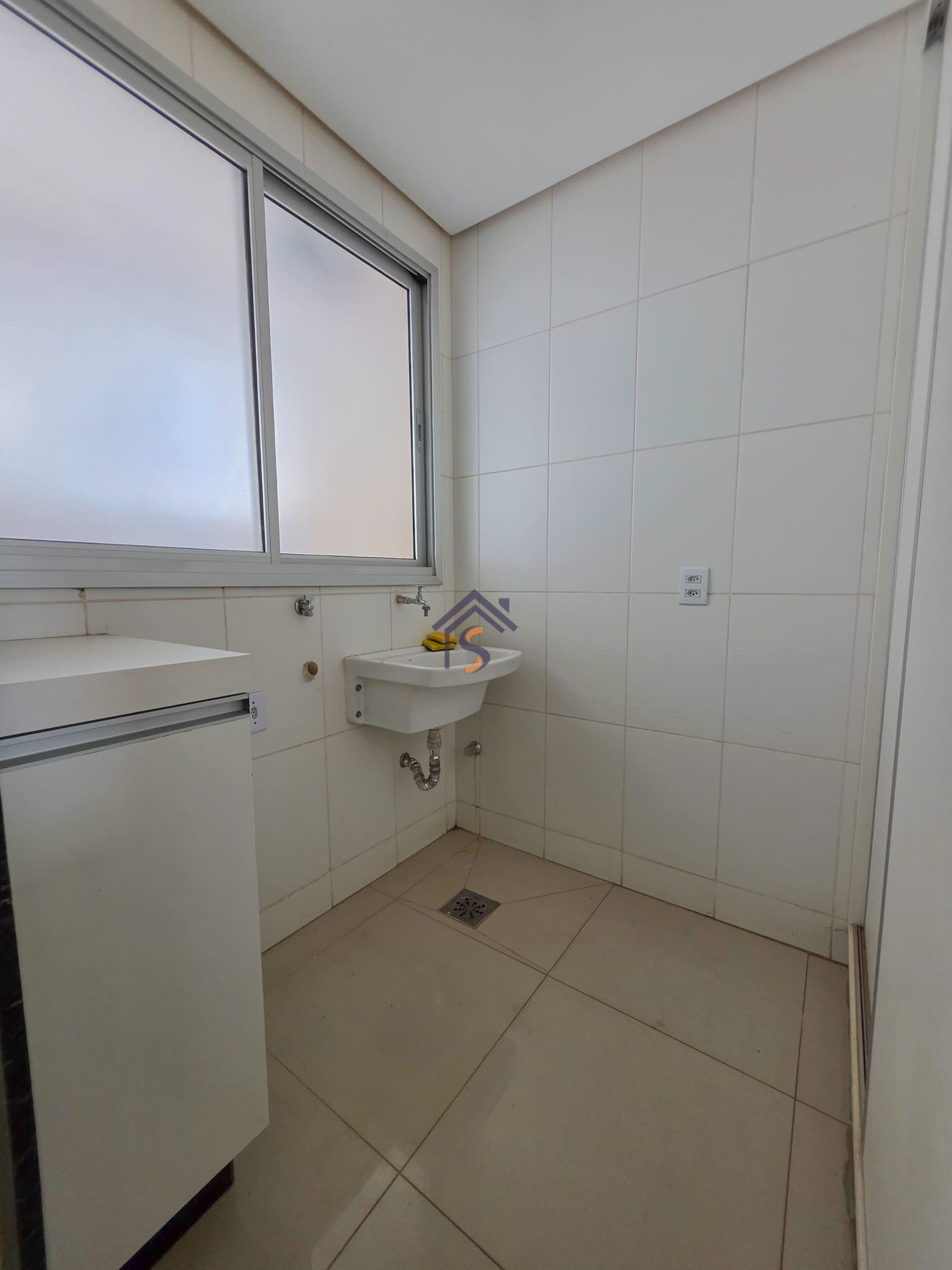 Apartamento com três quartos, sendo uma suíte plena e duas suítes americanas, sala de estar integrada à sala de jantar, cortina de vidro, cozinha, lavabo, área de serviço com armários e duas vagas de garagem cobertas.