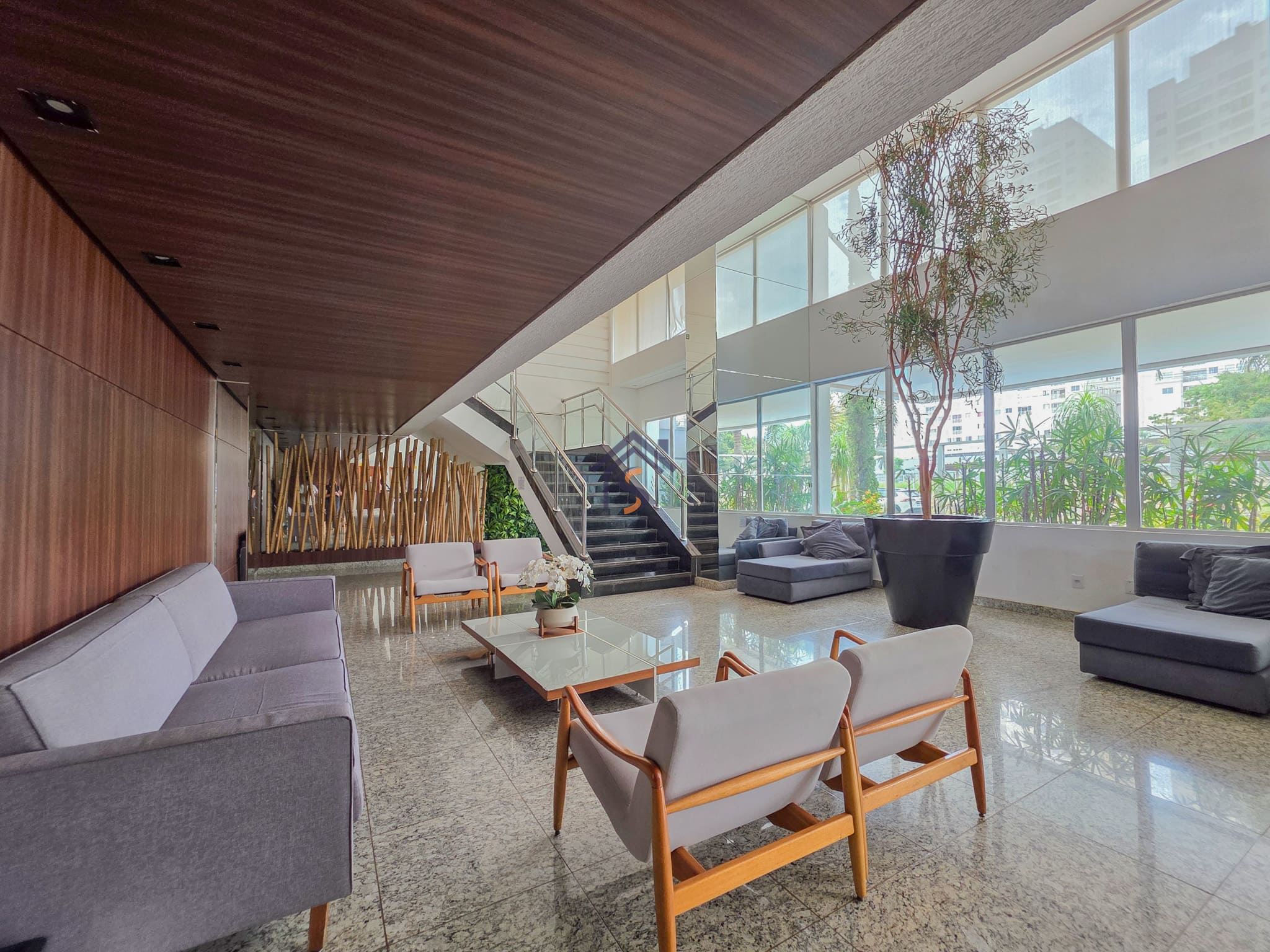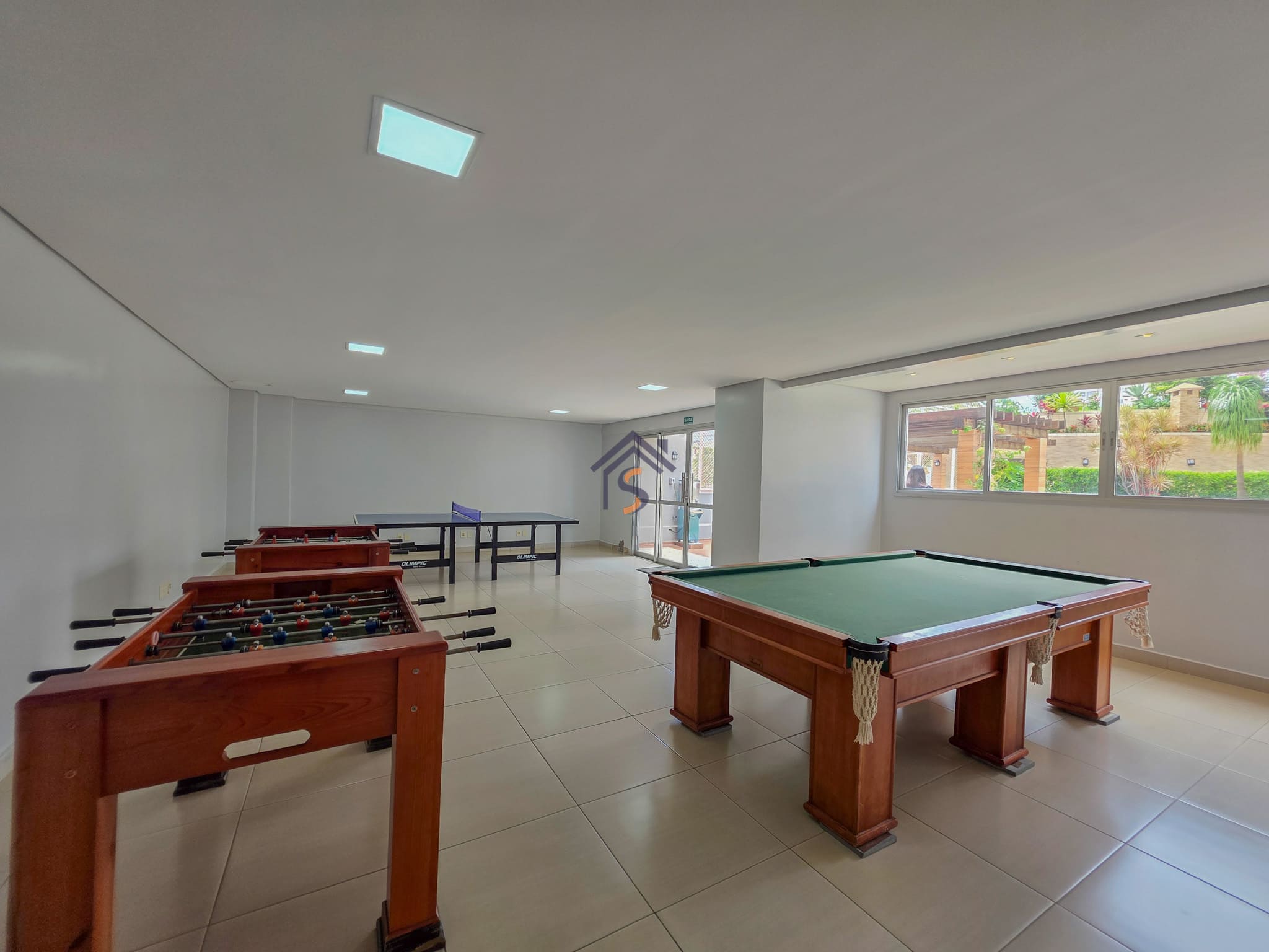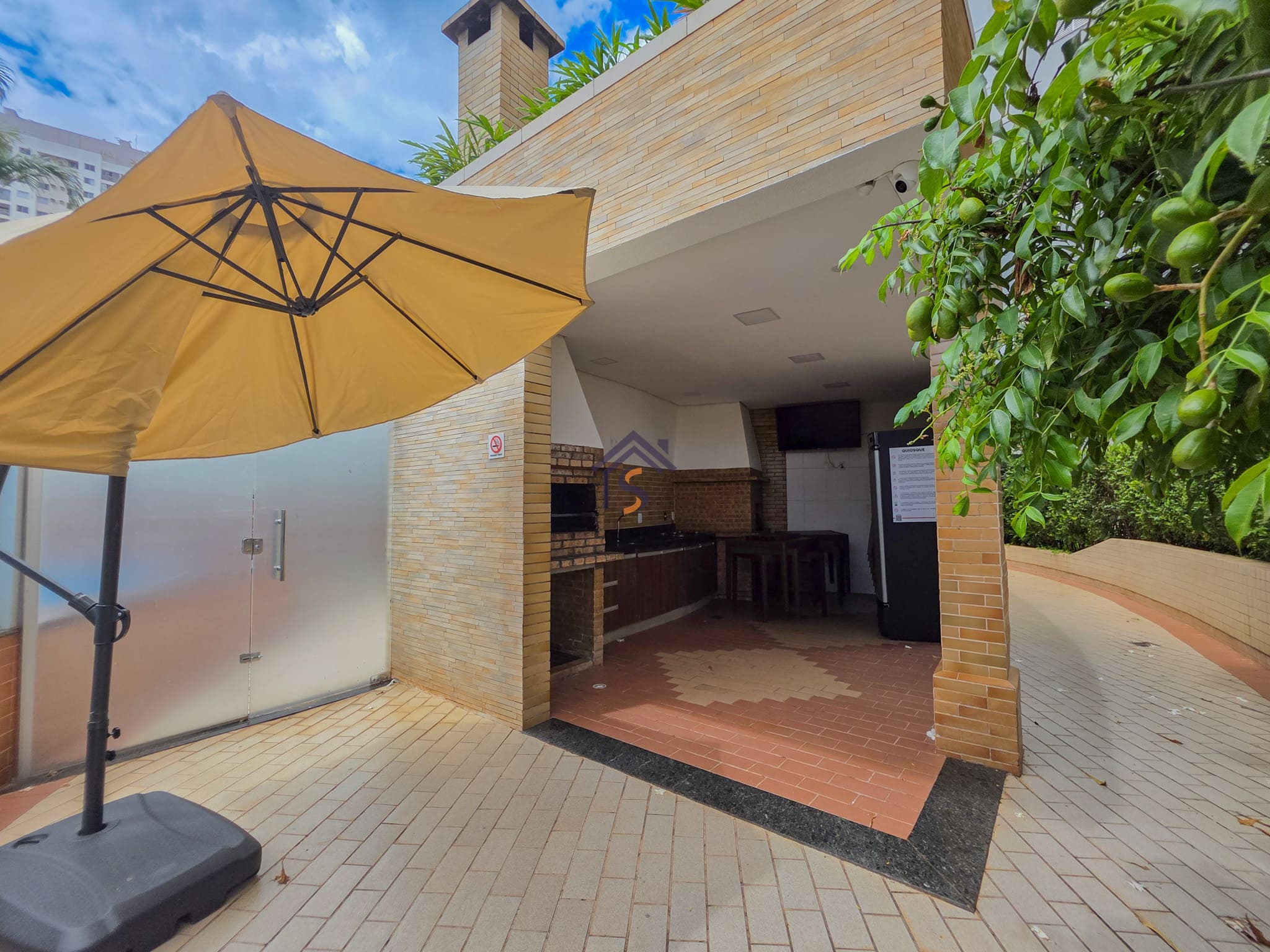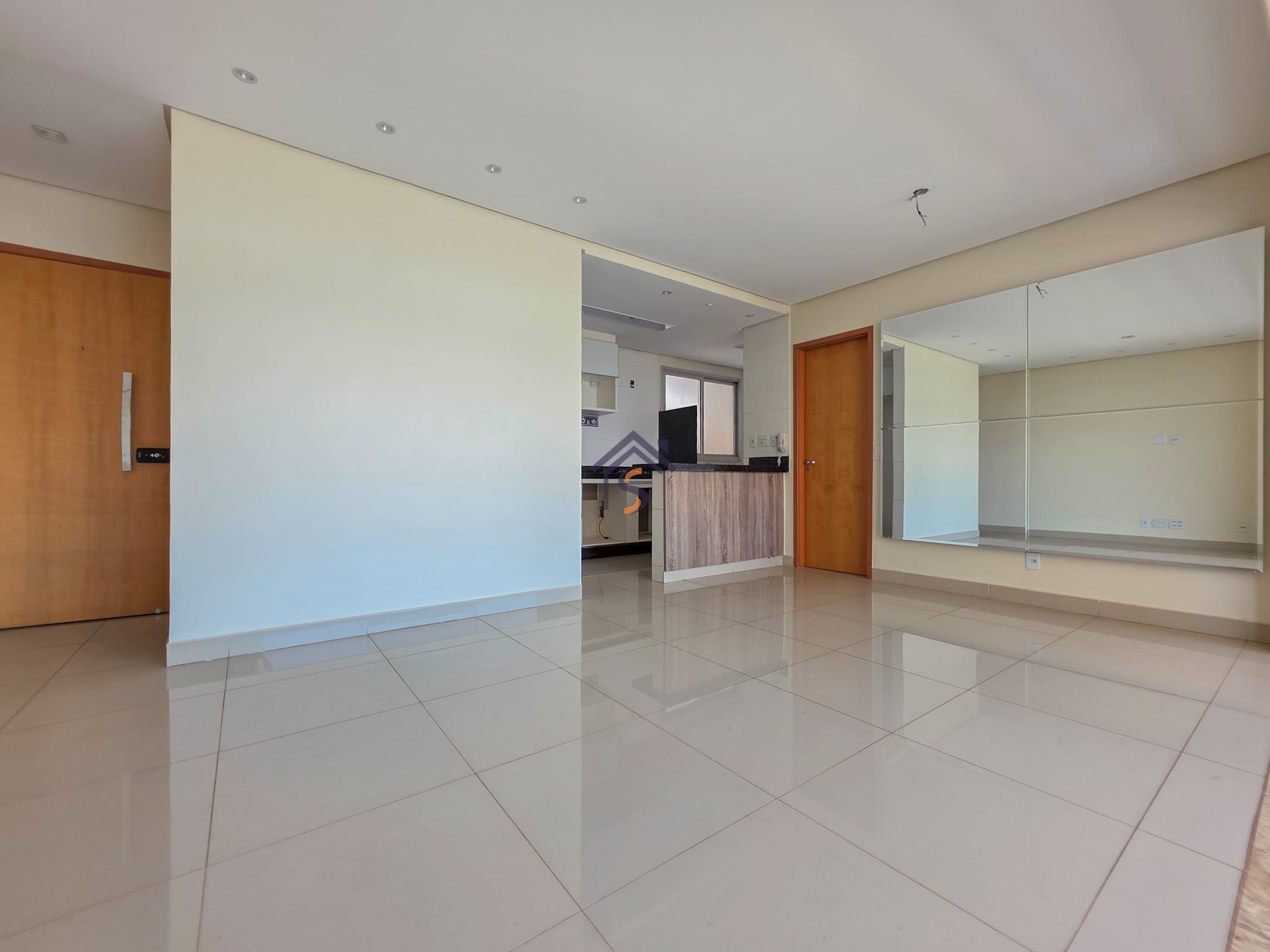 Apartamento com três quartos, sendo uma suíte plena e duas suítes americanas, sala de estar integrada à sala de jantar, cortina de vidro, cozinha, lavabo, área de serviço com armários e duas vagas de garagem cobertas.