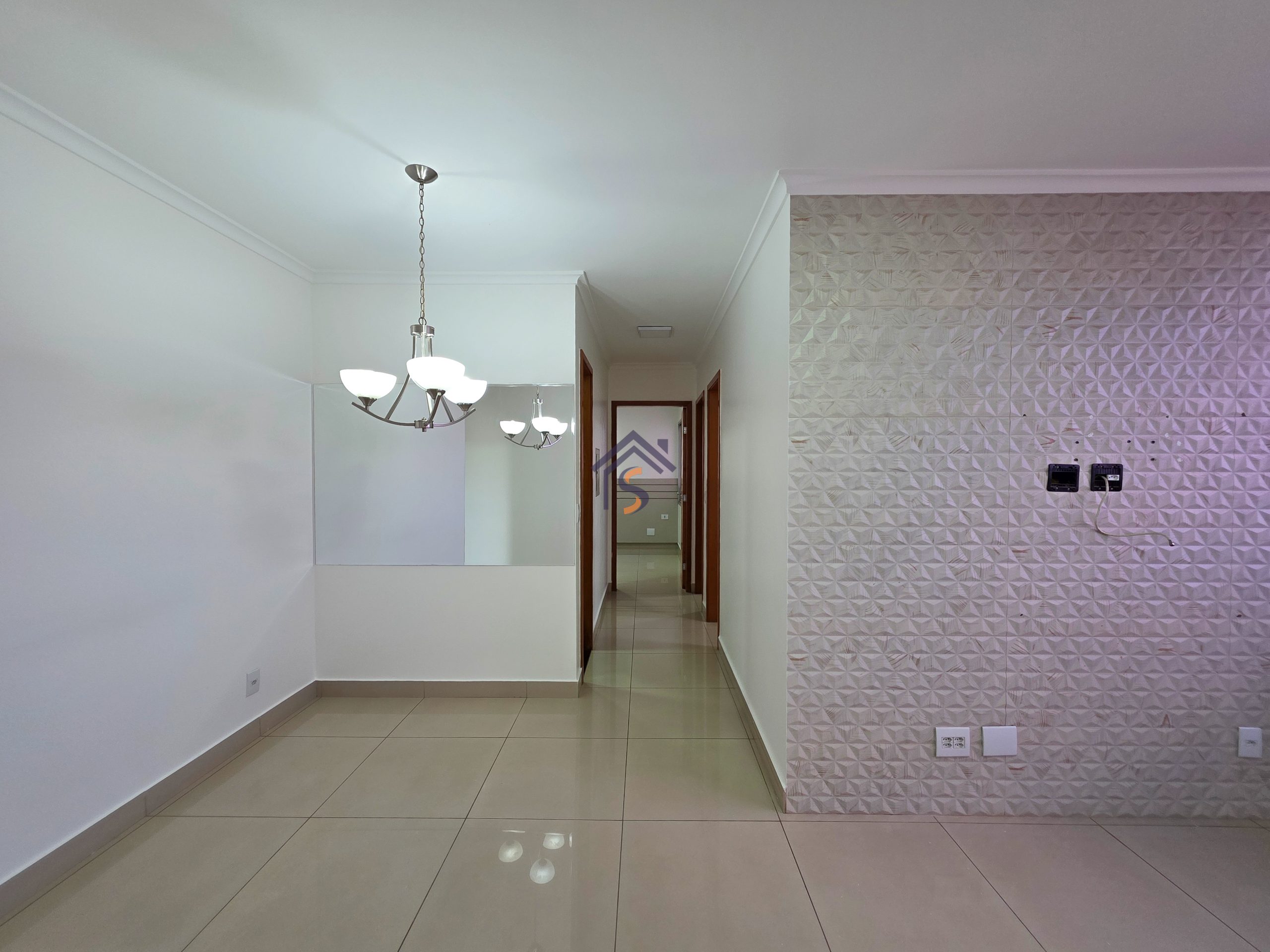 Apartamento com três quartos, sendo uma suíte, sala de estar e jantar amplas, cozinha, banheiro social, área de serviço e uma vaga de garagem coberta.