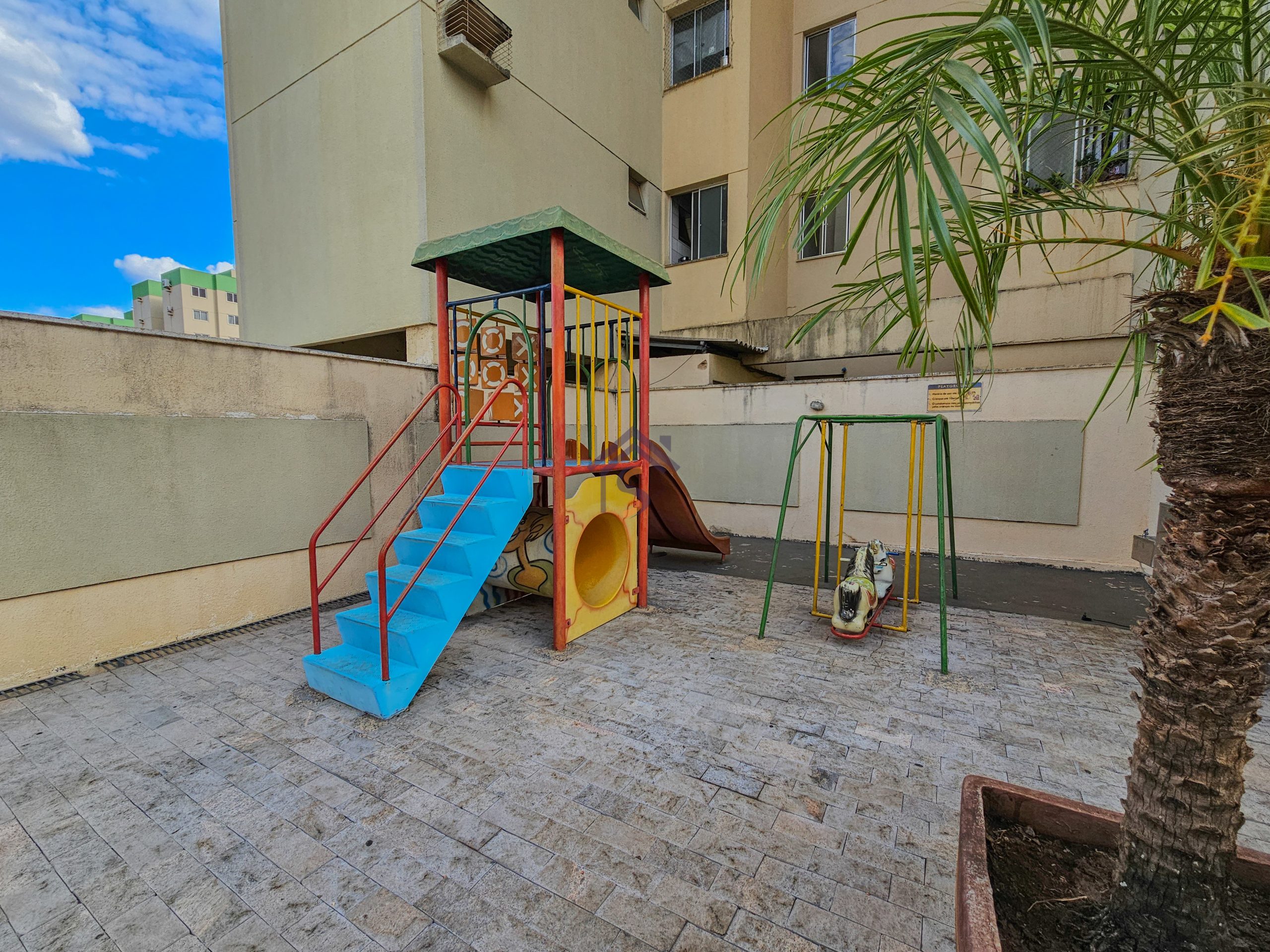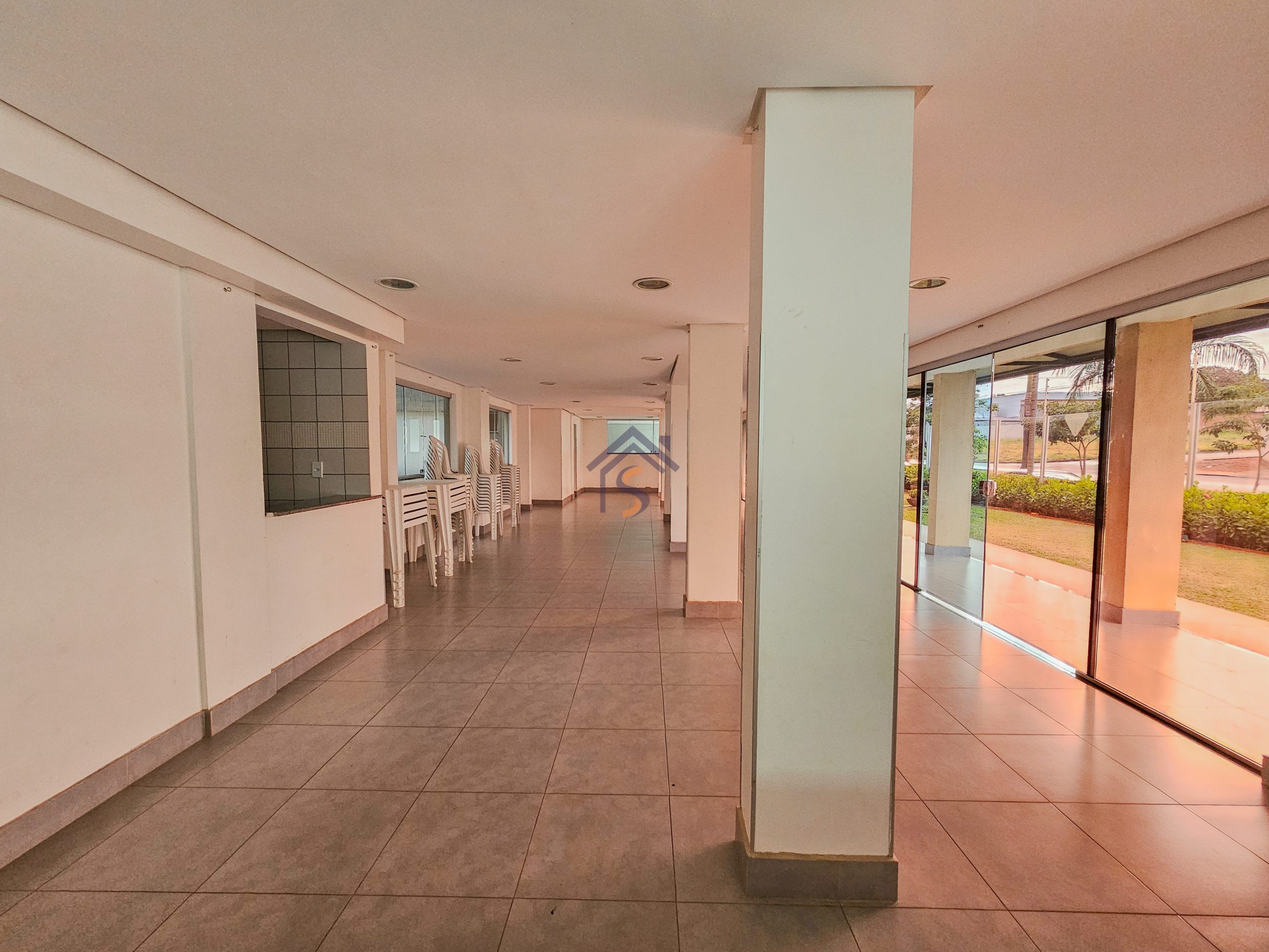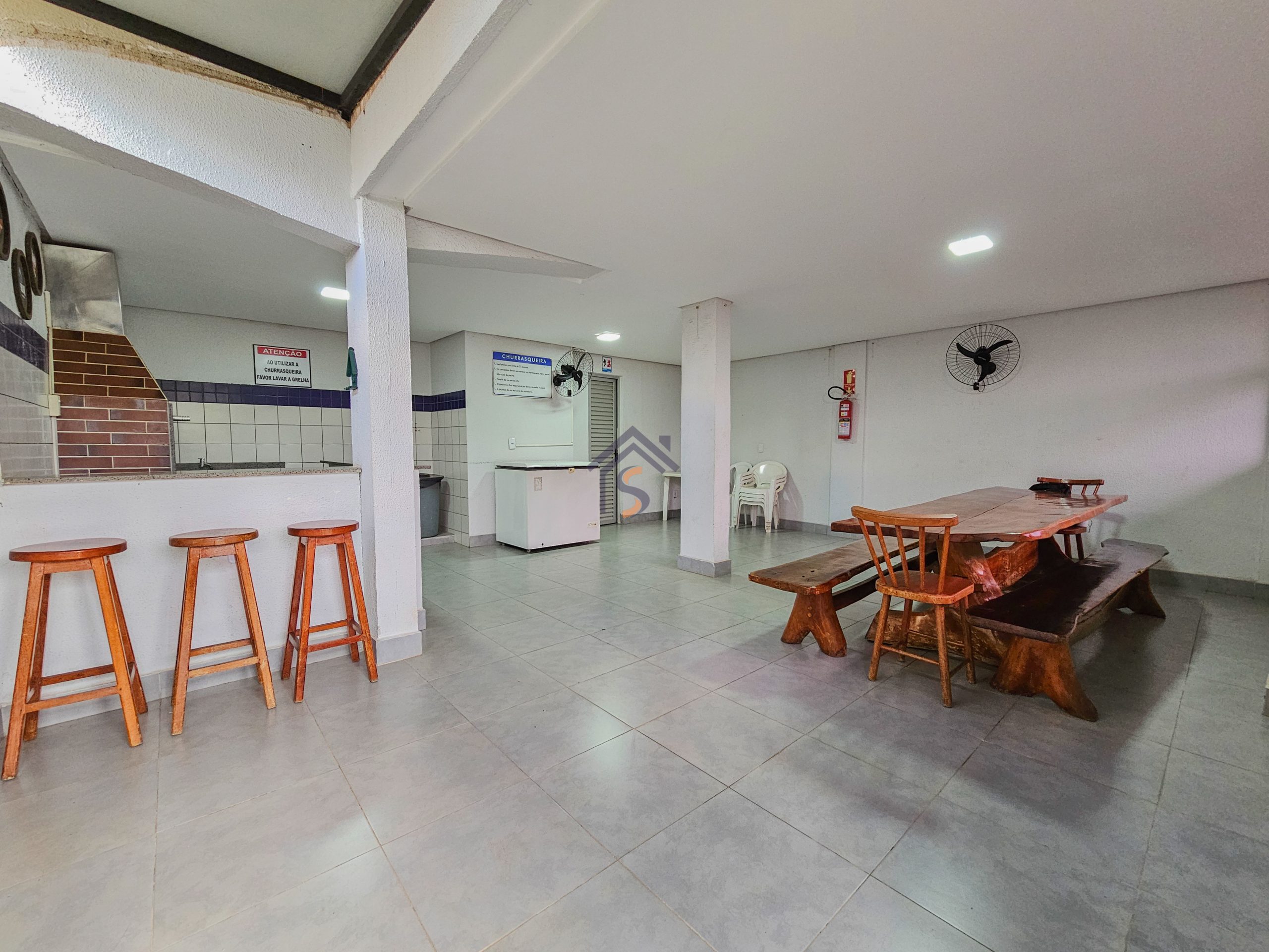 A área de lazer com salão de festas, duas áreas com churrasqueira com freezer, mesas e cadeiras, piscina, brinquedoteca, playground e academia.