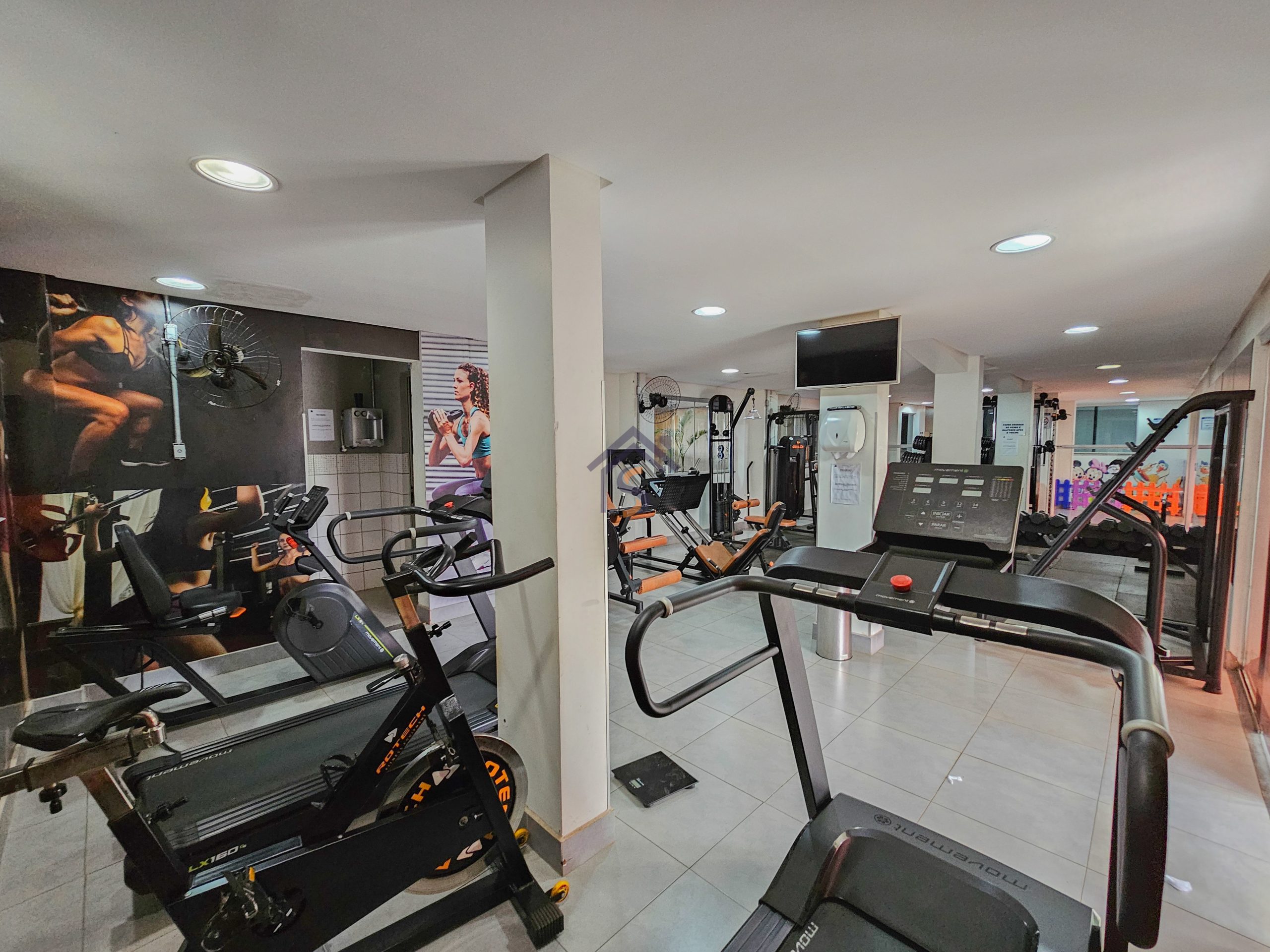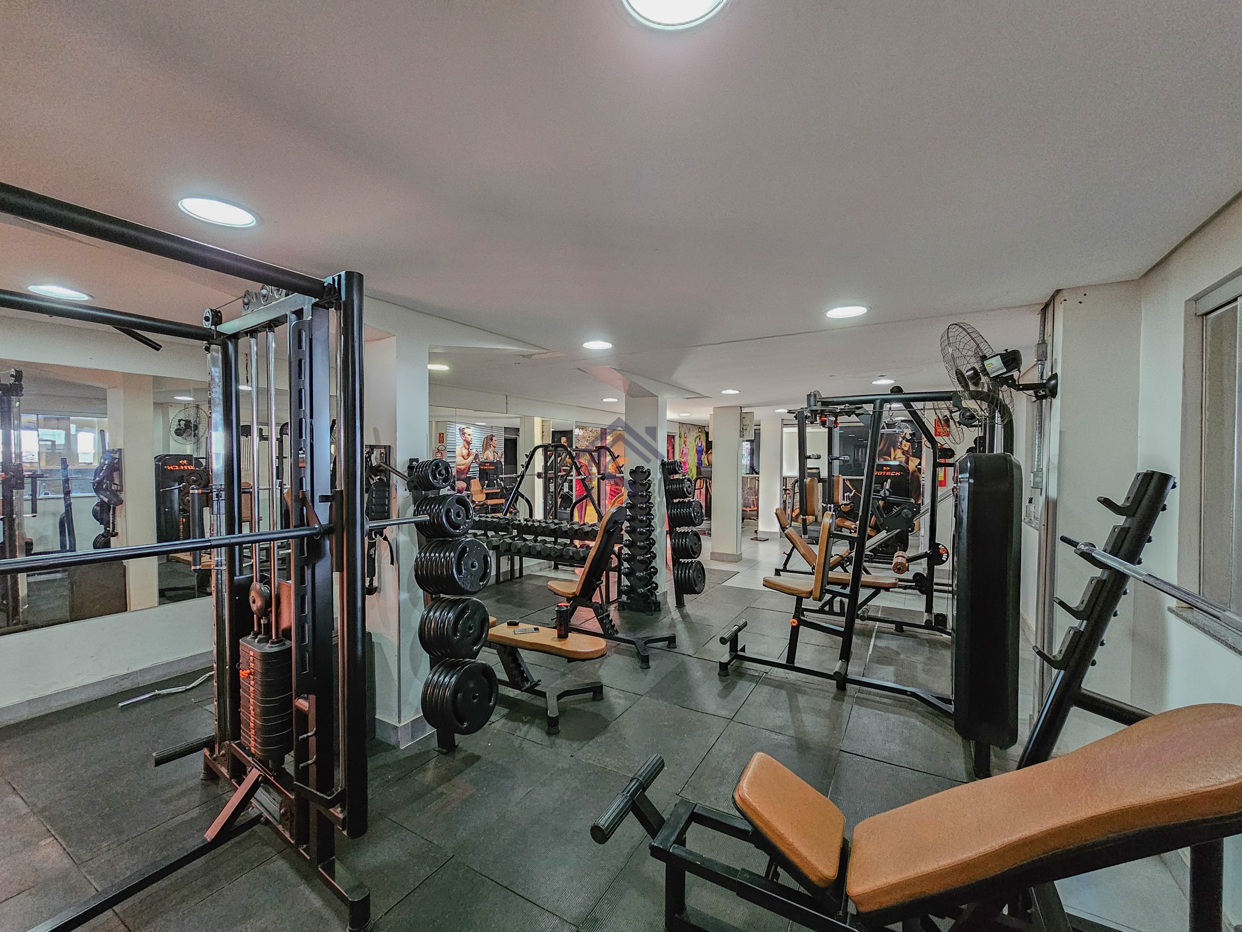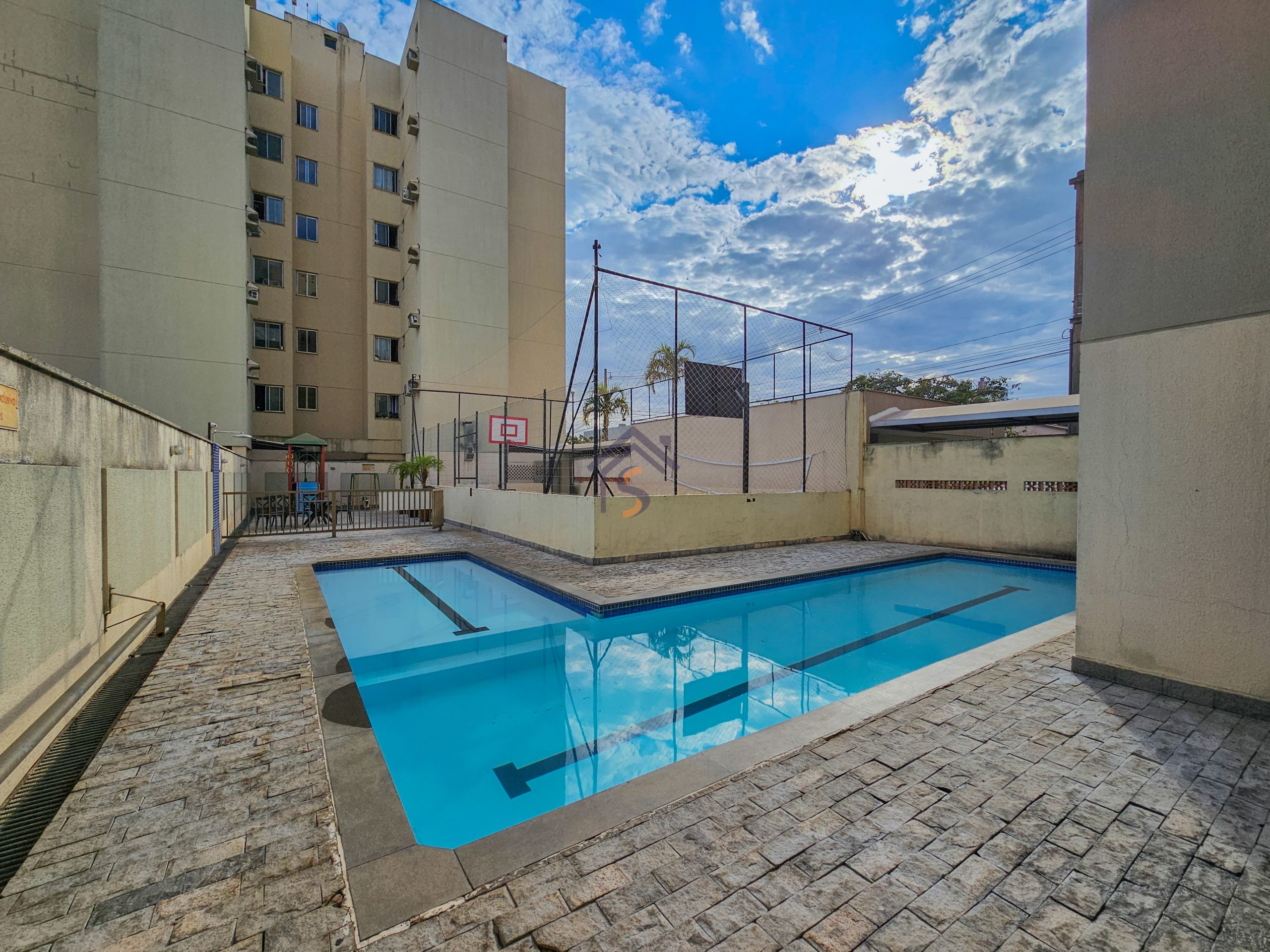 A área de lazer com salão de festas, duas áreas com churrasqueira com freezer, mesas e cadeiras, piscina, brinquedoteca, playground e academia.