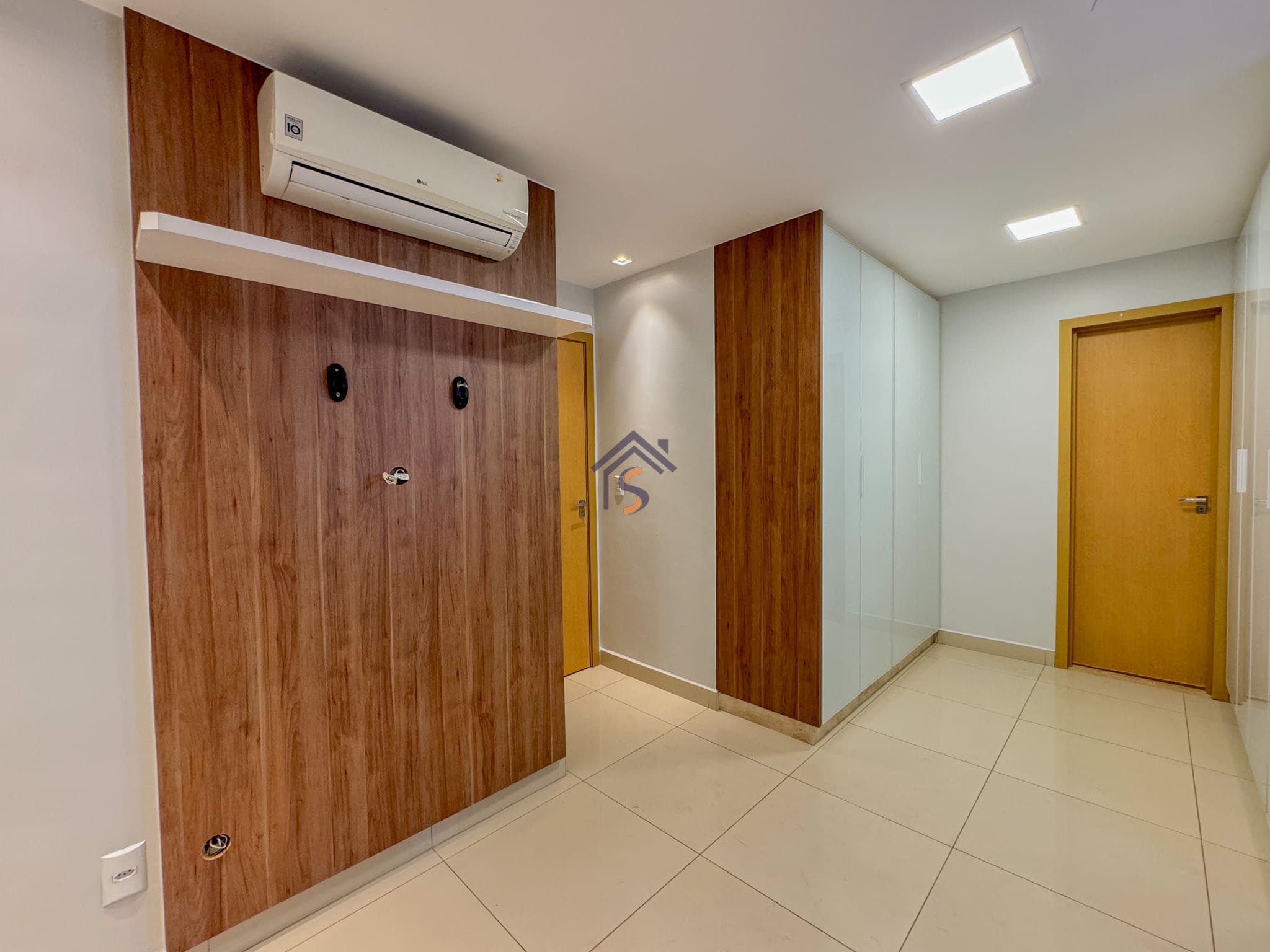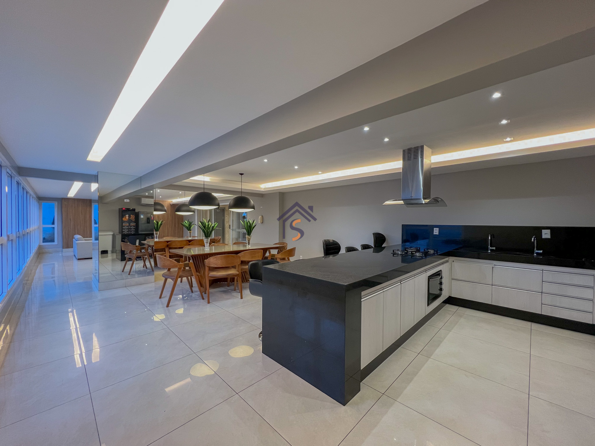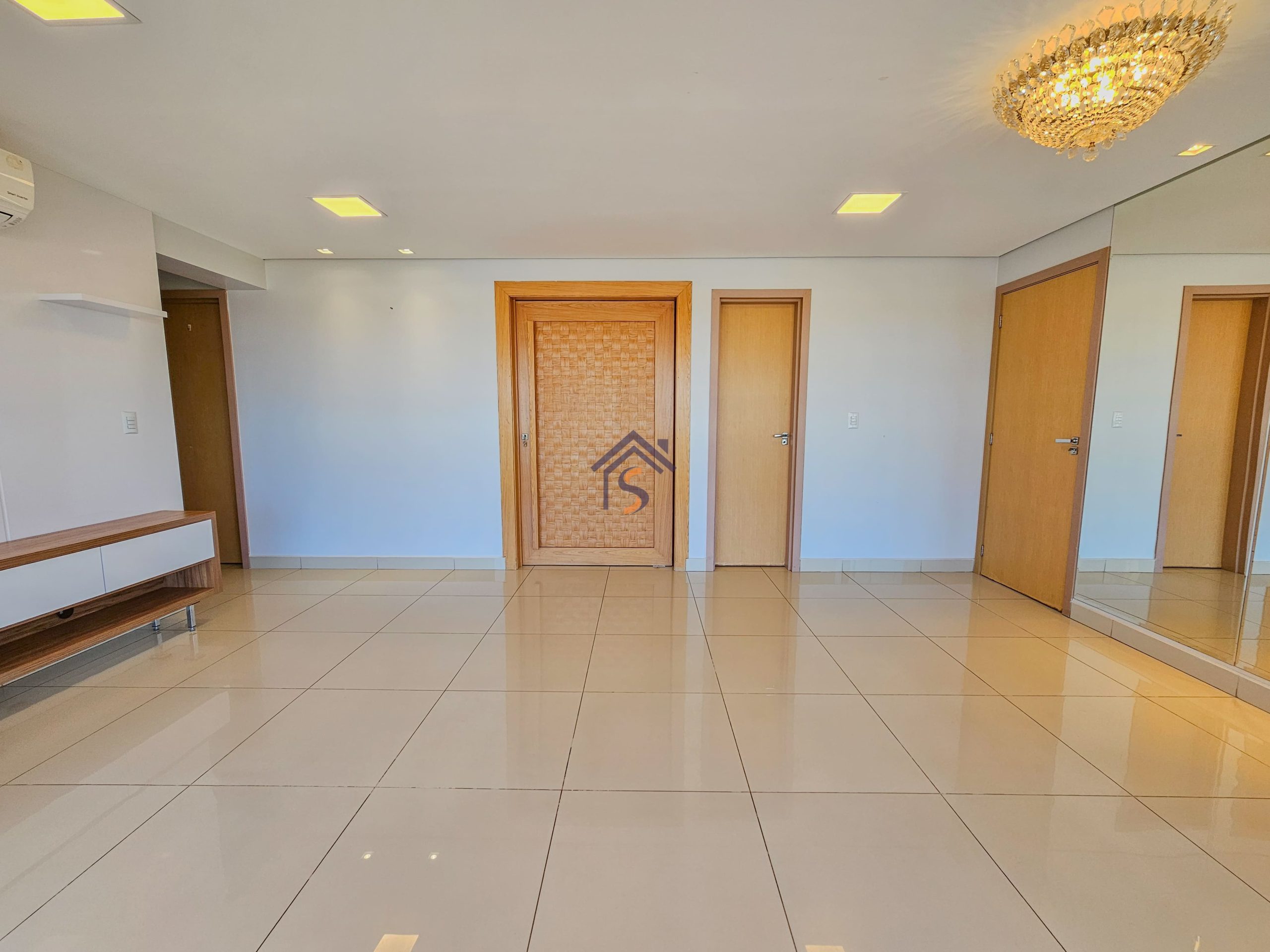 Acabamento diferenciado, com piso em porcelanato, elevador e hall privativo, sala de jantar com espelho, cortina e lustre, cozinha completa em armários planejados, três quartos possuem armários e ar-condicionado, banheiros com armários, espelhos e box, mantendo o mesmo padrão de elegância nos acabamentos.