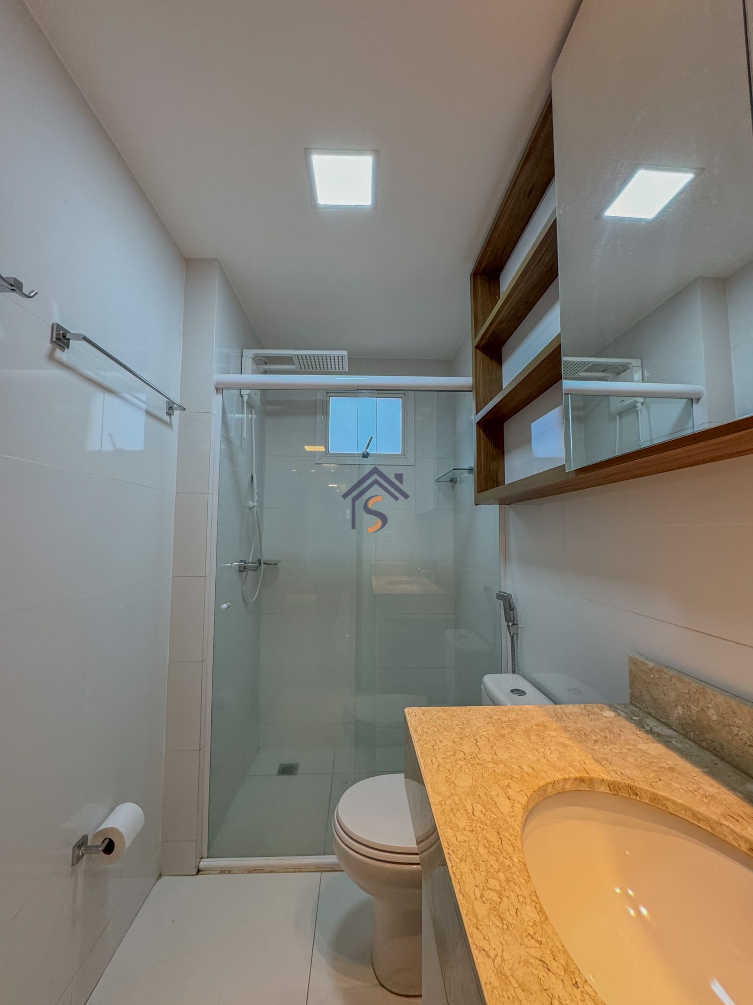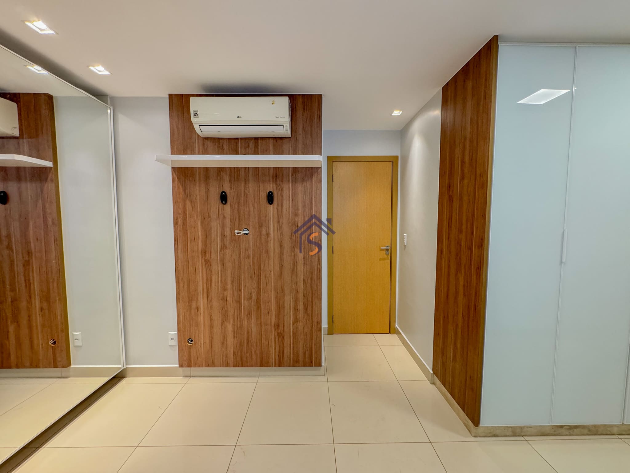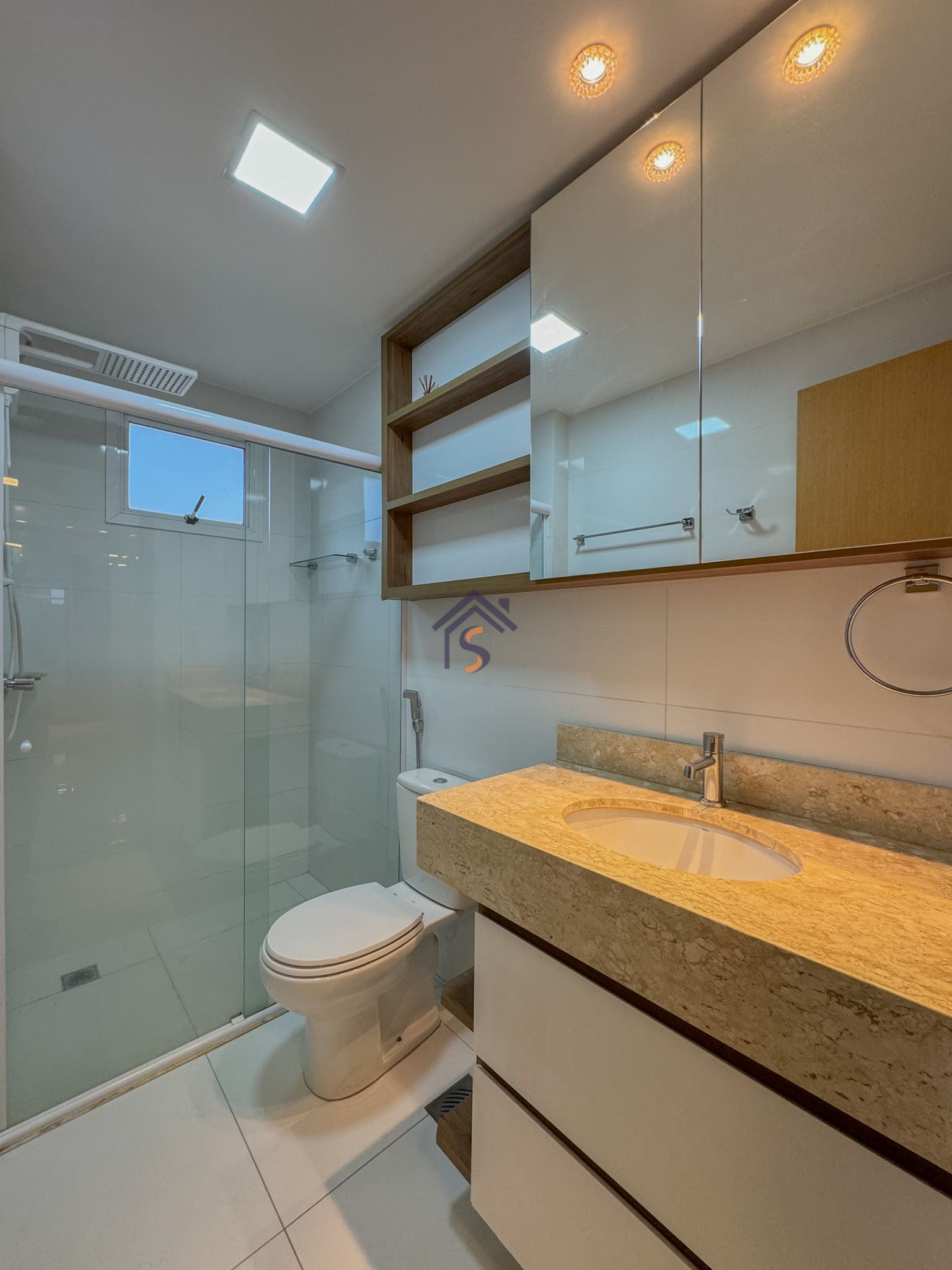 Acabamento diferenciado, com piso em porcelanato, elevador e hall privativo, sala de jantar com espelho, cortina e lustre, cozinha completa em armários planejados, três quartos possuem armários e ar-condicionado, banheiros com armários, espelhos e box, mantendo o mesmo padrão de elegância nos acabamentos.