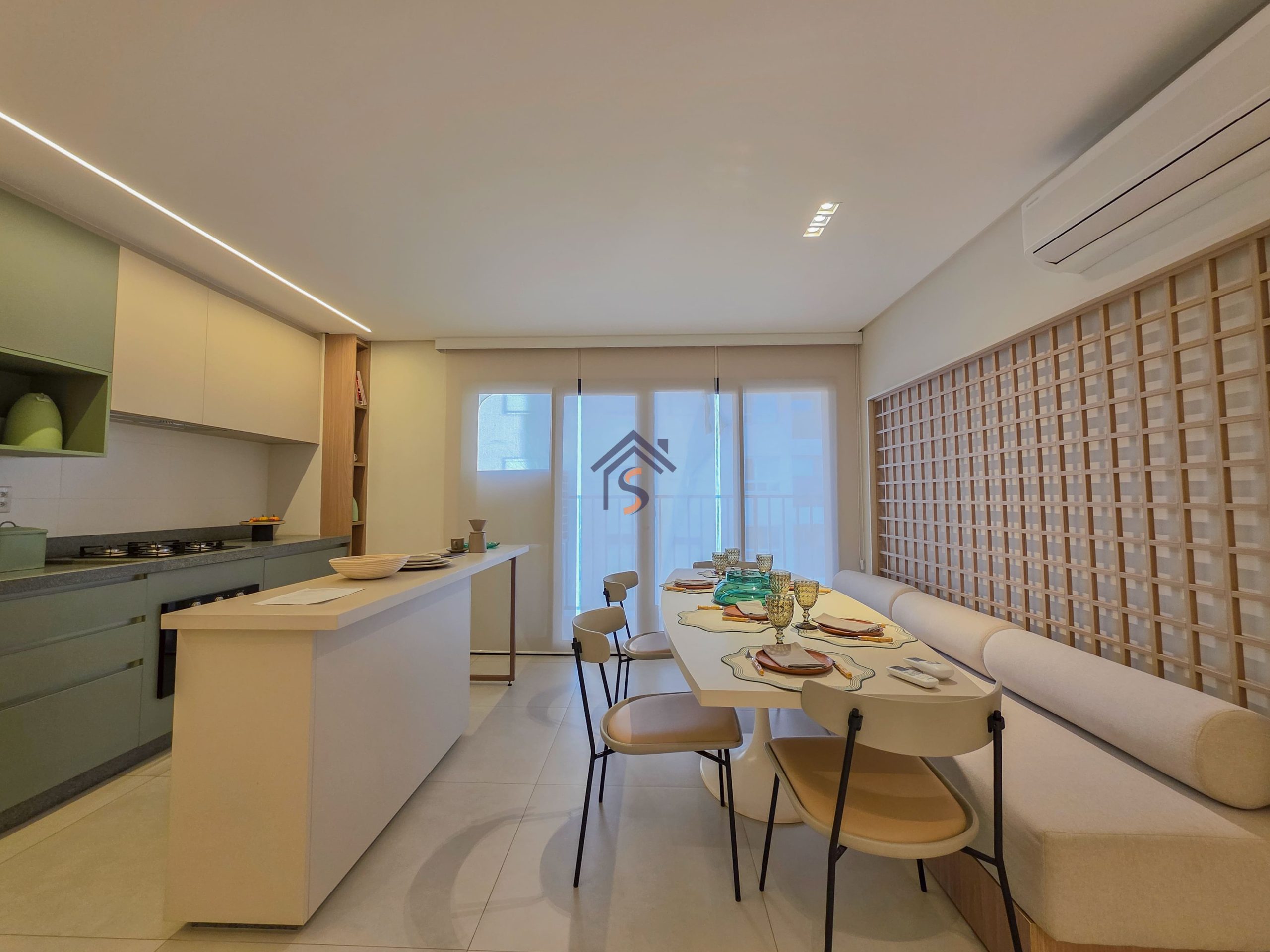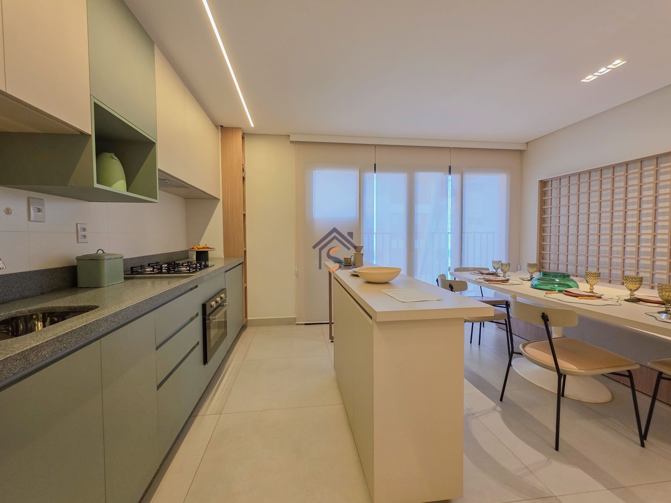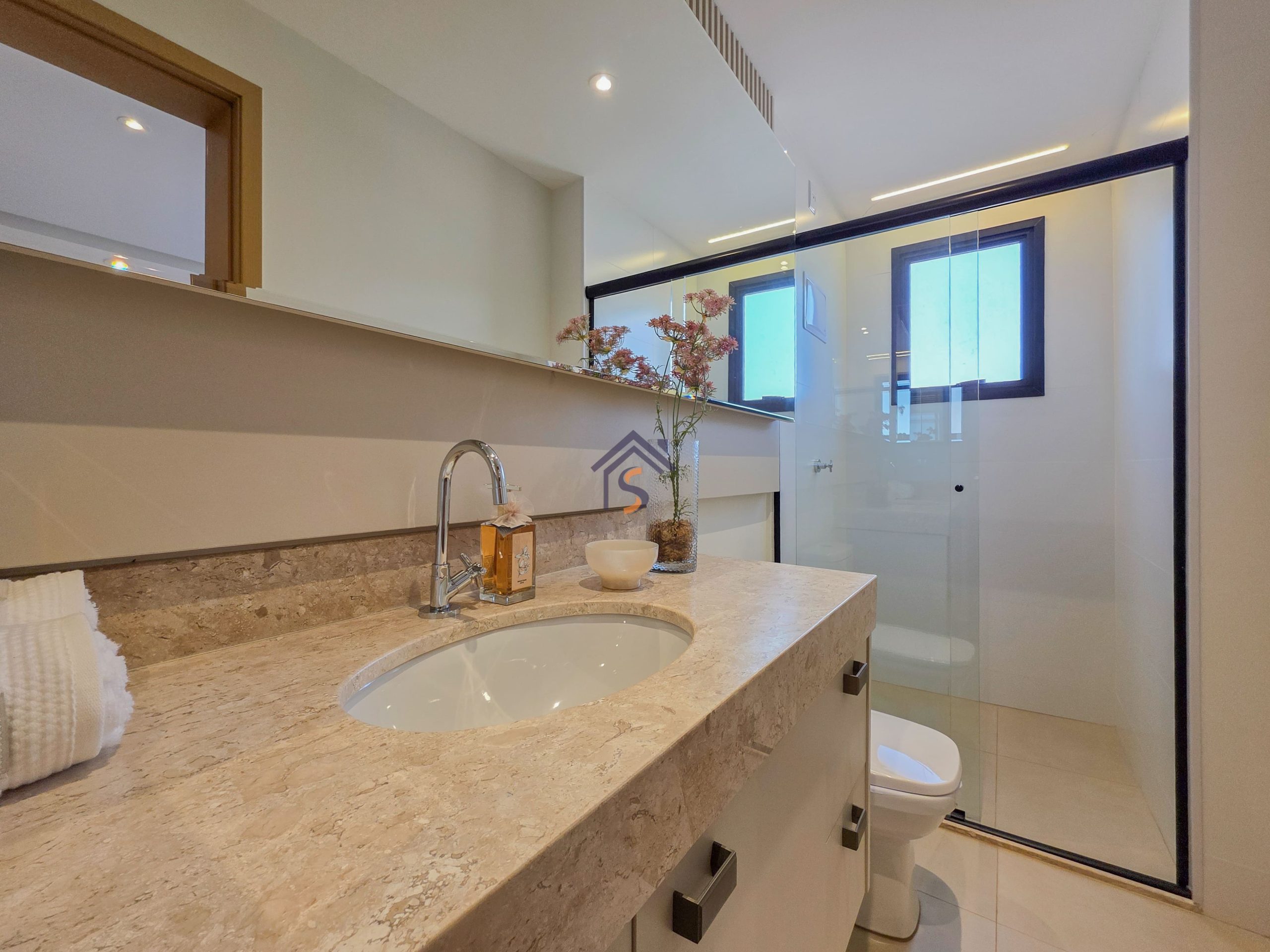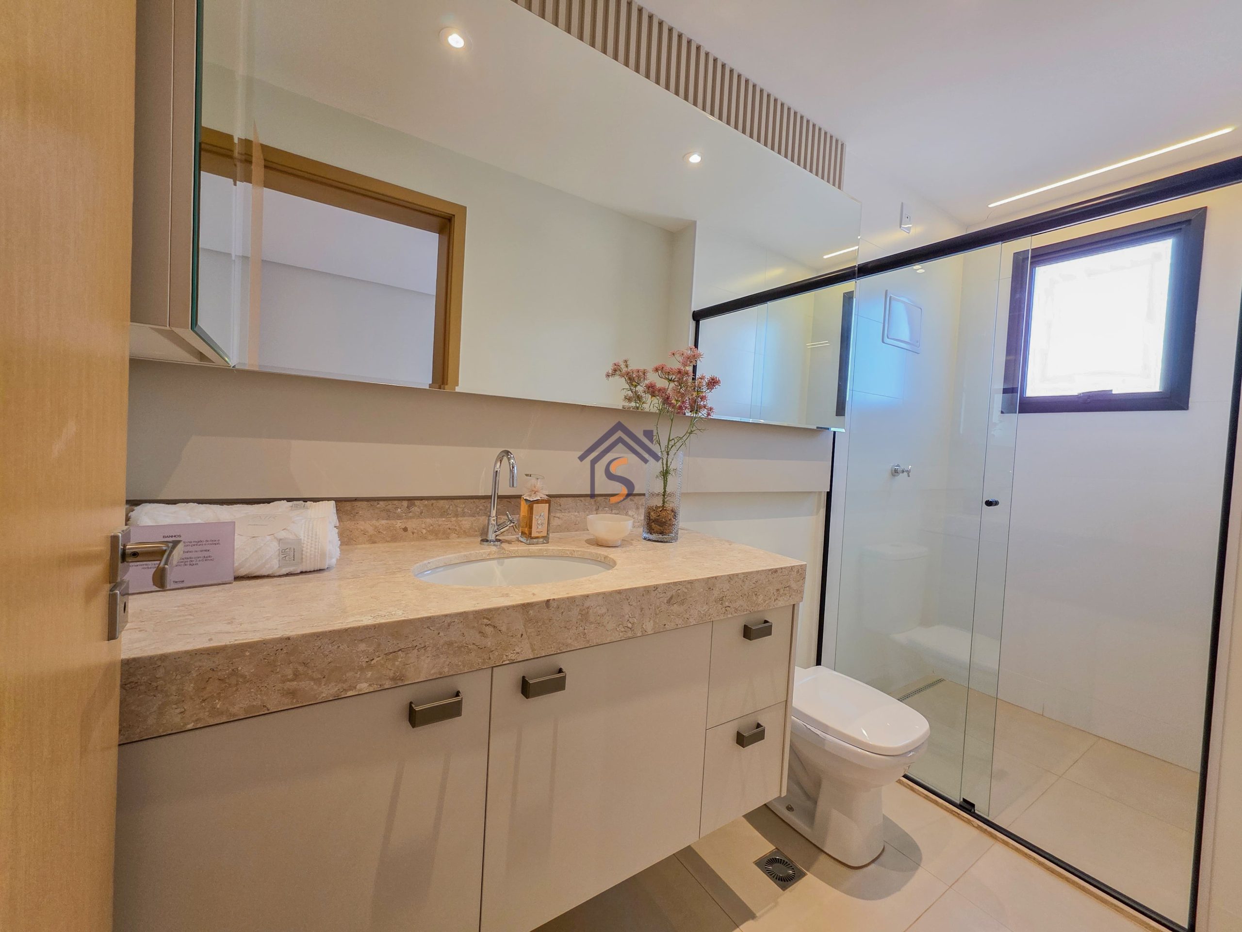 Acabamento diferenciado, com piso em porcelanato. A cozinha possui bancada em granito cinza andorinha escovado, balcão integrado a sala, o lavabo conta com bancada e banhos em mármore bege bahia, rodapés embutidos, previsão de ponto de gás para churrasqueira, esquadria da suíte máster com janela balcão e veneziana integrada, além de infraestrutura para ar-condicionado, mantendo o mesmo padrão de elegância nos acabamentos.