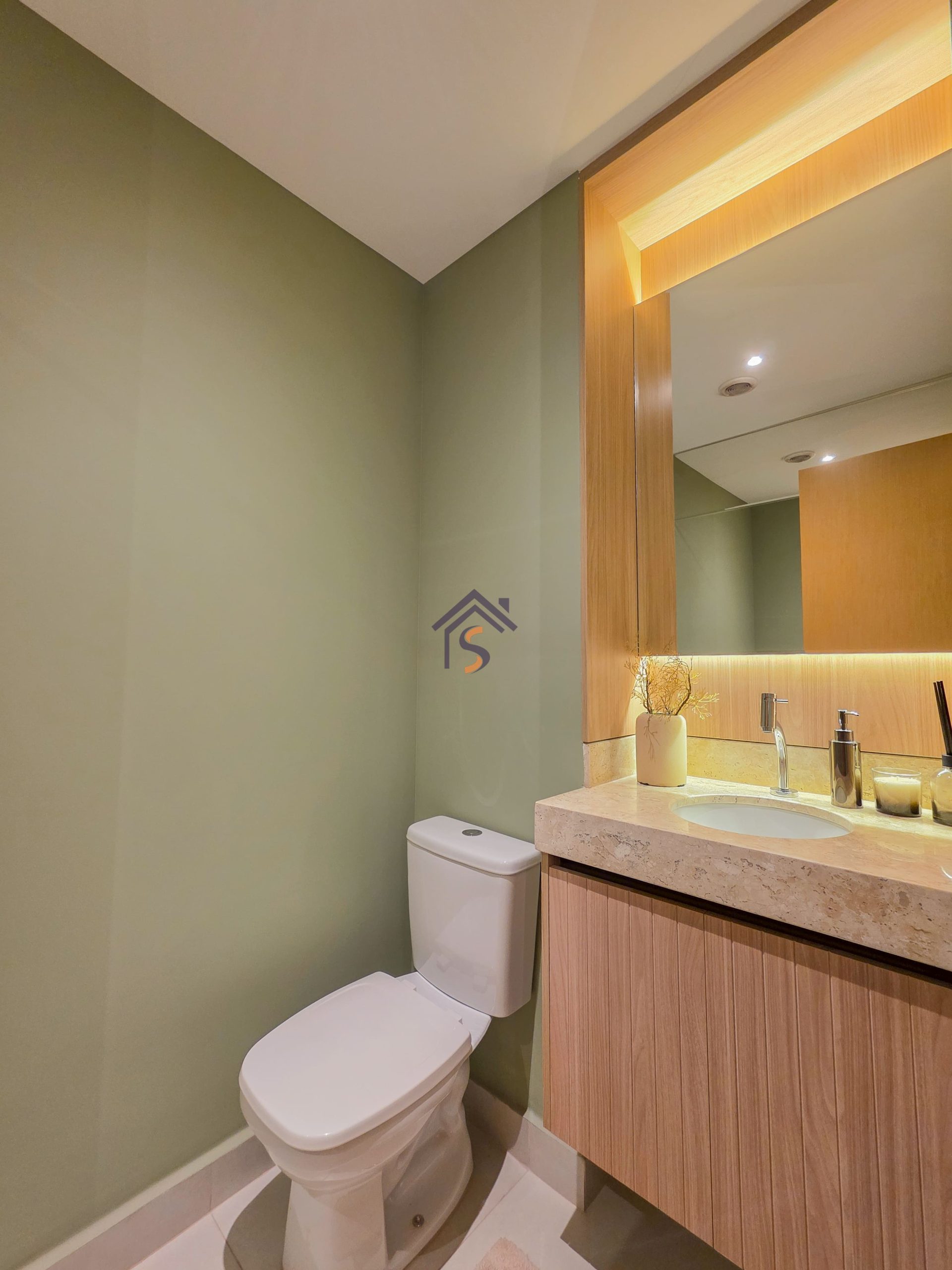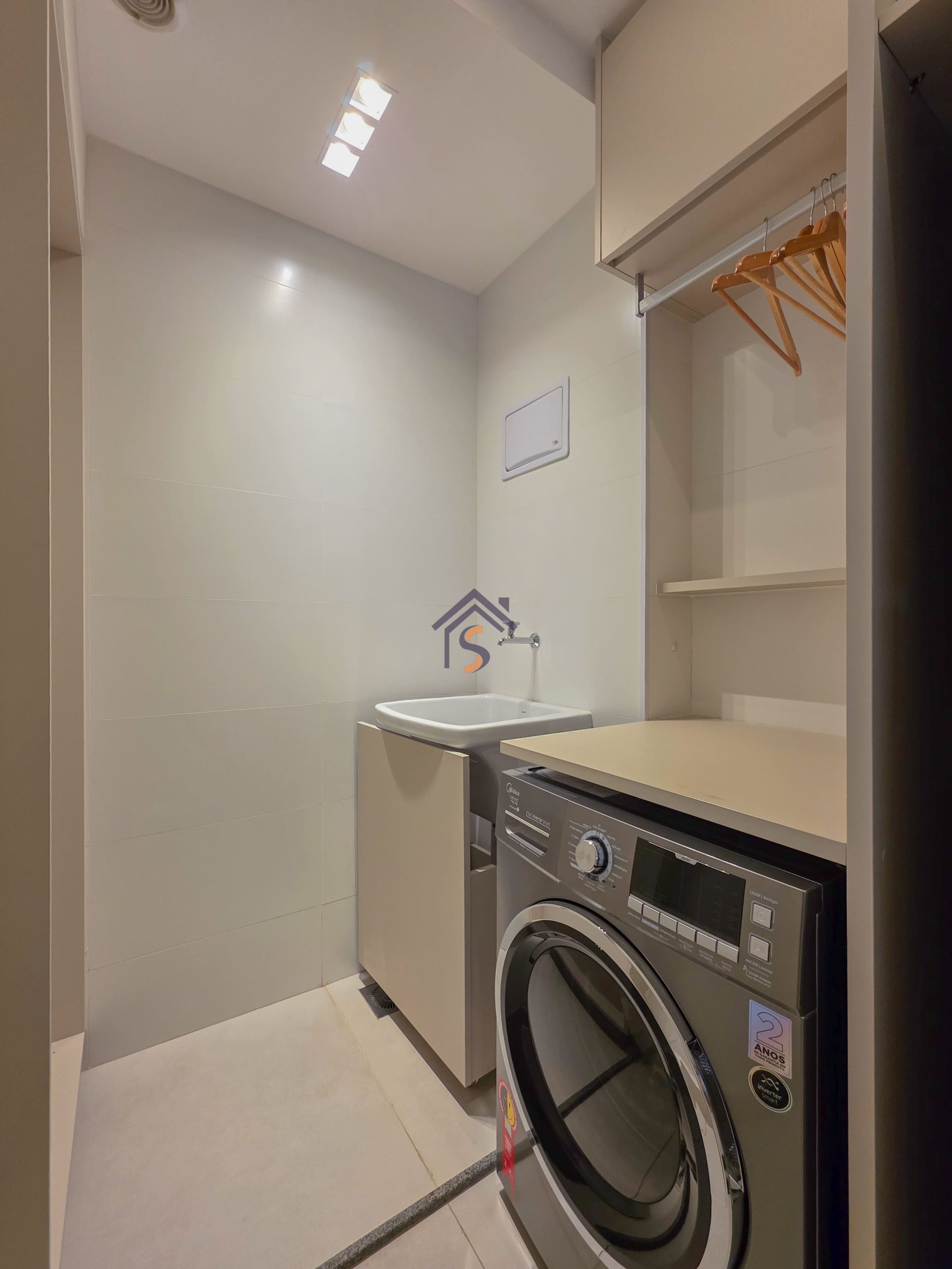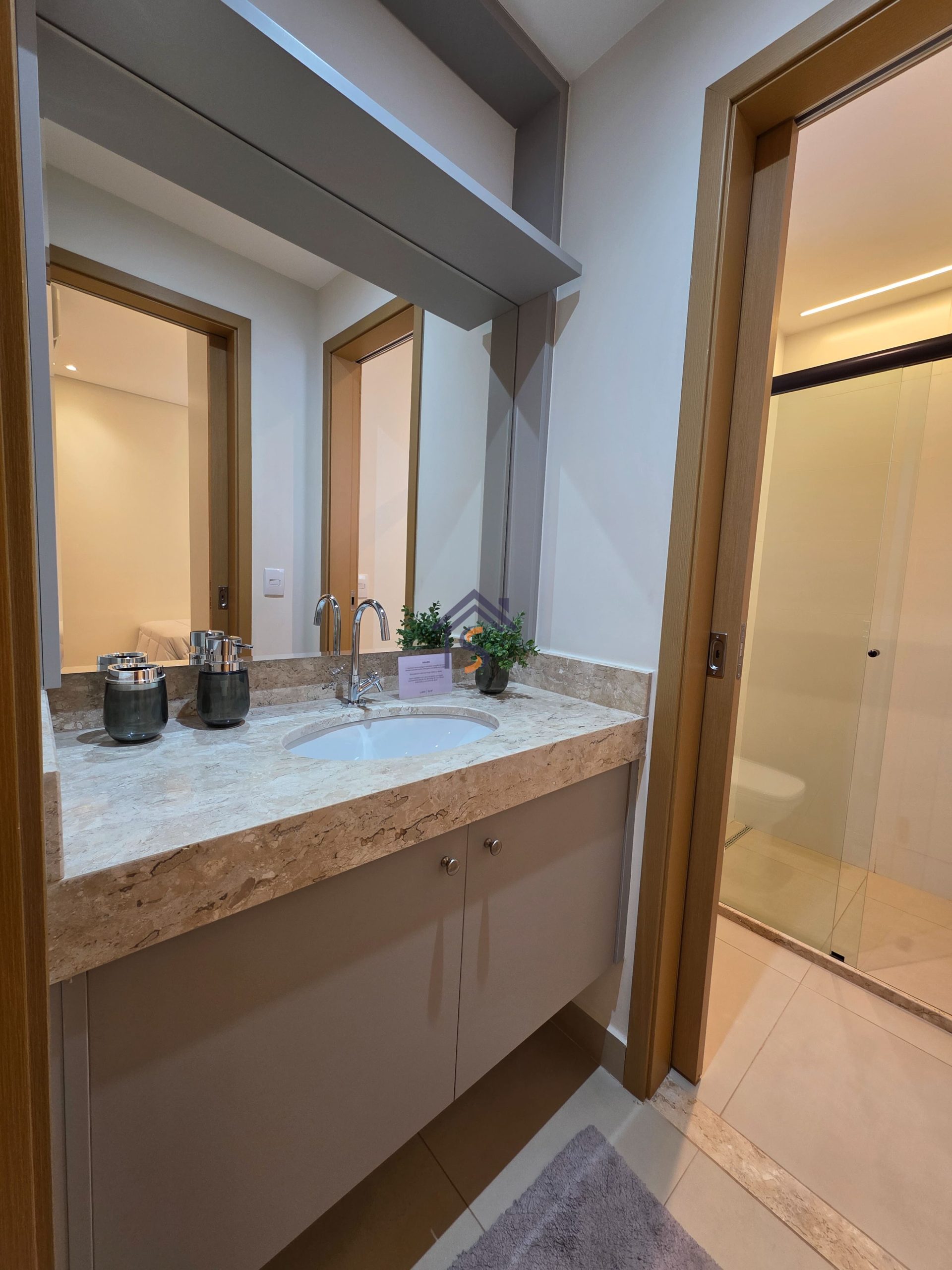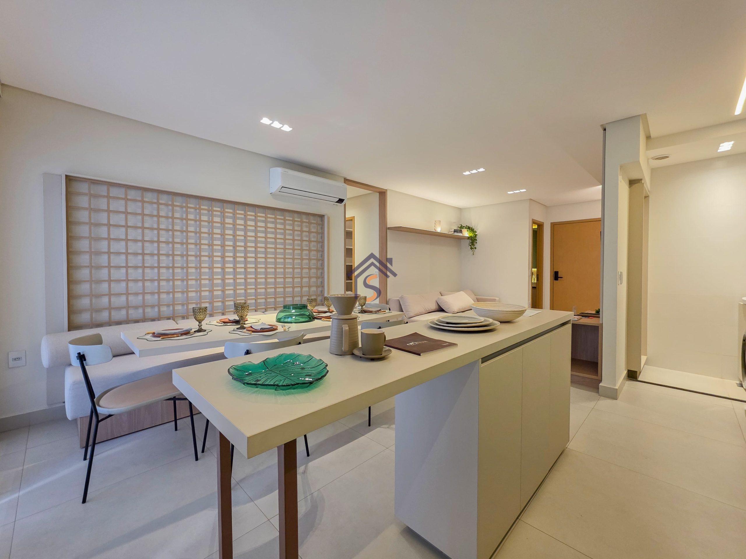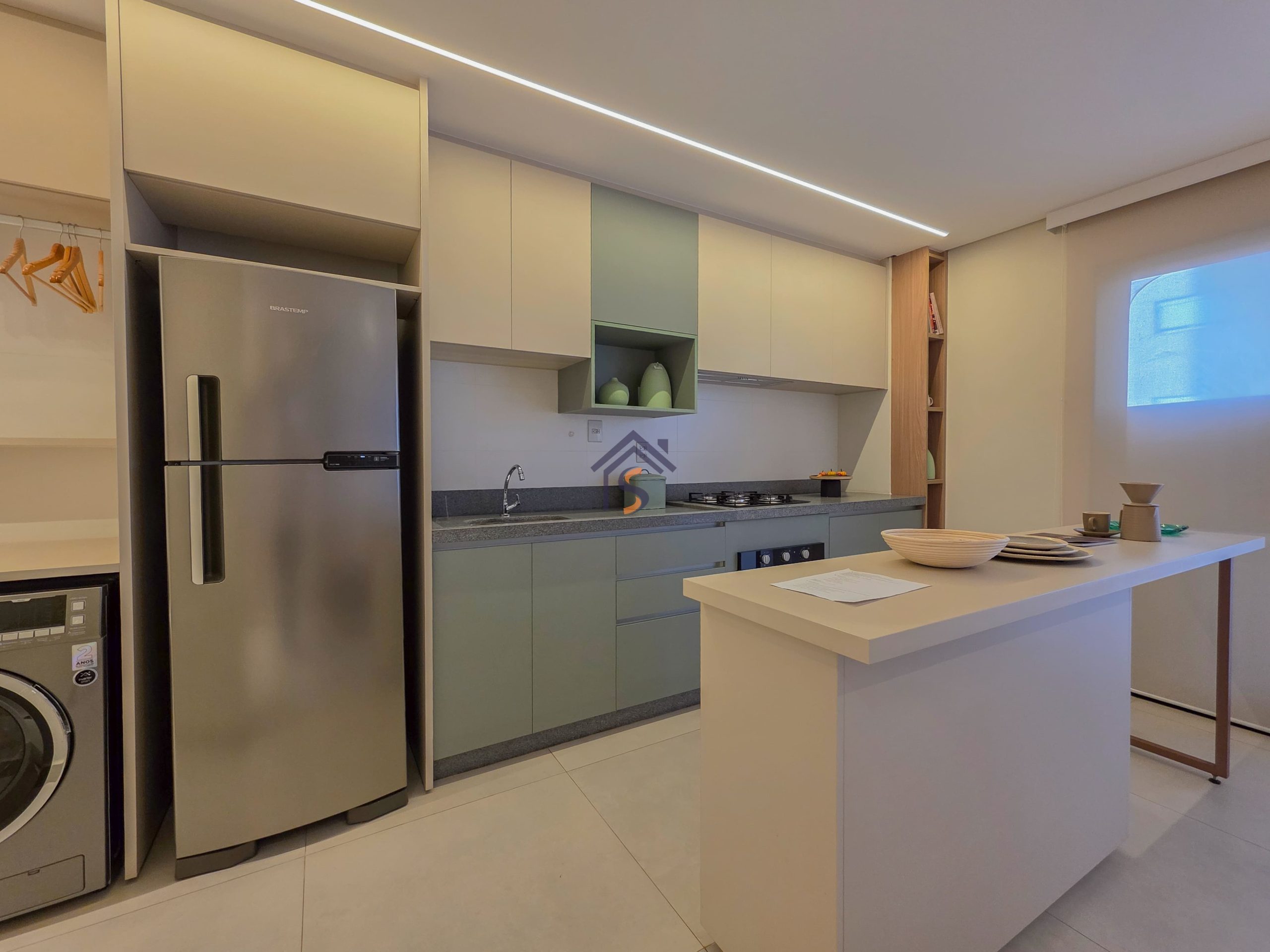 Acabamento diferenciado, com piso em porcelanato. A cozinha possui bancada em granito cinza andorinha escovado, balcão integrado a sala, o lavabo conta com bancada e banhos em mármore bege bahia, rodapés embutidos, previsão de ponto de gás para churrasqueira, esquadria da suíte máster com janela balcão e veneziana integrada, além de infraestrutura para ar-condicionado, mantendo o mesmo padrão de elegância nos acabamentos.