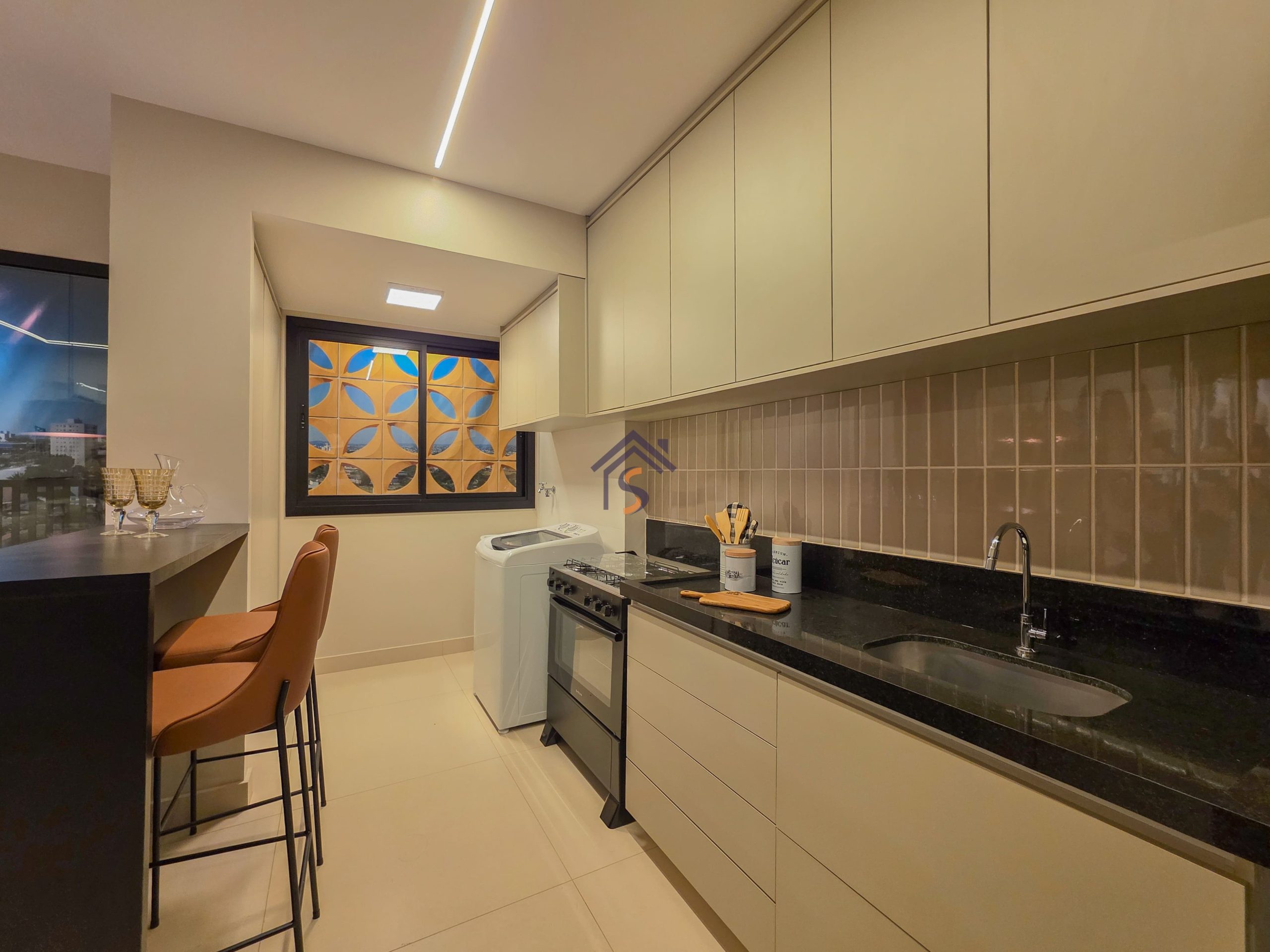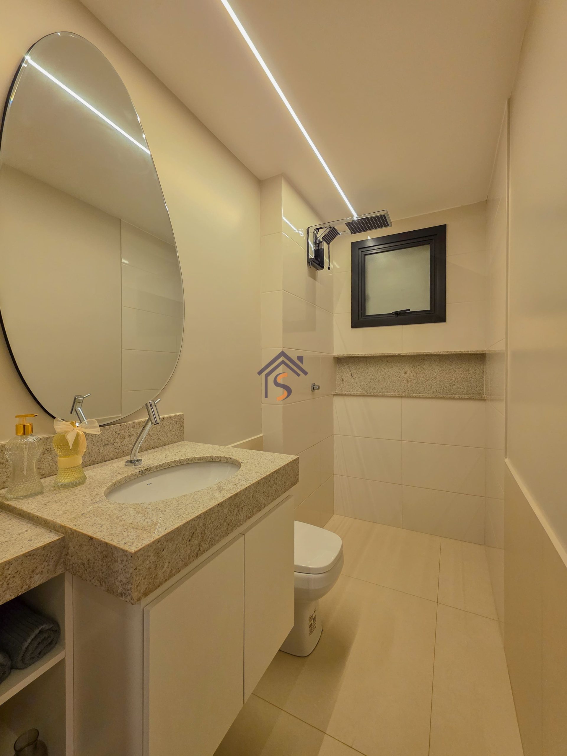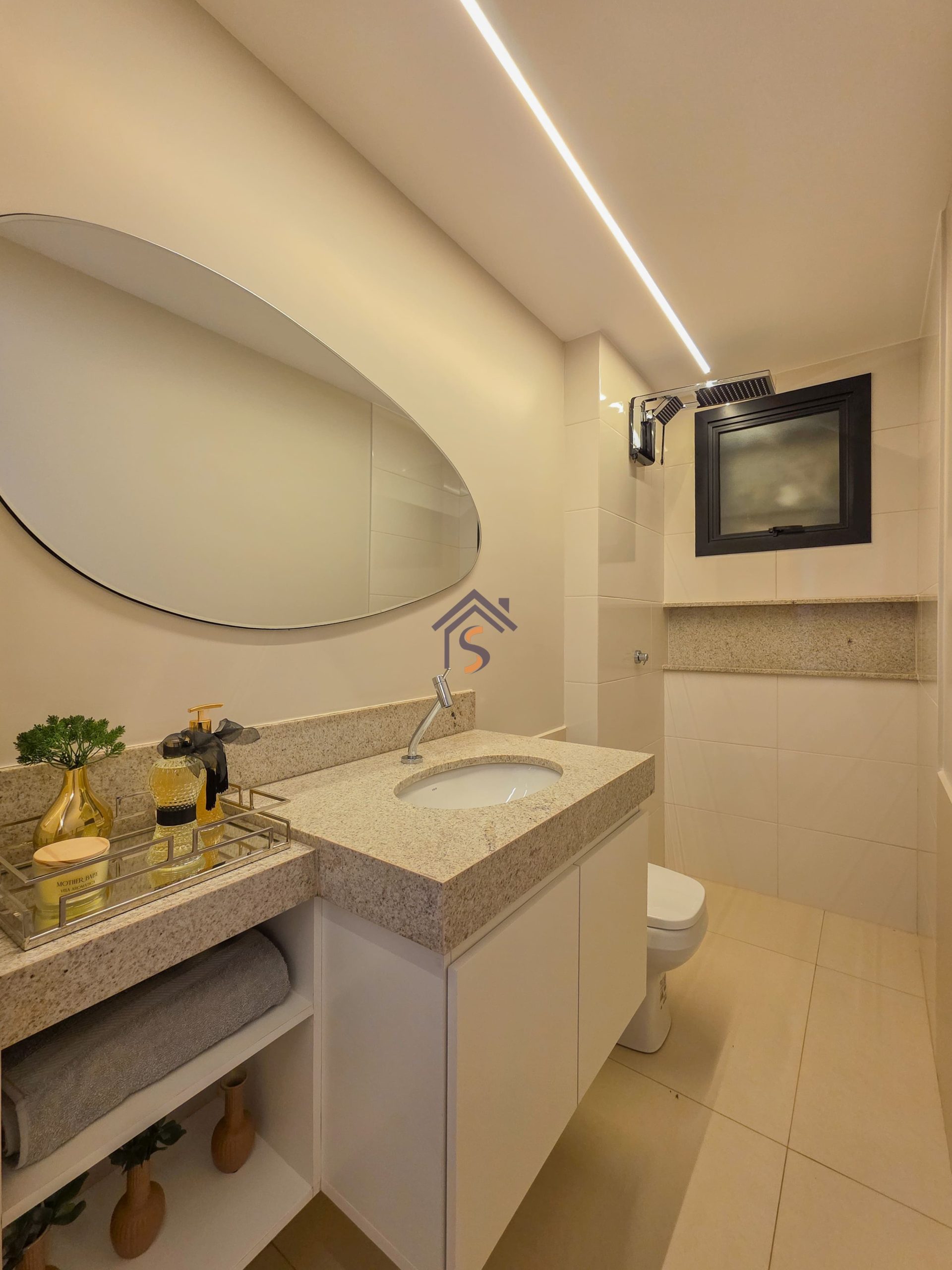 Acabamento diferenciado com porcelanato acetinado 84×84 cm, e, infraestrutura para ar-condicionado, bancadas em granito, banheiro com nichos em granito, ponto elétrico para churrasqueira na sacada mantendo o mesmo padrão de elegância nos acabamentos.