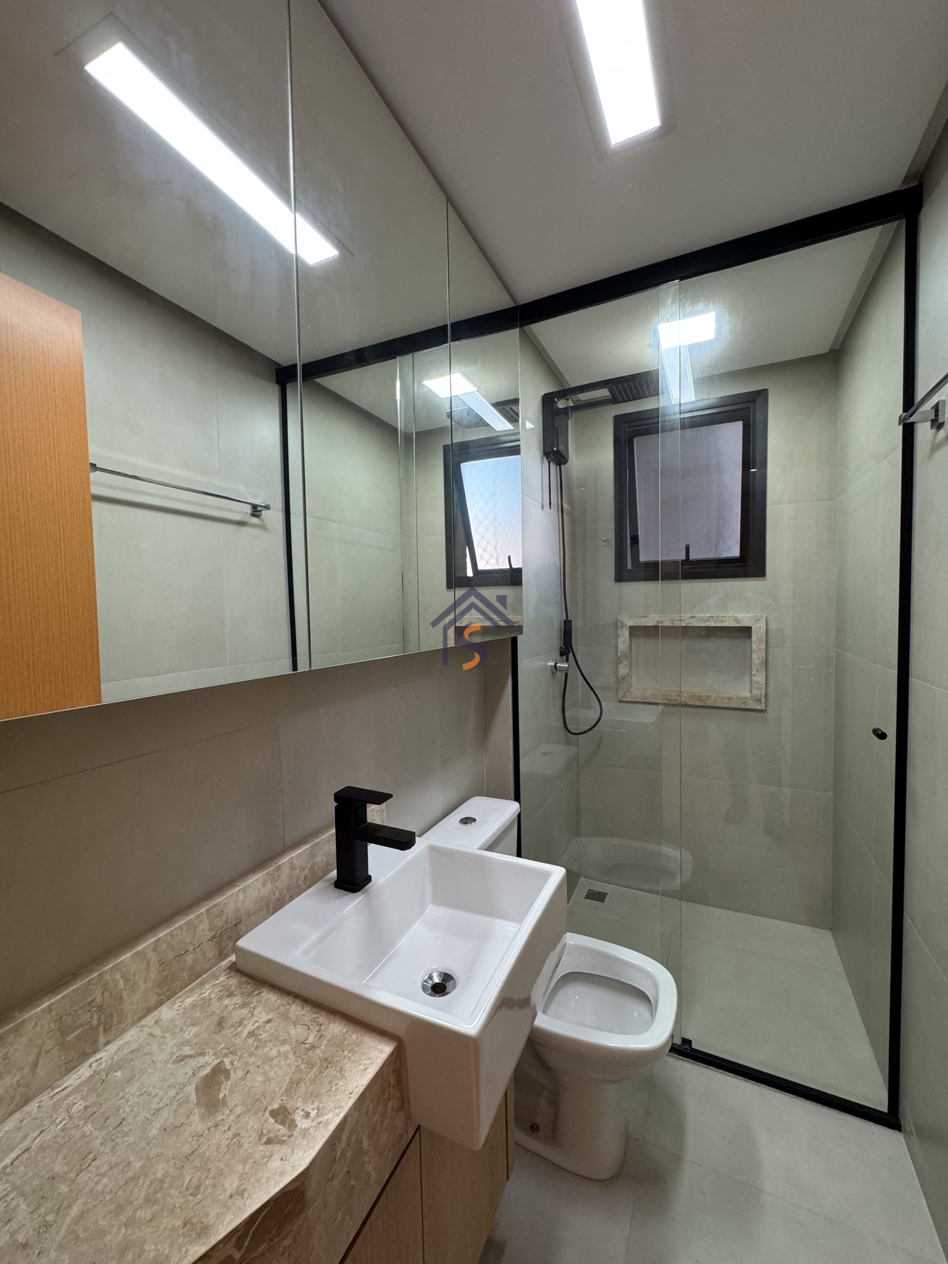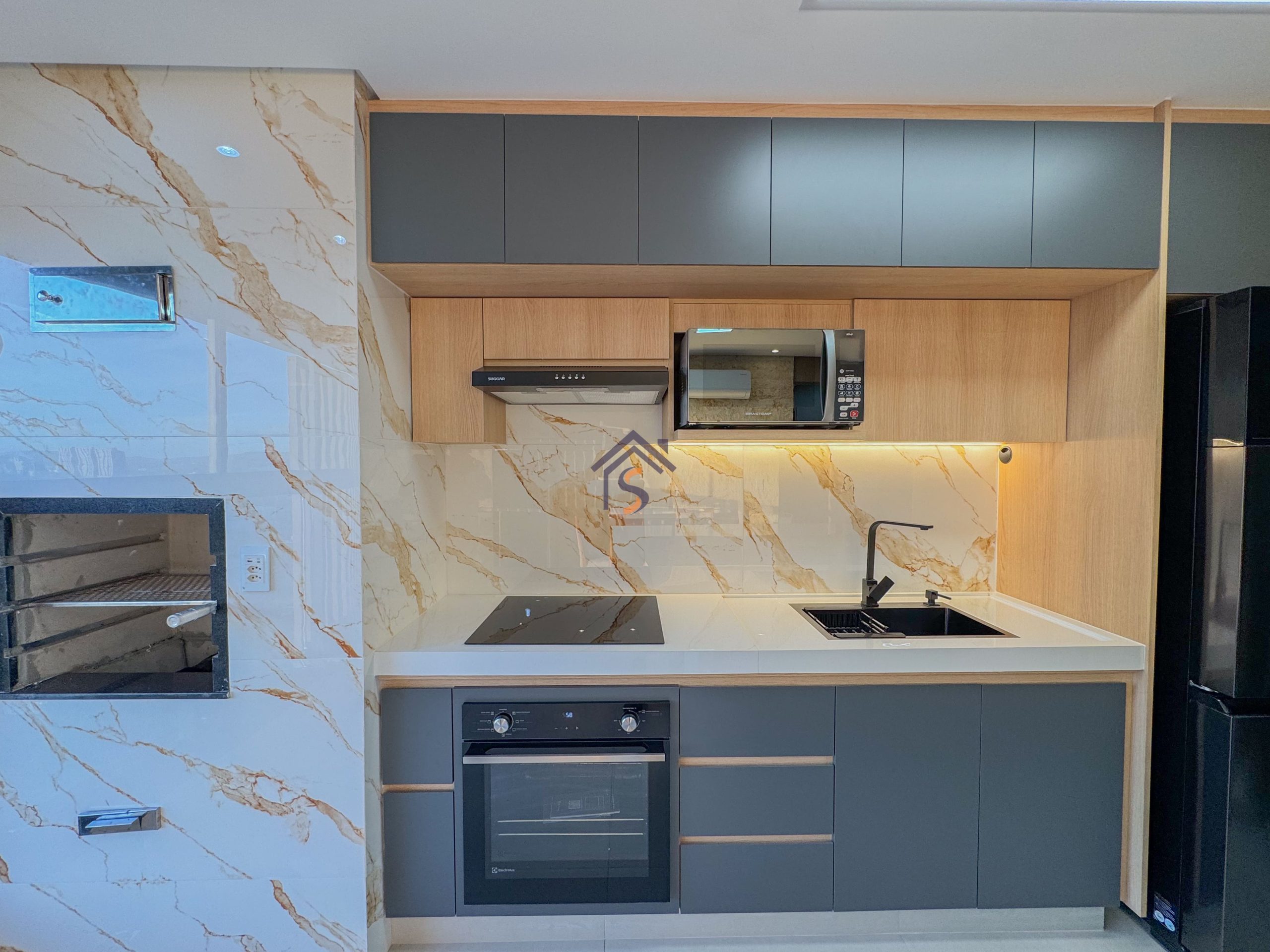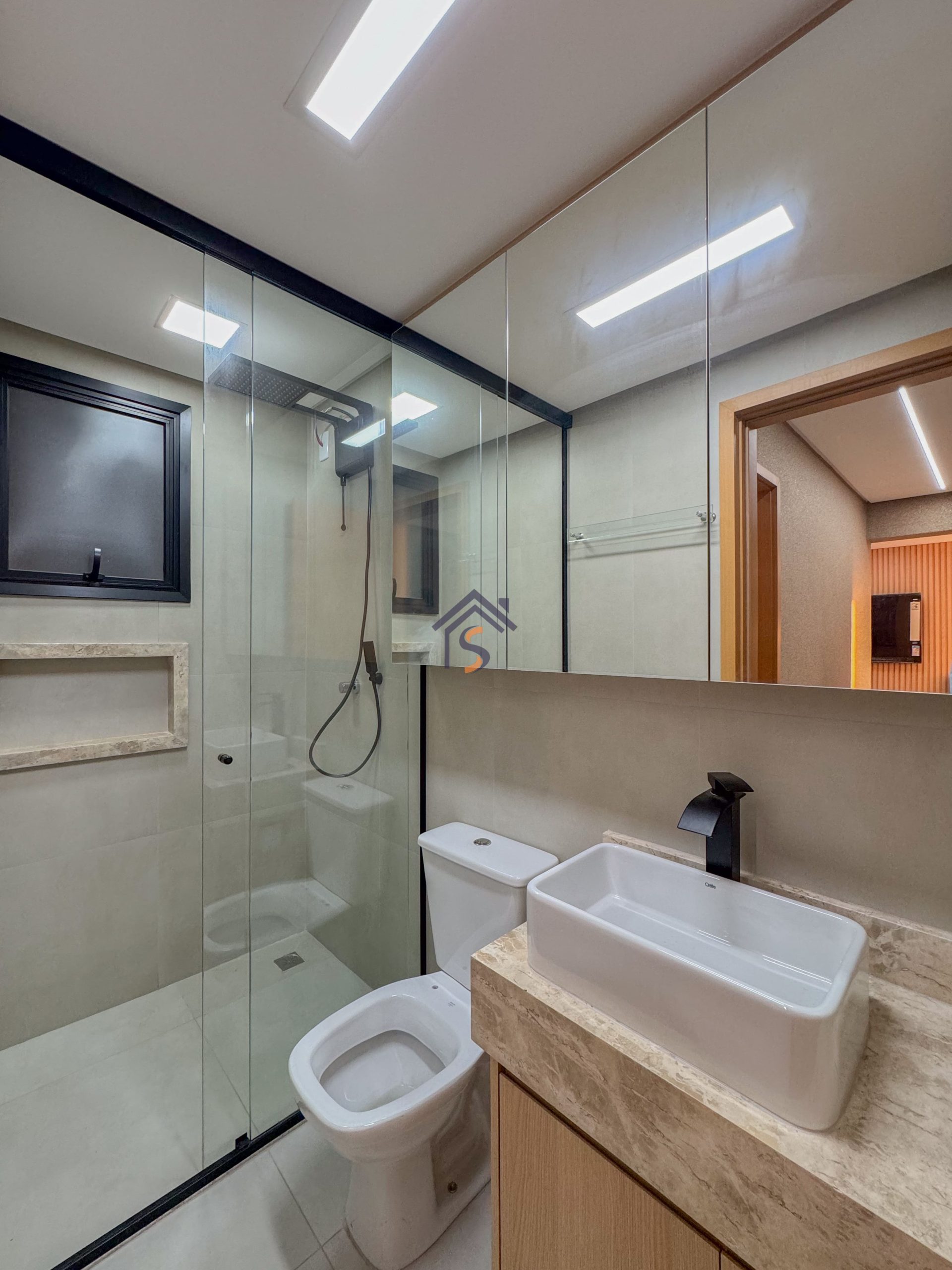 Acabamento diferenciado com porcelanato 90×90 cm, esquadrias em alumínio com venezianas, rede frigorígena instalada nos quartos e na sala, fogão em ilha e bancada em granito Preto São Gabriel, além de ponto de gás extra na cozinha. O banheiro social traz cuba de sobrepor com torneira de bica alta e detalhes em mármore Bege Bahia. Na suíte máster, a cuba é de semi encaixe, mantendo o mesmo padrão de elegância nos acabamentos.