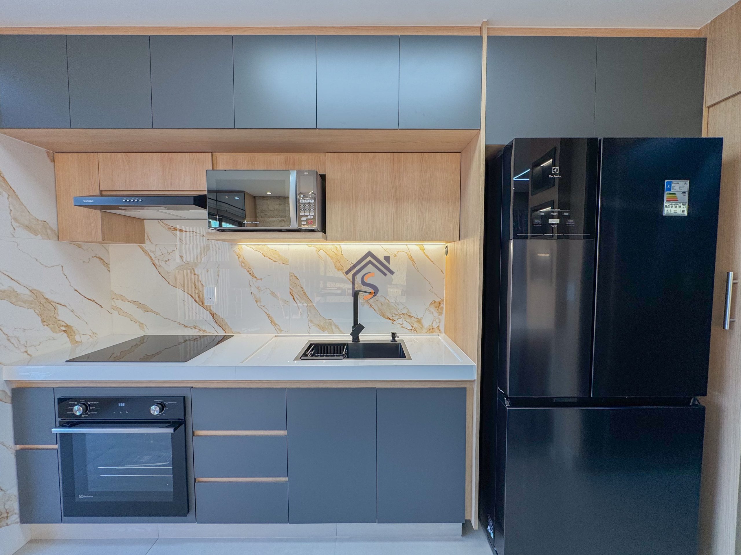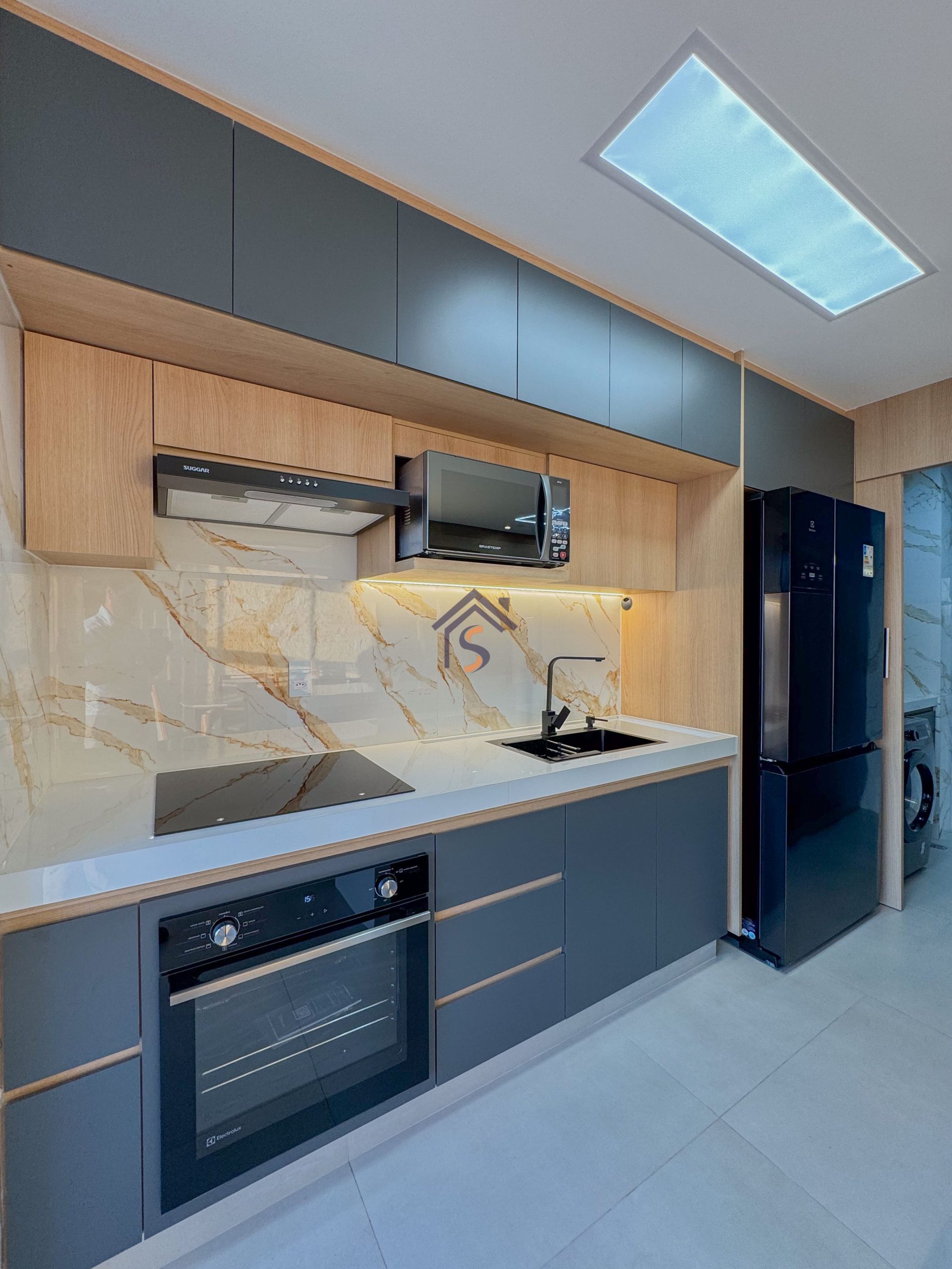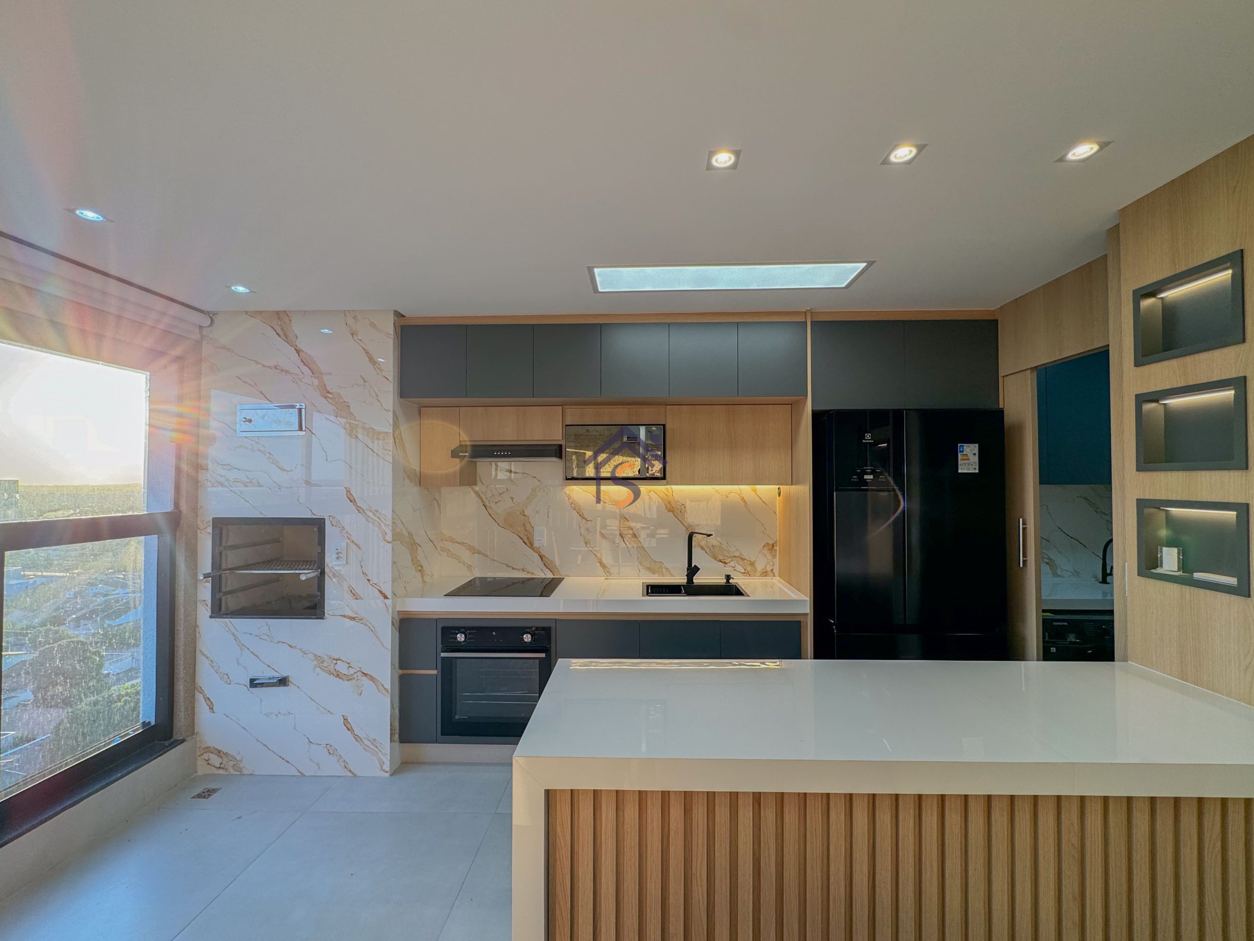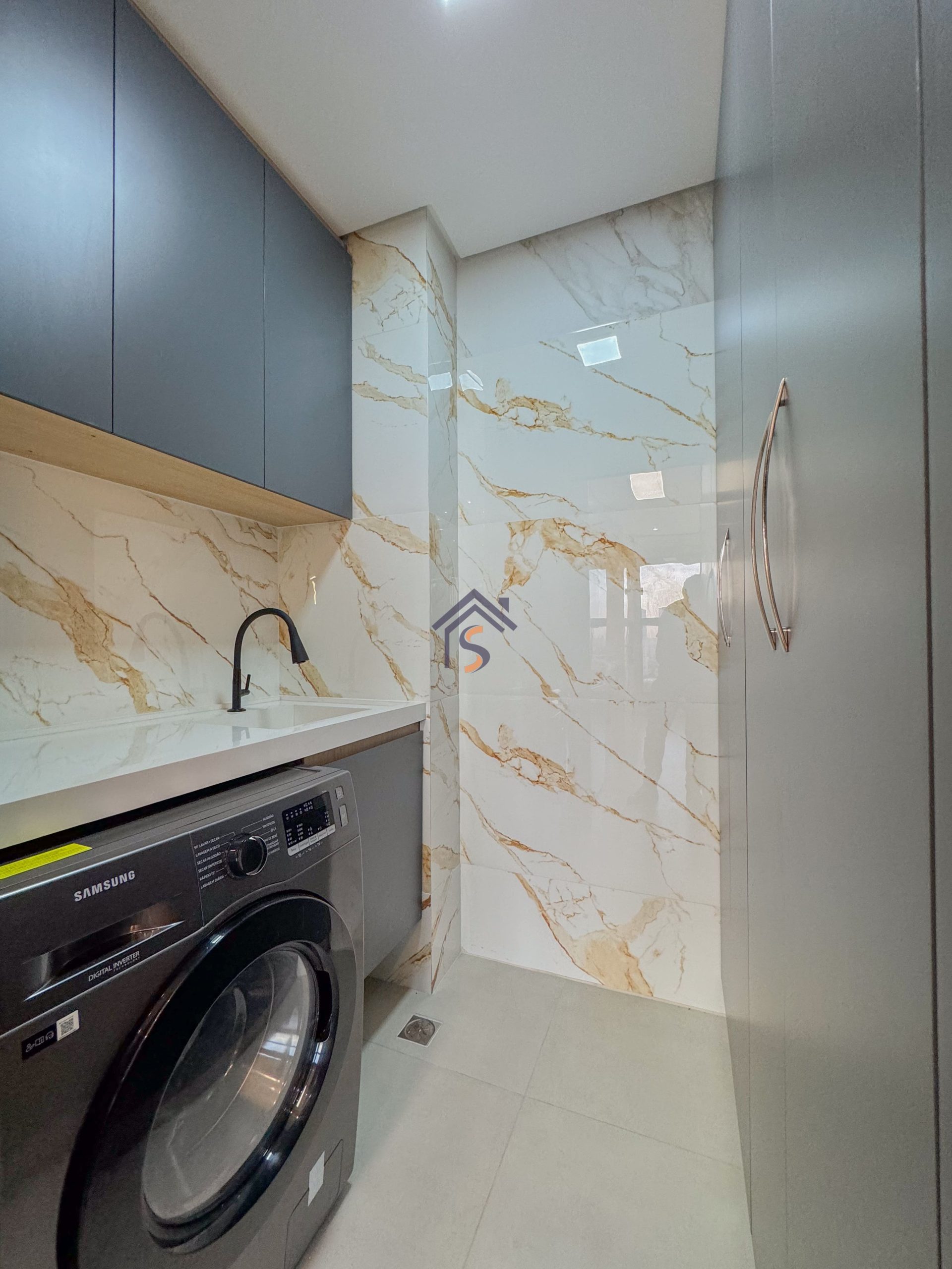Acabamento diferenciado com porcelanato 90×90 cm, esquadrias em alumínio com venezianas, rede frigorígena instalada nos quartos e na sala, fogão em ilha e bancada em granito Preto São Gabriel, além de ponto de gás extra na cozinha. O banheiro social traz cuba de sobrepor com torneira de bica alta e detalhes em mármore Bege Bahia. Na suíte máster, a cuba é de semi encaixe, mantendo o mesmo padrão de elegância nos acabamentos.