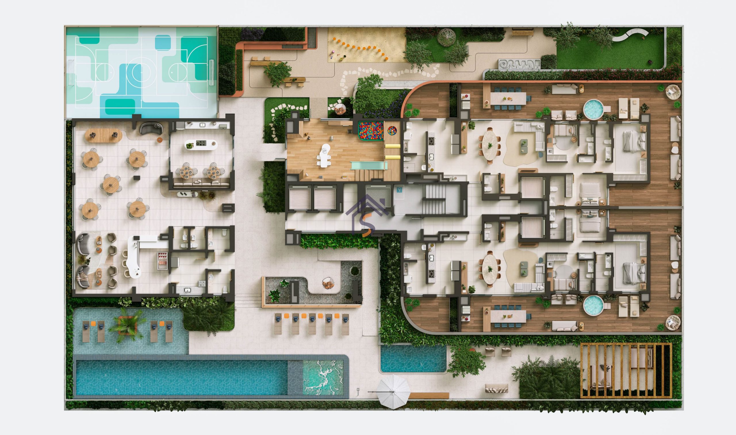 Acabamento diferenciado, com fechadura Digital, ponto de água na geladeira, irrigação automatizada das floreiras da área privativa, ralo linear nos banhos e varandas, persiana integrada nas suítes, sendo motorizada na suíte master, tomada USB-C nas suítes e livings. Serão previstos pontos (VDI) para sinais de voz, dados e imagens, bacias sanitárias dos apartamentos serão com acionamento duplo, a medição de água, gás e energia será individualizada, bancadas em mármore nos lavatórios, piso 90×90, banho 100% revestido.
