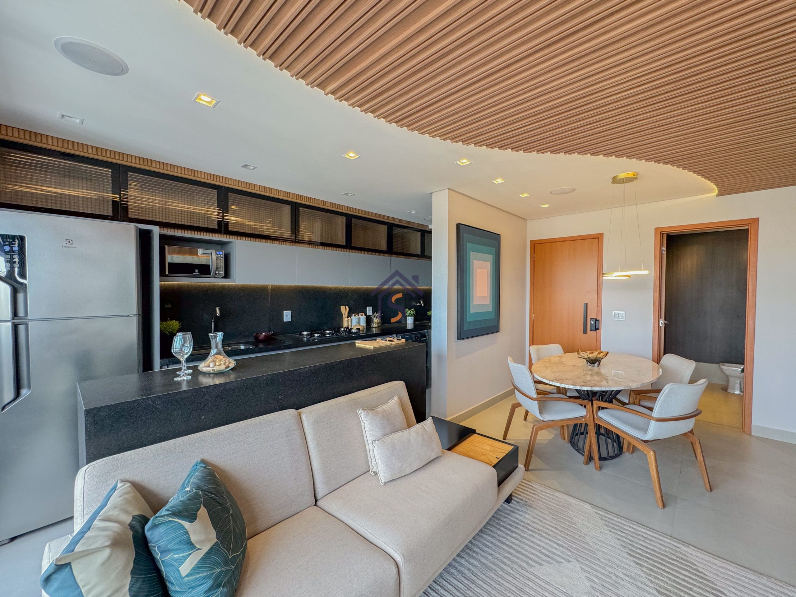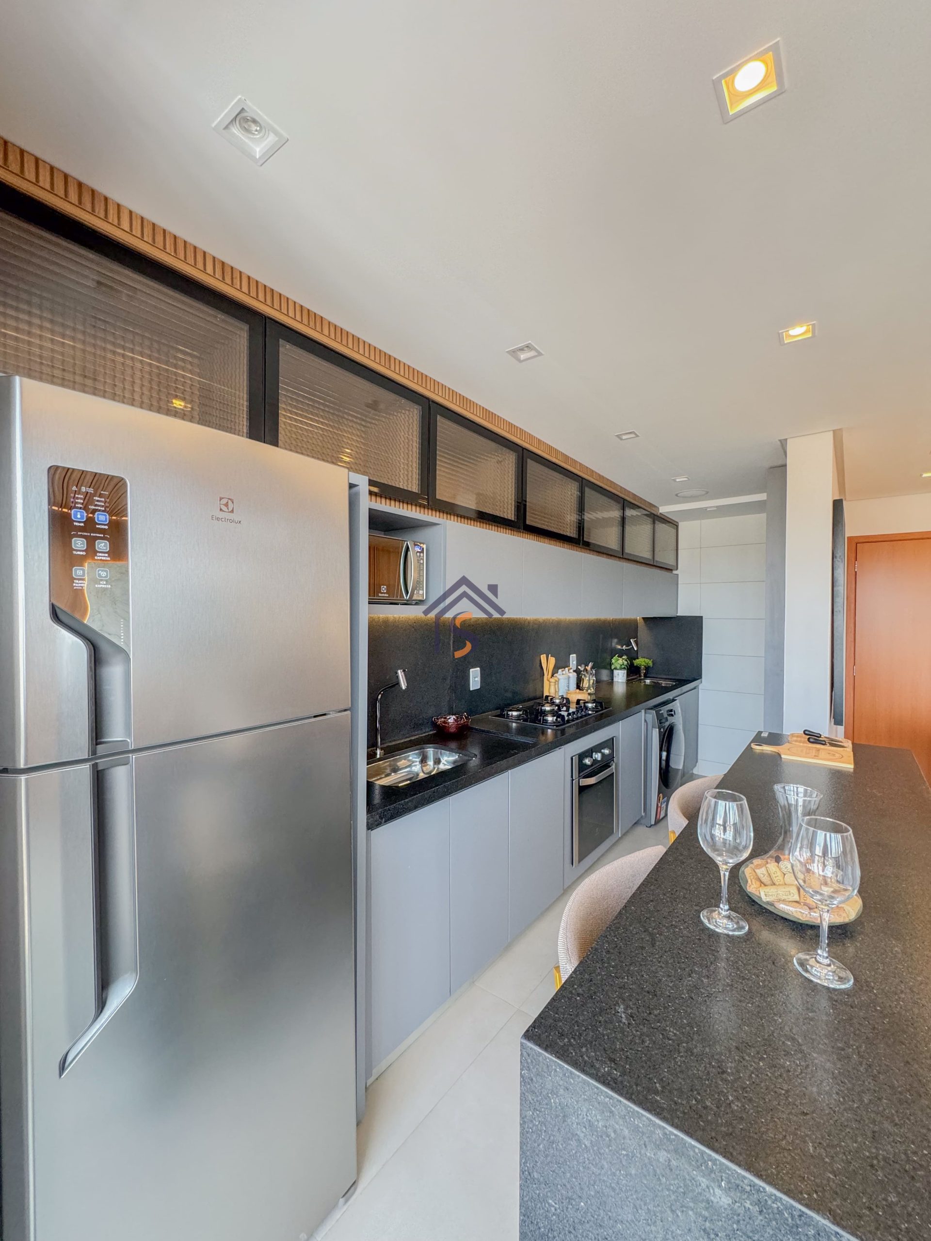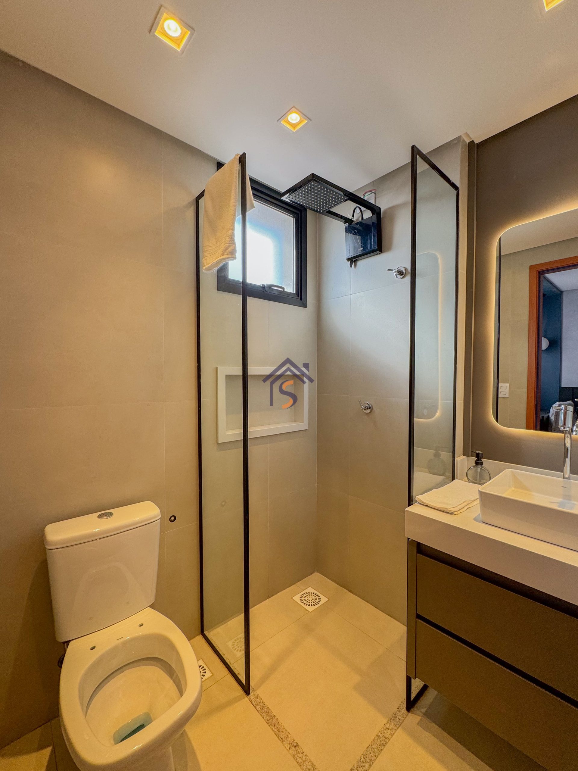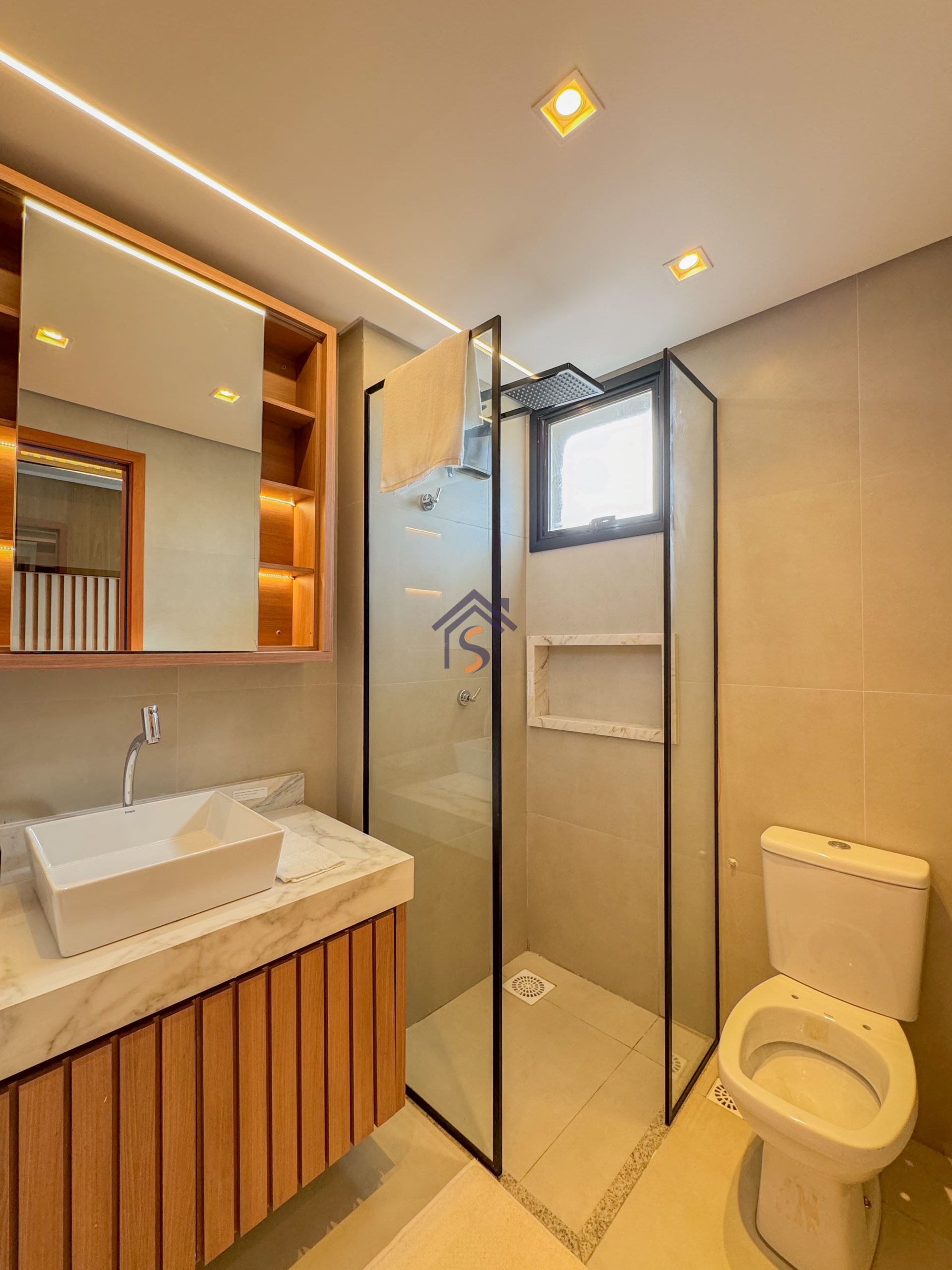 Acabamento diferenciado com fechadura digital, porcelanato acetinado 90×90 cm, bancadas dos banheiros e lavabos em granito Bege Bahia, bancada da cozinha e área de serviço em granito Branco Siena, esquadrias em alumínio preto com venezianas nos quartos, nichos nos banheiros com moldura em mármore Bege Bahia e forro rebaixado em todo o apartamento.