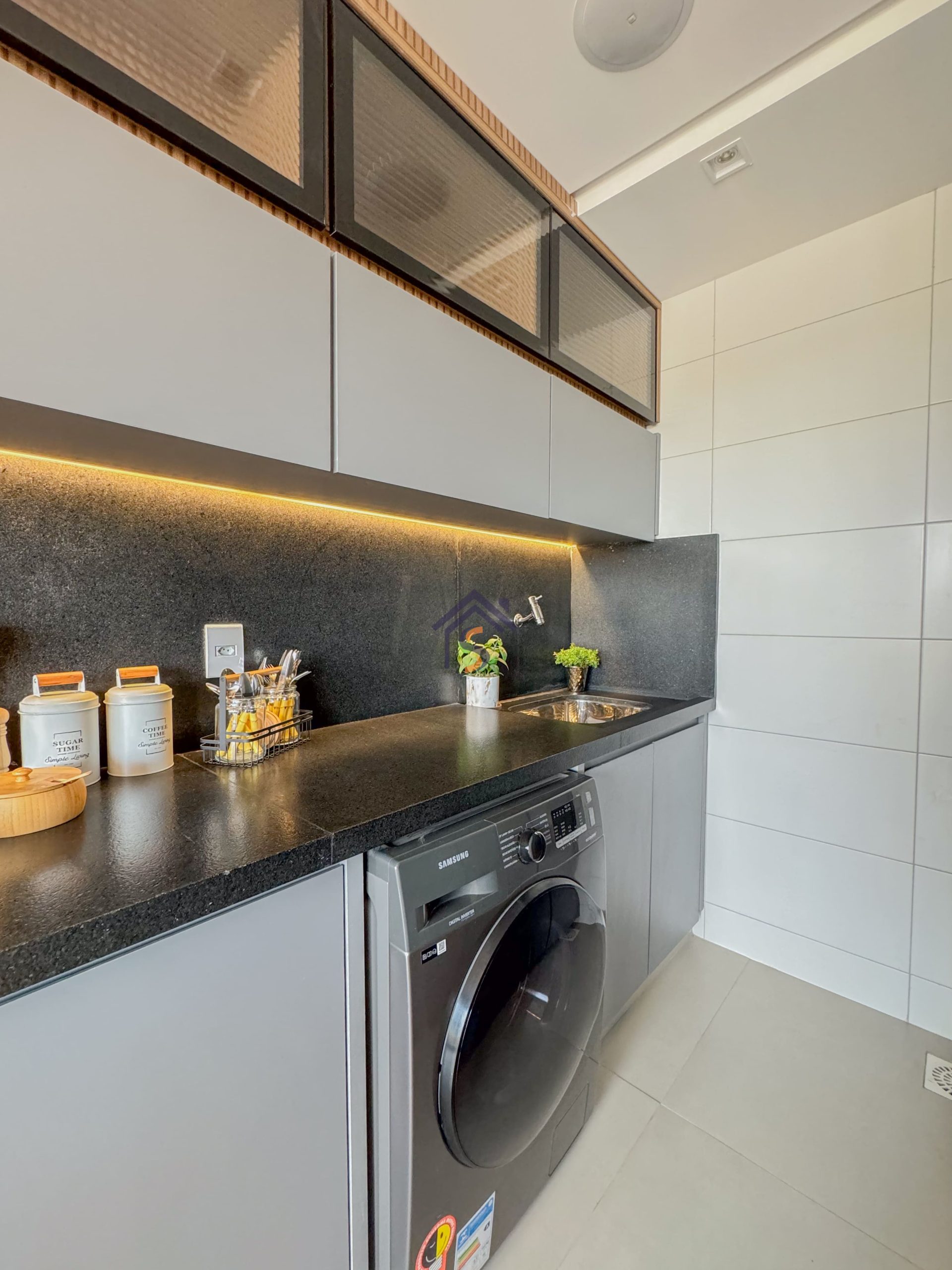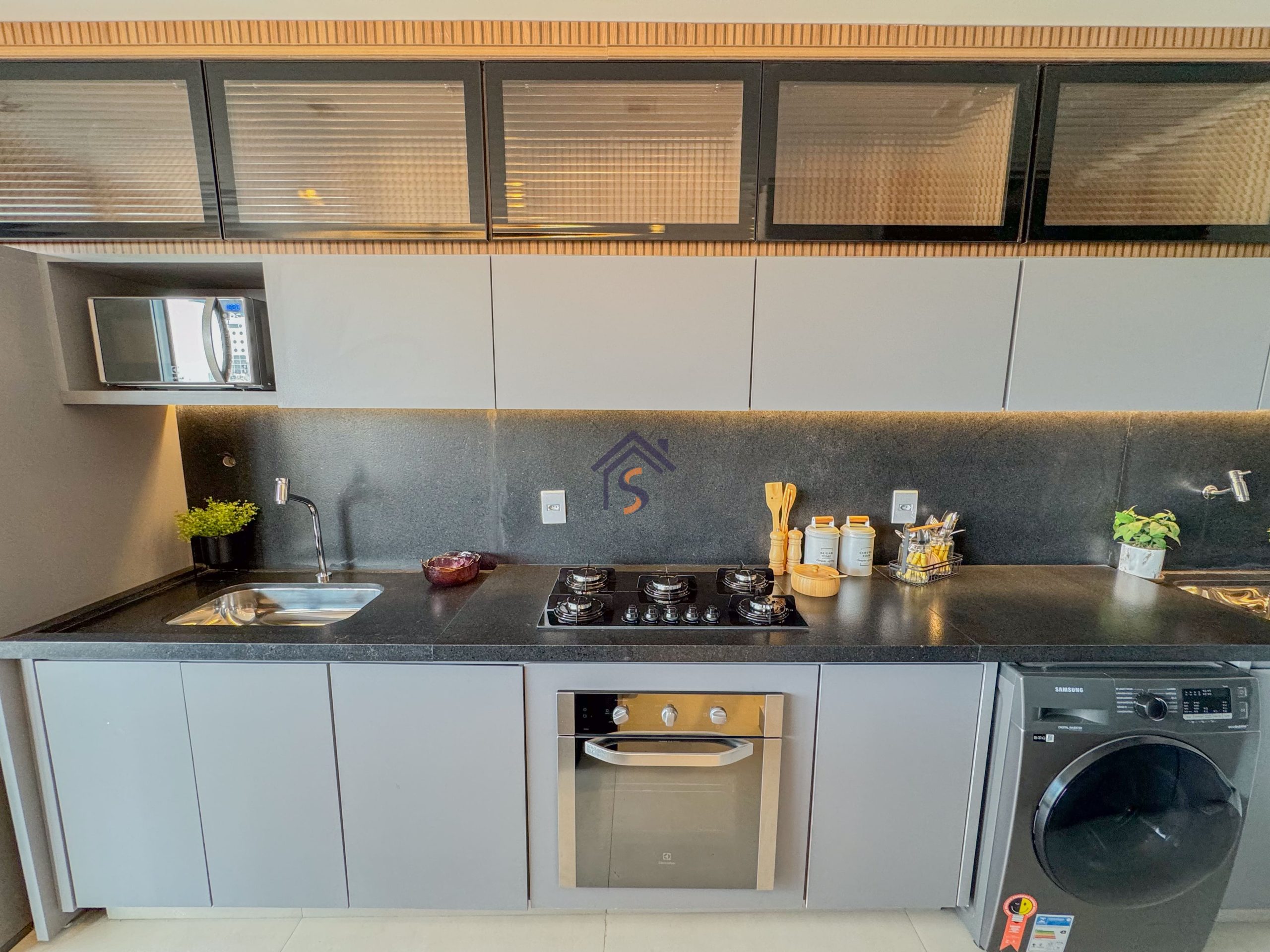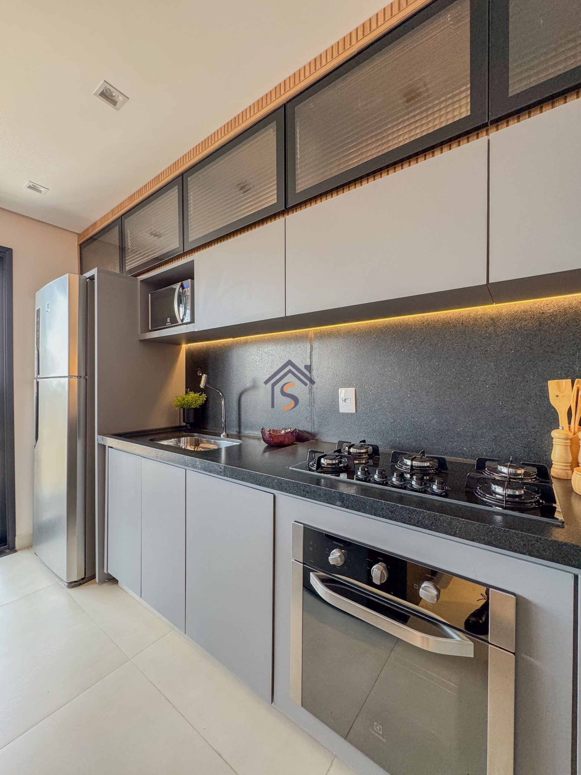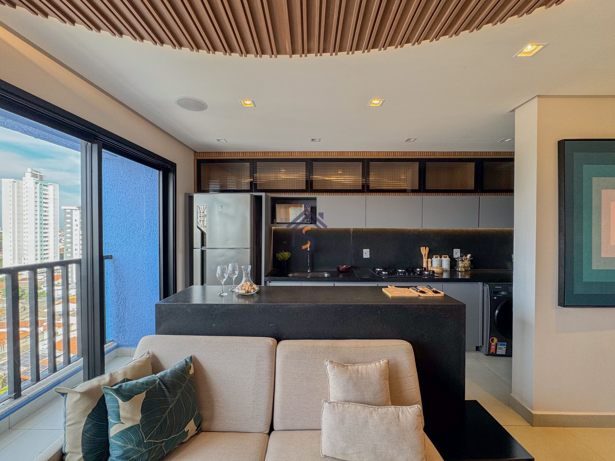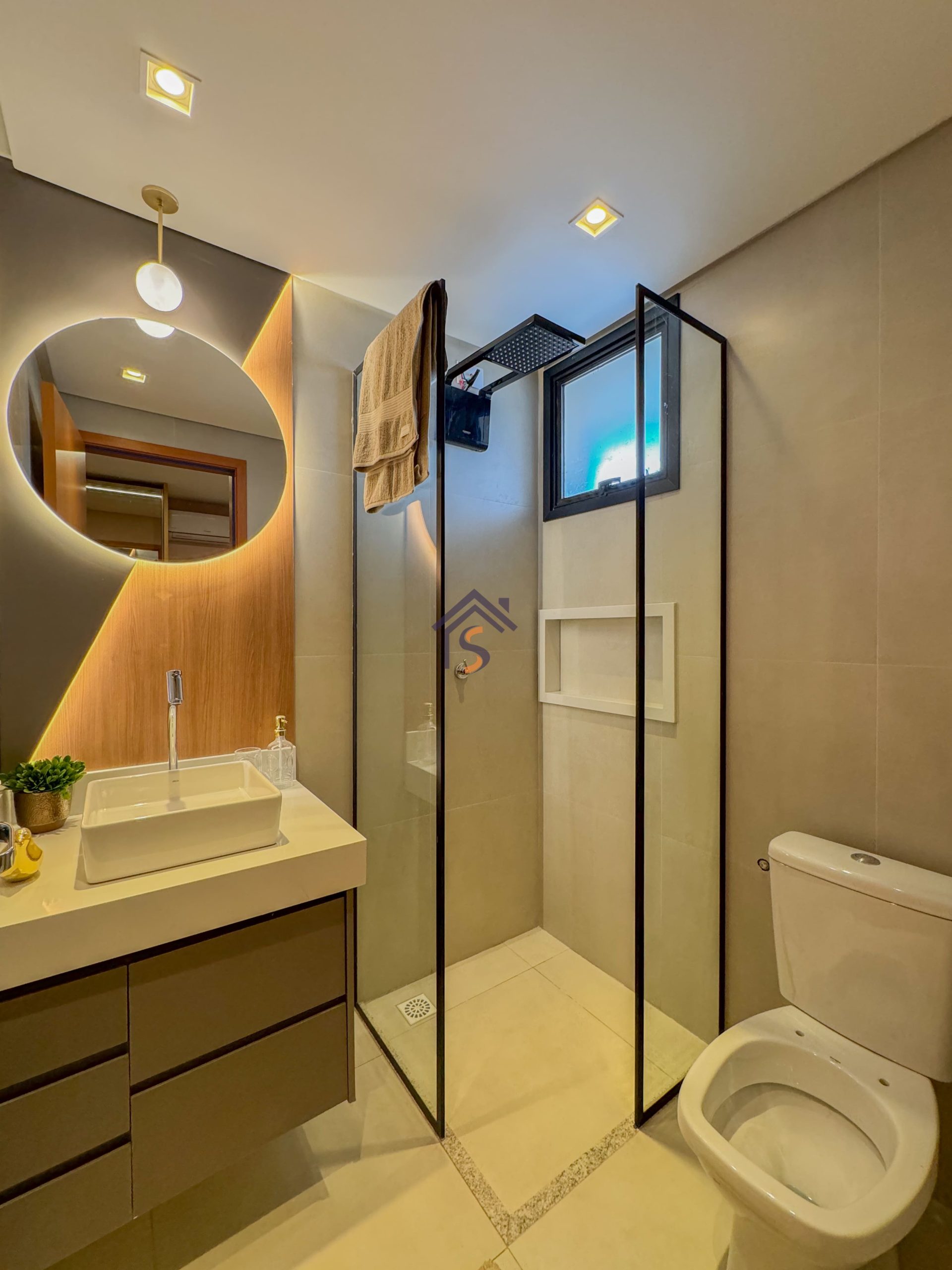 Acabamento diferenciado com fechadura digital, porcelanato acetinado 90×90 cm, bancadas dos banheiros e lavabos em granito Bege Bahia, bancada da cozinha e área de serviço em granito Branco Siena, esquadrias em alumínio preto com venezianas nos quartos, nichos nos banheiros com moldura em mármore Bege Bahia e forro rebaixado em todo o apartamento.