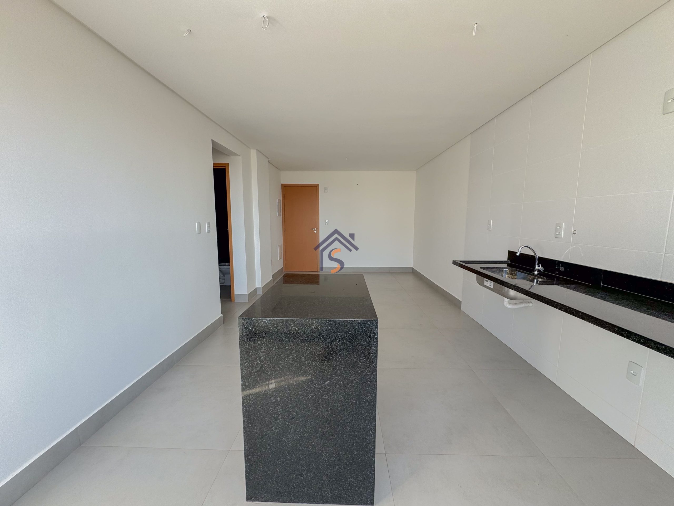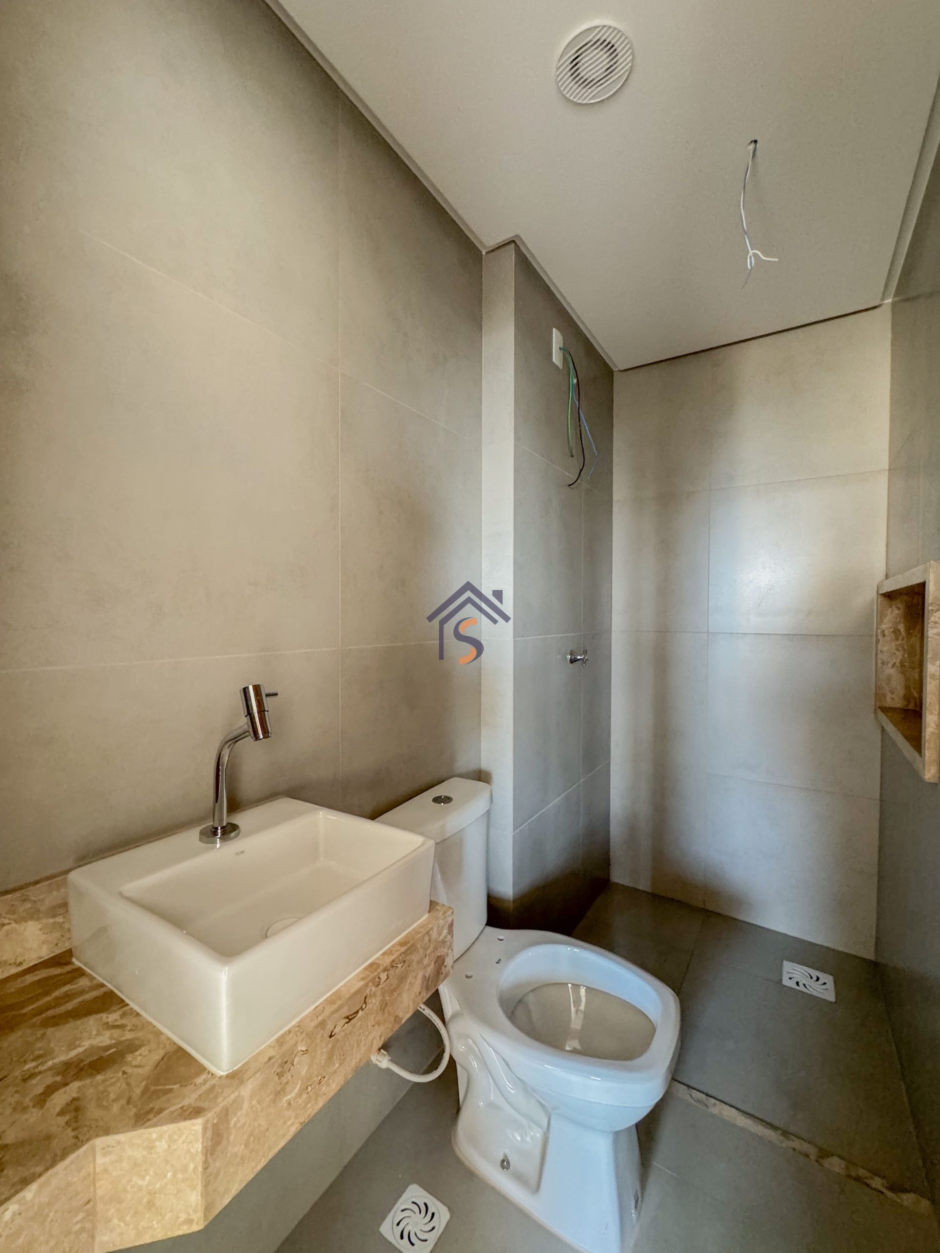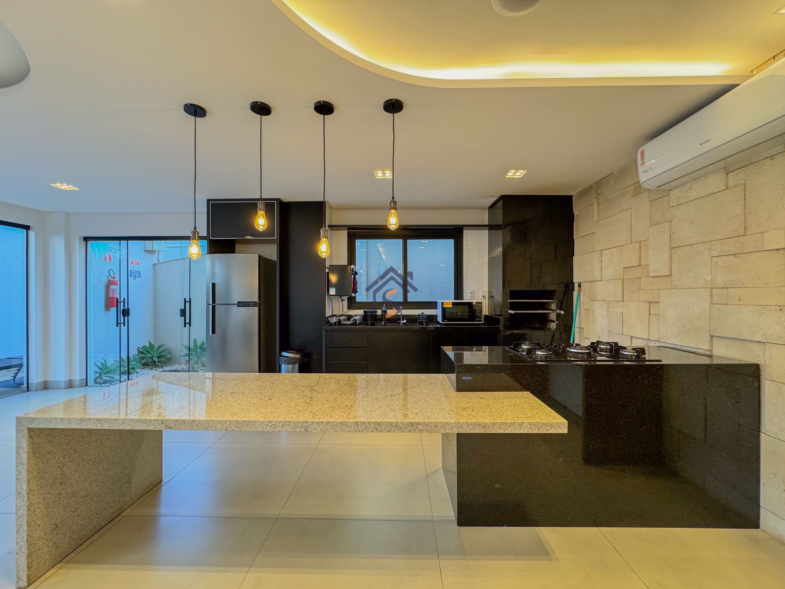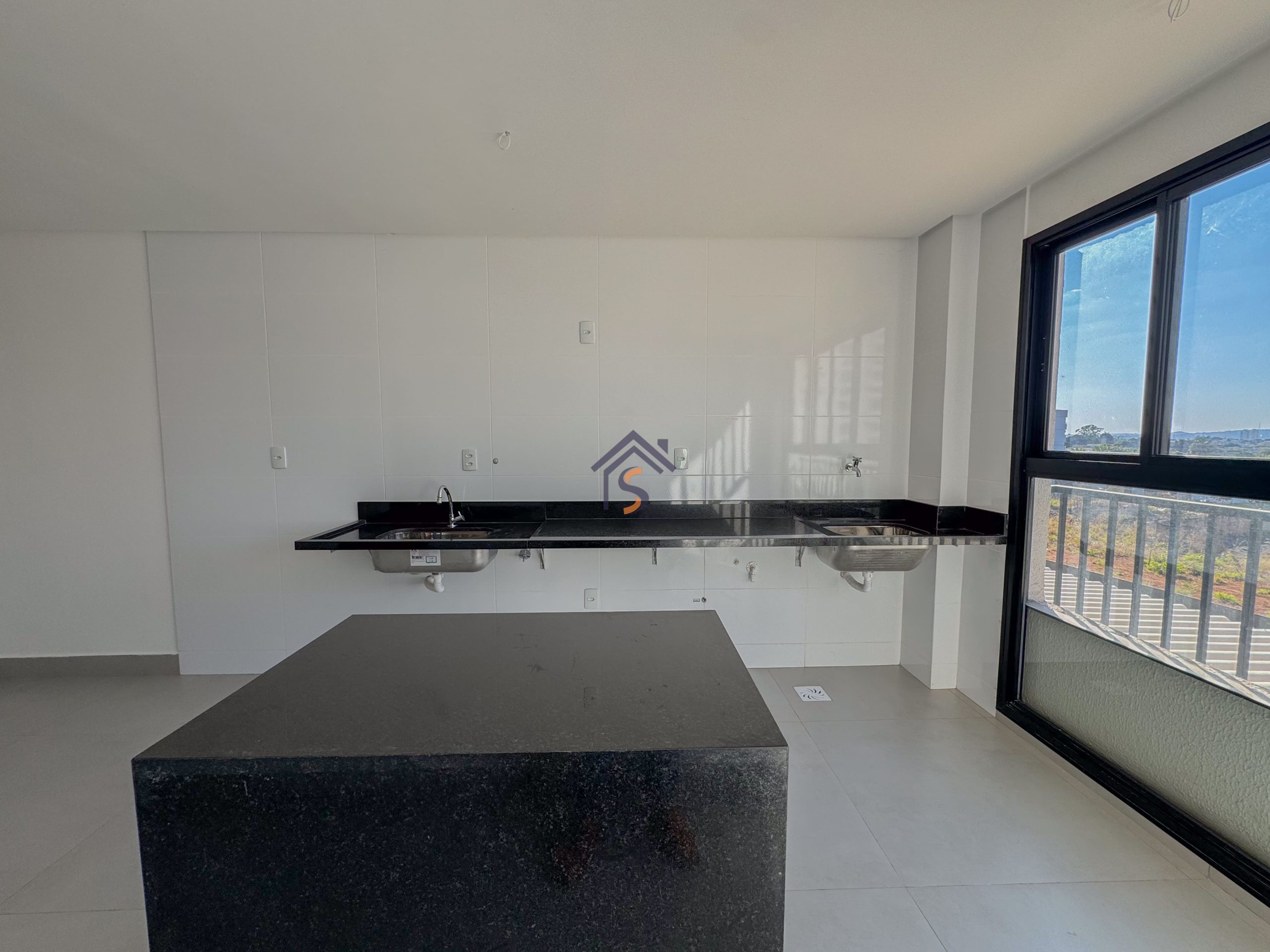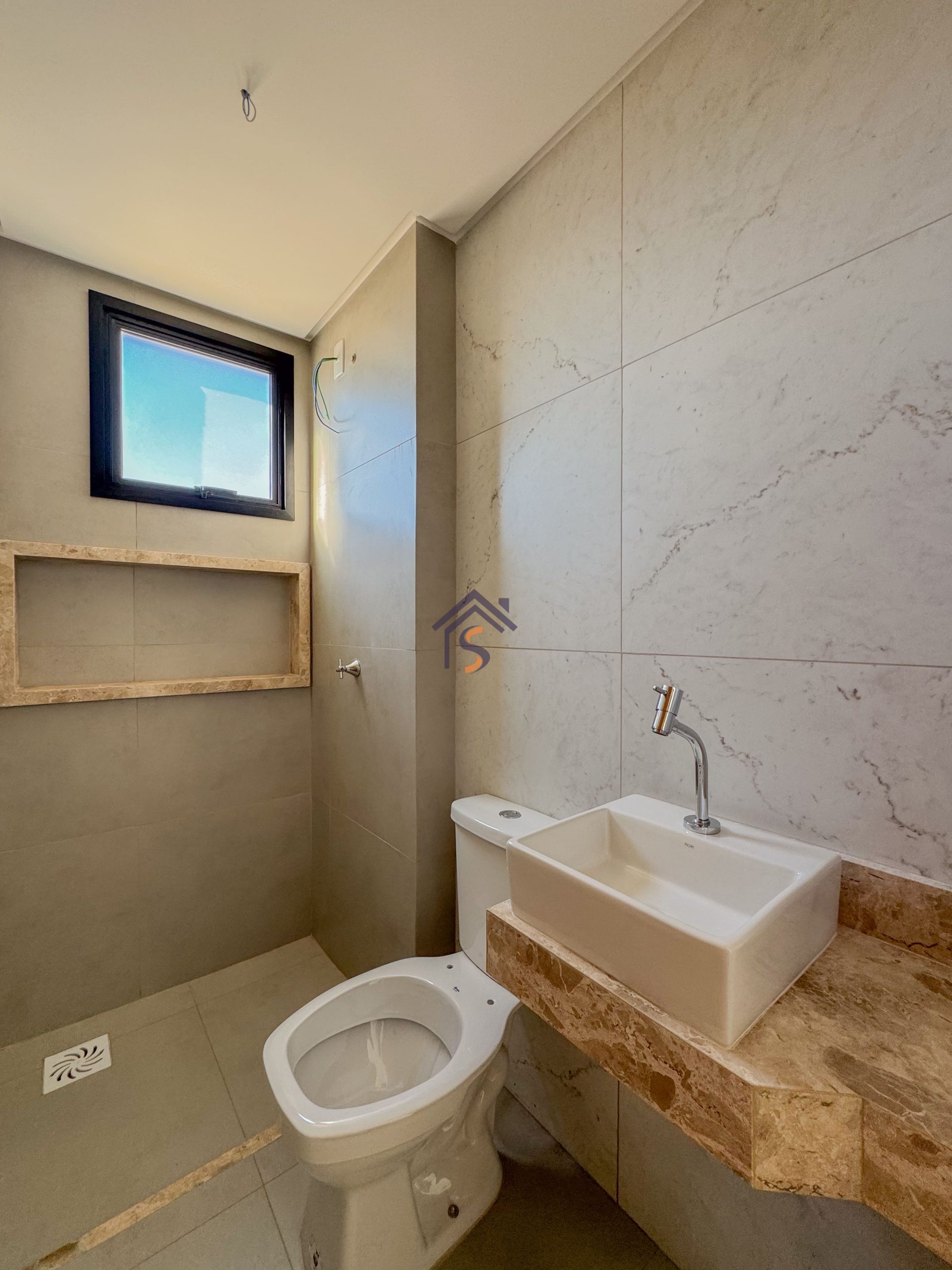 Acabamento diferenciado com esquadrias com veneziana, tanque com bancada em granito e cuba inox, fogão de ilha, bancada em granito preto São Gabriel, gesso rebaixado, porcelanato acetinado 90×90 cm, rede frigorígena, porcelanato marmorizado, nichos em mármore, cuba semi-encaixe com torneira bica alta, bancada em mármore Bege Bahia e cuba de apoio com torneira bica alta.