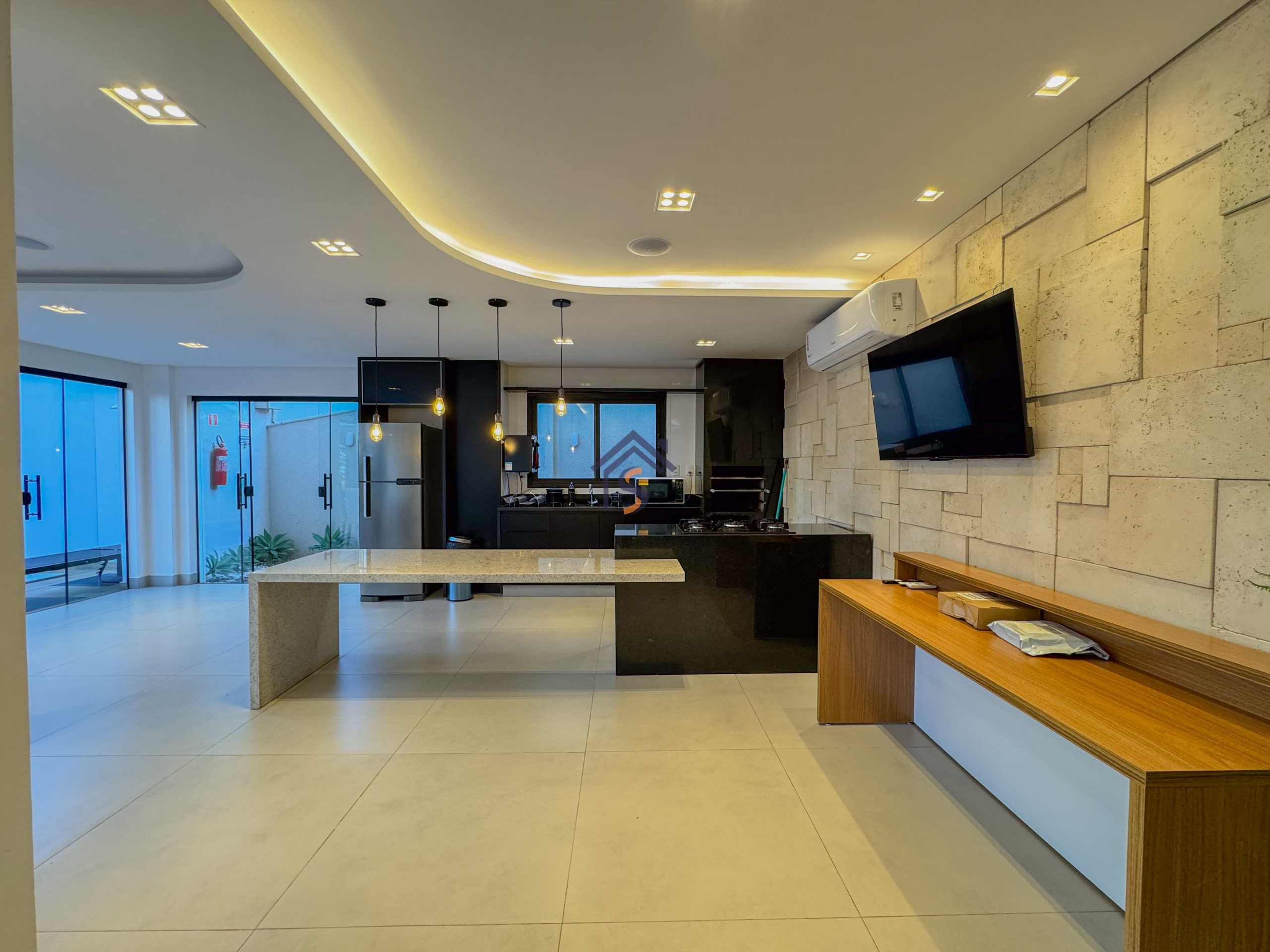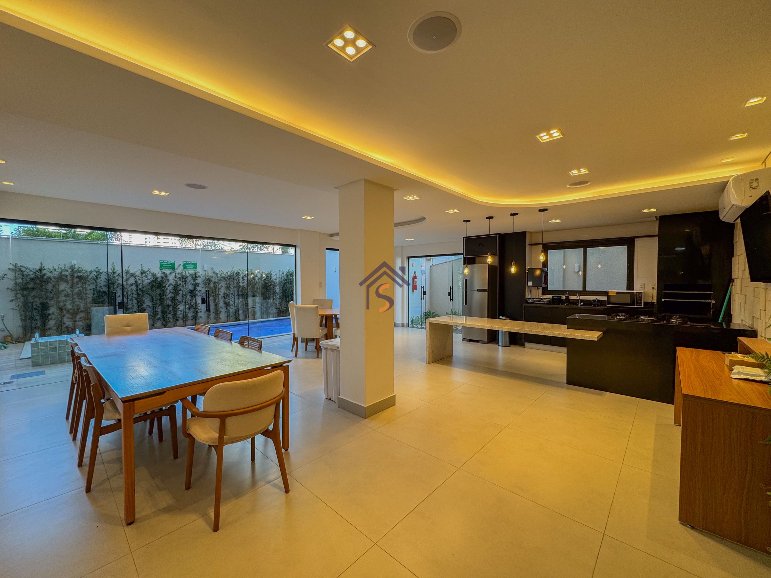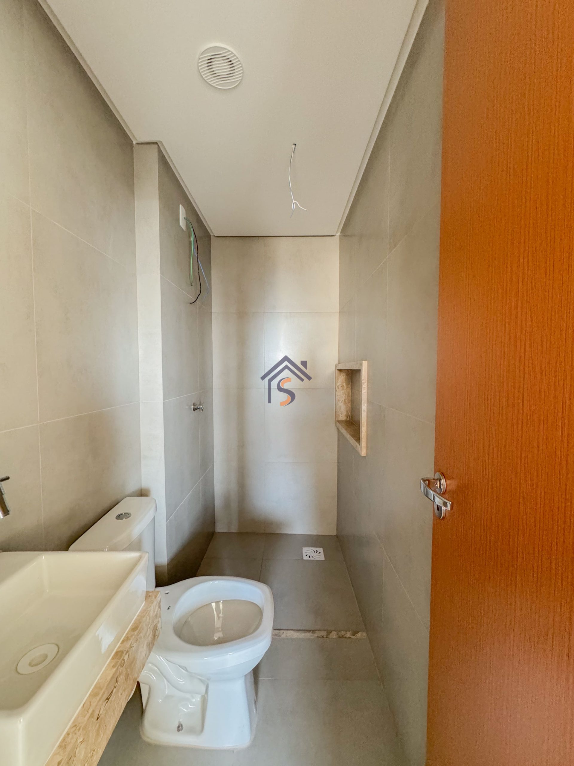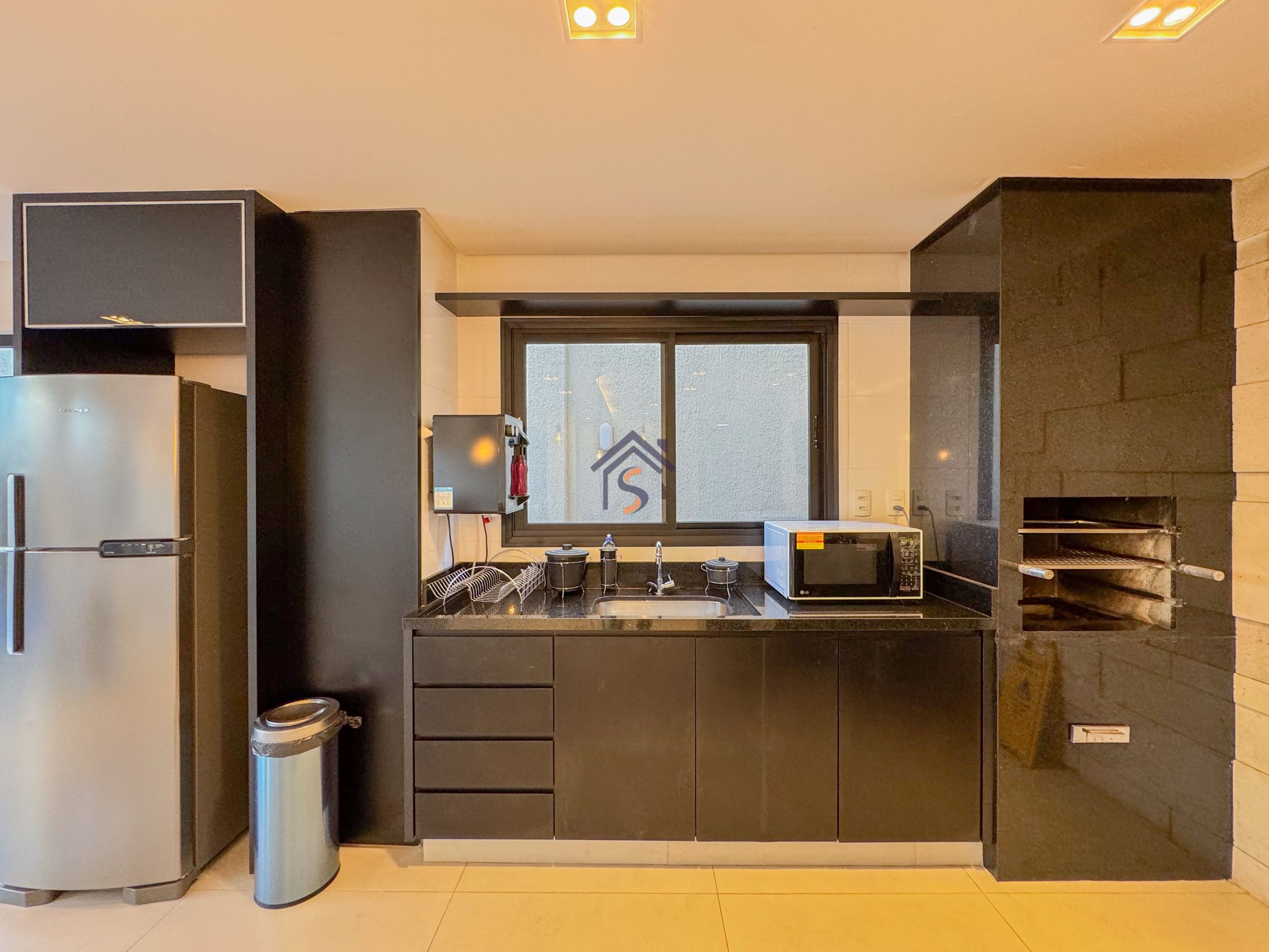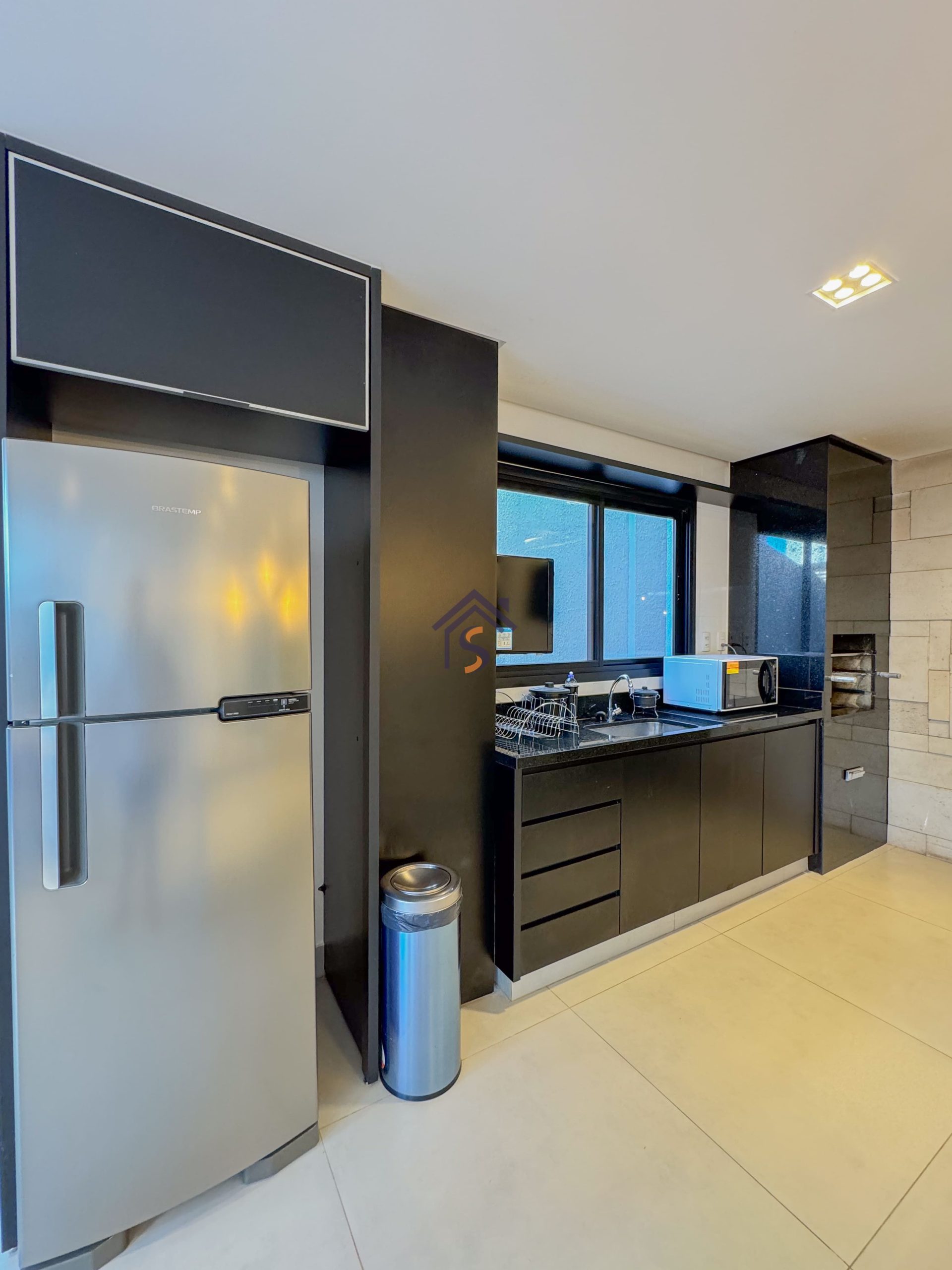Acabamento diferenciado com esquadrias com veneziana, tanque com bancada em granito e cuba inox, fogão de ilha, bancada em granito preto São Gabriel, gesso rebaixado, porcelanato acetinado 90×90 cm, rede frigorígena, porcelanato marmorizado, nichos em mármore, cuba semi-encaixe com torneira bica alta, bancada em mármore Bege Bahia e cuba de apoio com torneira bica alta.