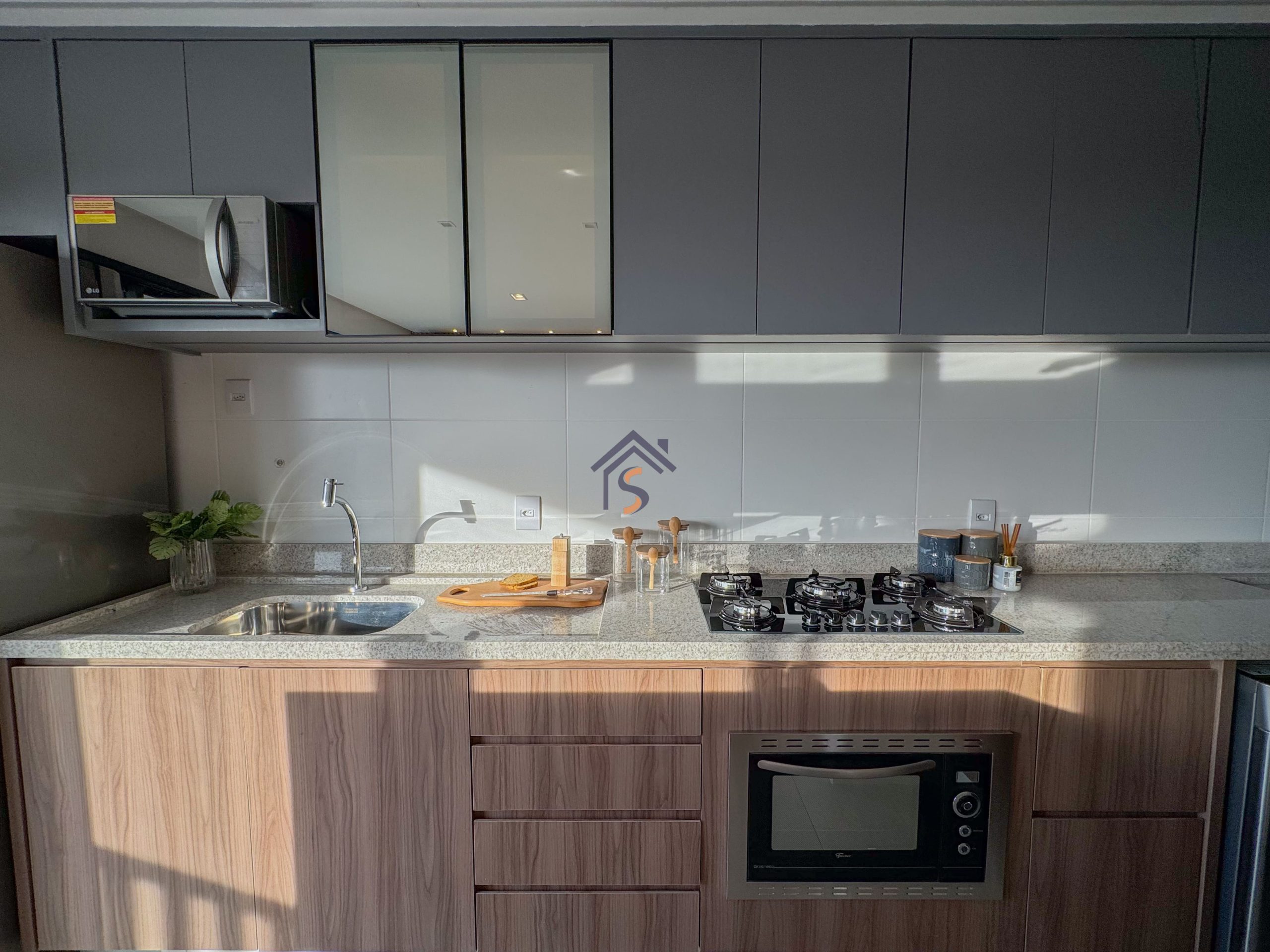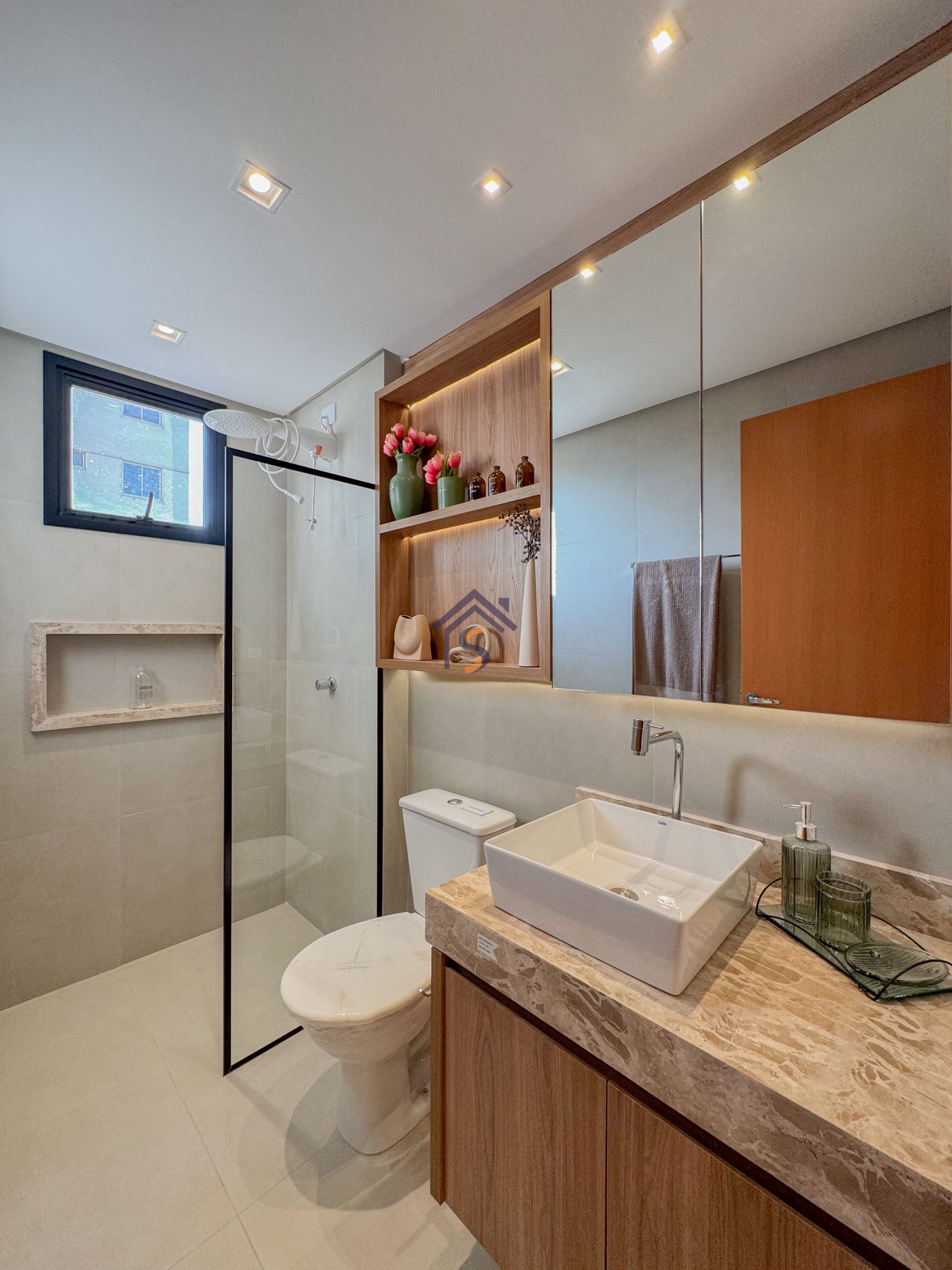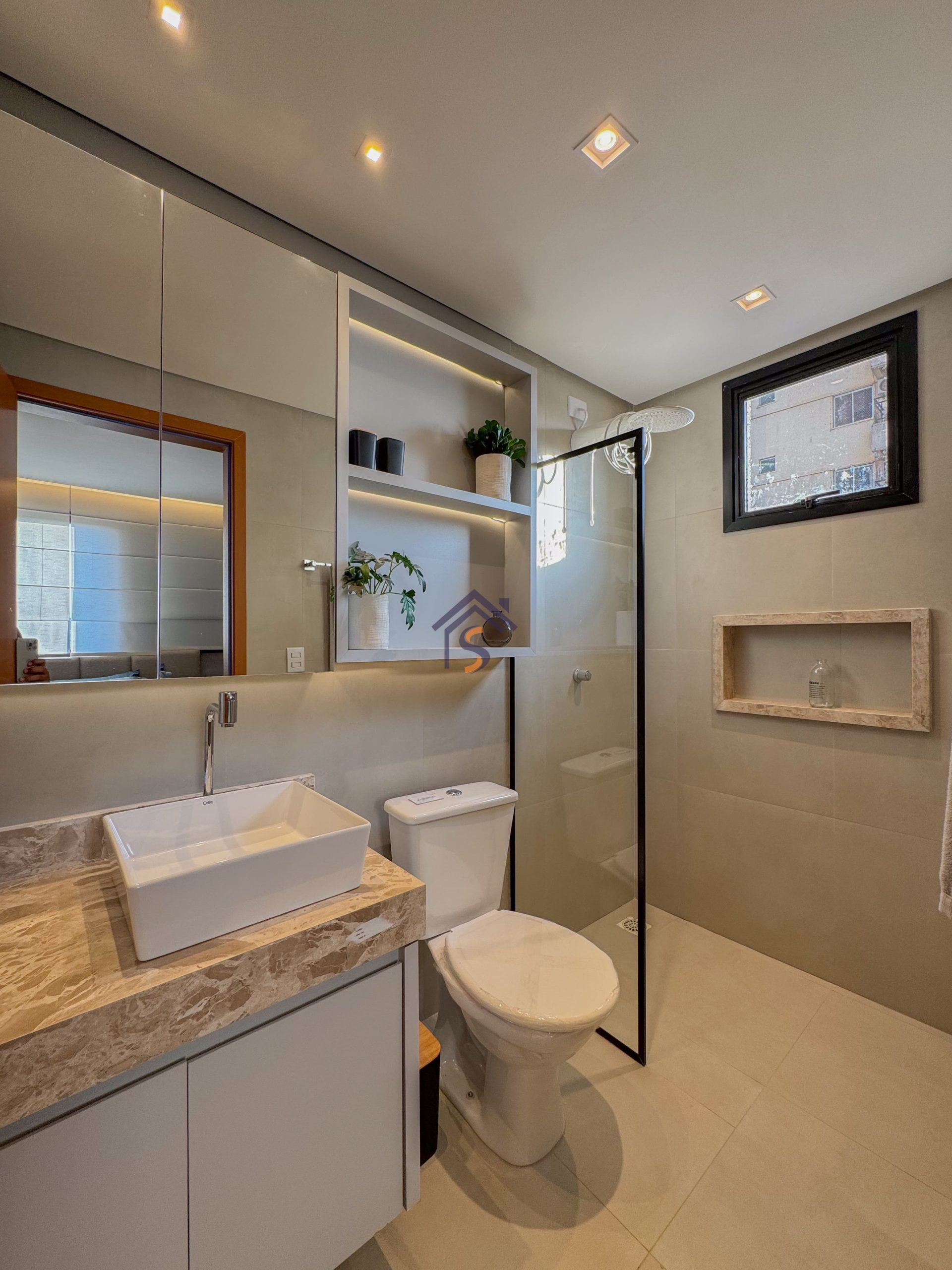 Acabamento diferenciado com fechadura digital, porcelanato acetinado 90×90 cm, bancadas dos banheiros e lavabos em granito Bege Bahia, bancada da cozinha e área de serviço em granito Branco Siena, esquadrias em alumínio preto com venezianas nos quartos, nichos nos banheiros com moldura em mármore Bege Bahia e forro rebaixado em todo o apartamento.