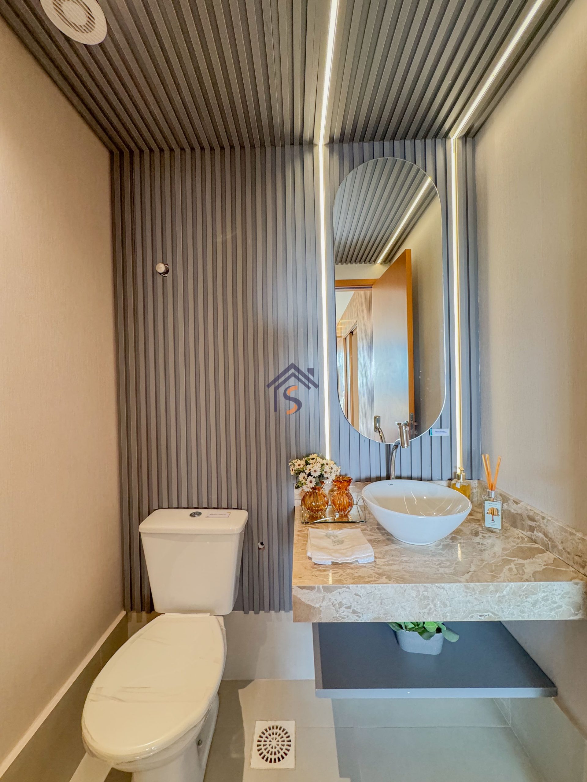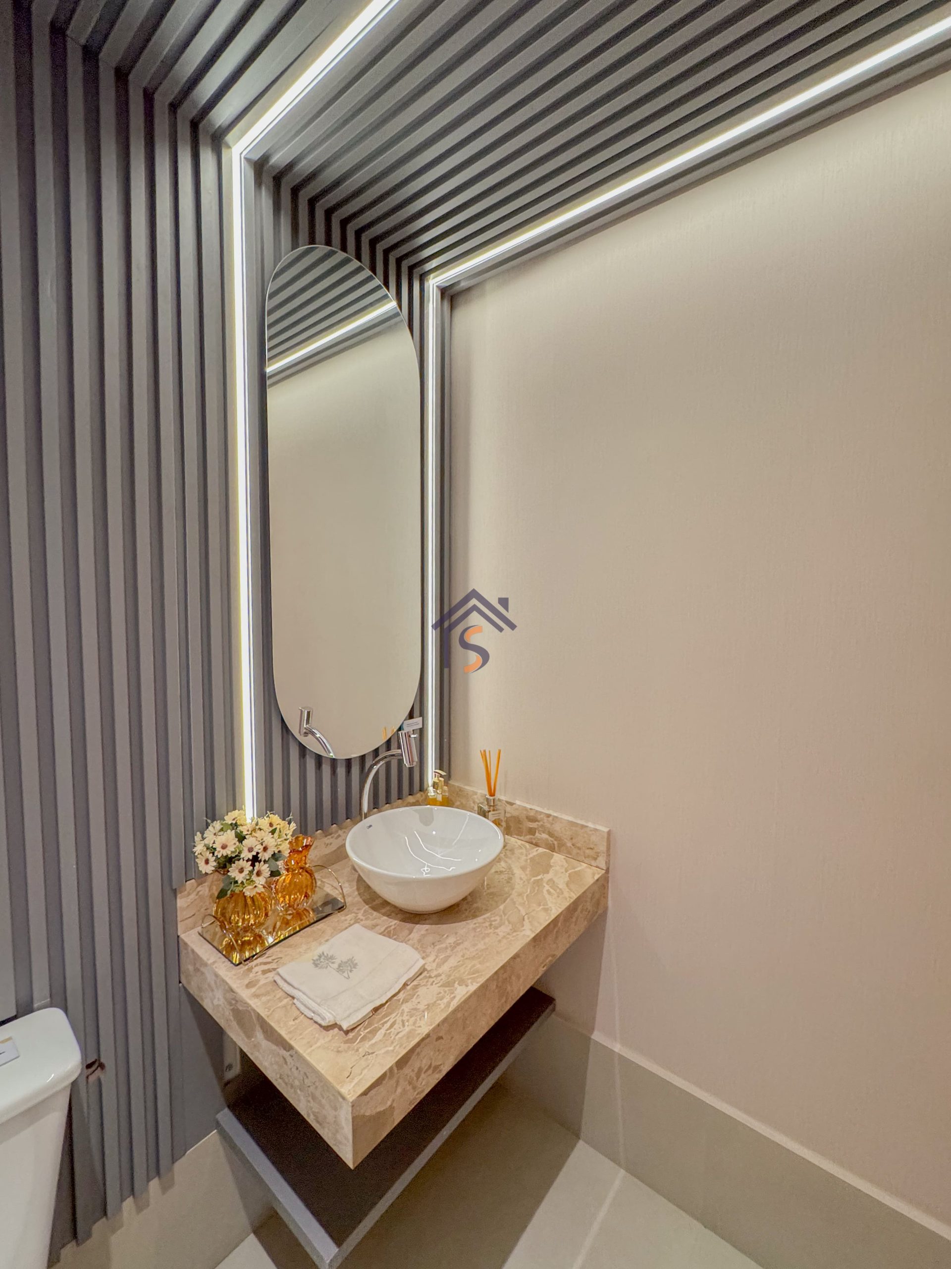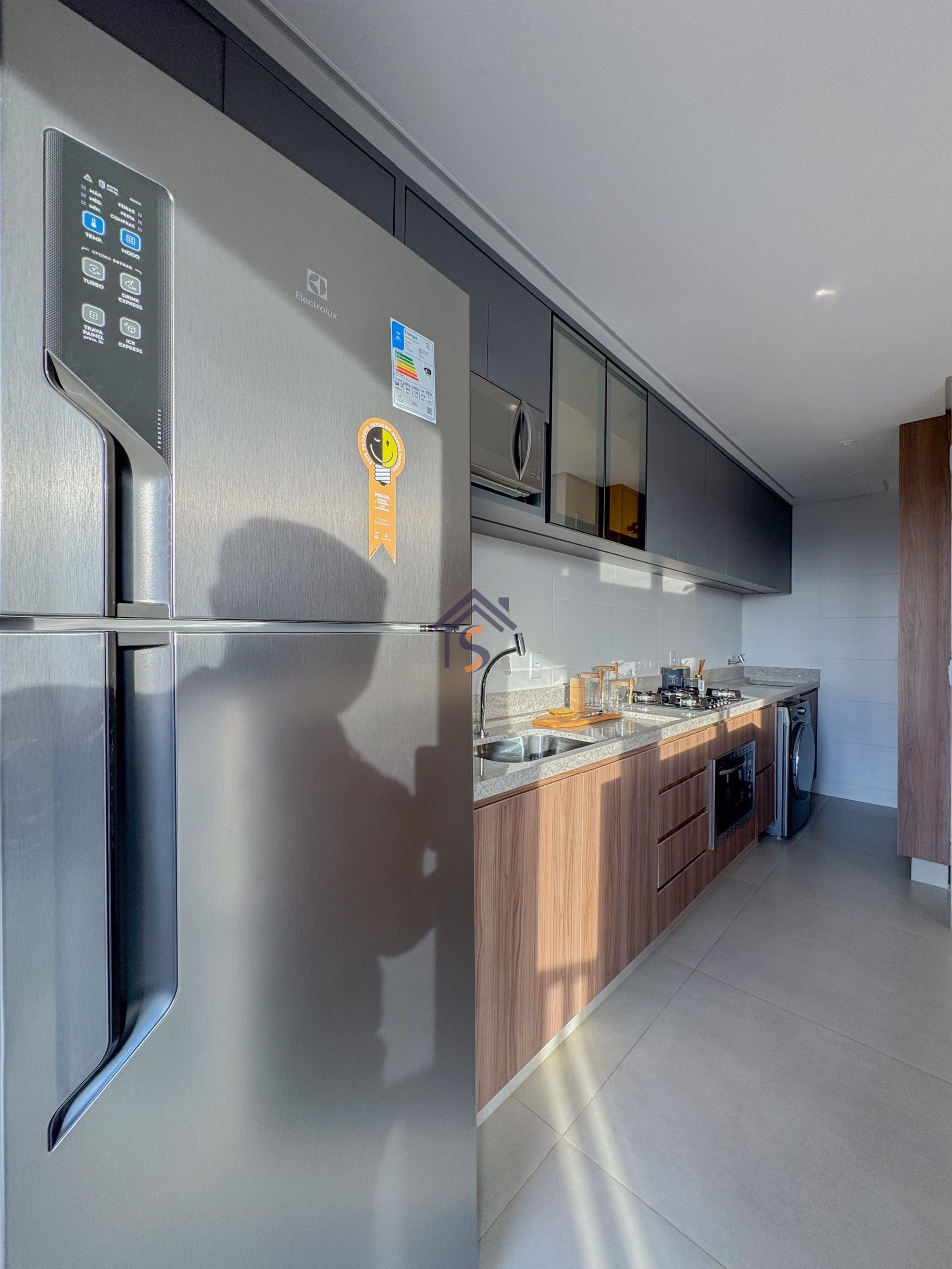 Acabamento diferenciado com fechadura digital, porcelanato acetinado 90×90 cm, bancadas dos banheiros e lavabos em granito Bege Bahia, bancada da cozinha e área de serviço em granito Branco Siena, esquadrias em alumínio preto com venezianas nos quartos, nichos nos banheiros com moldura em mármore Bege Bahia e forro rebaixado em todo o apartamento.