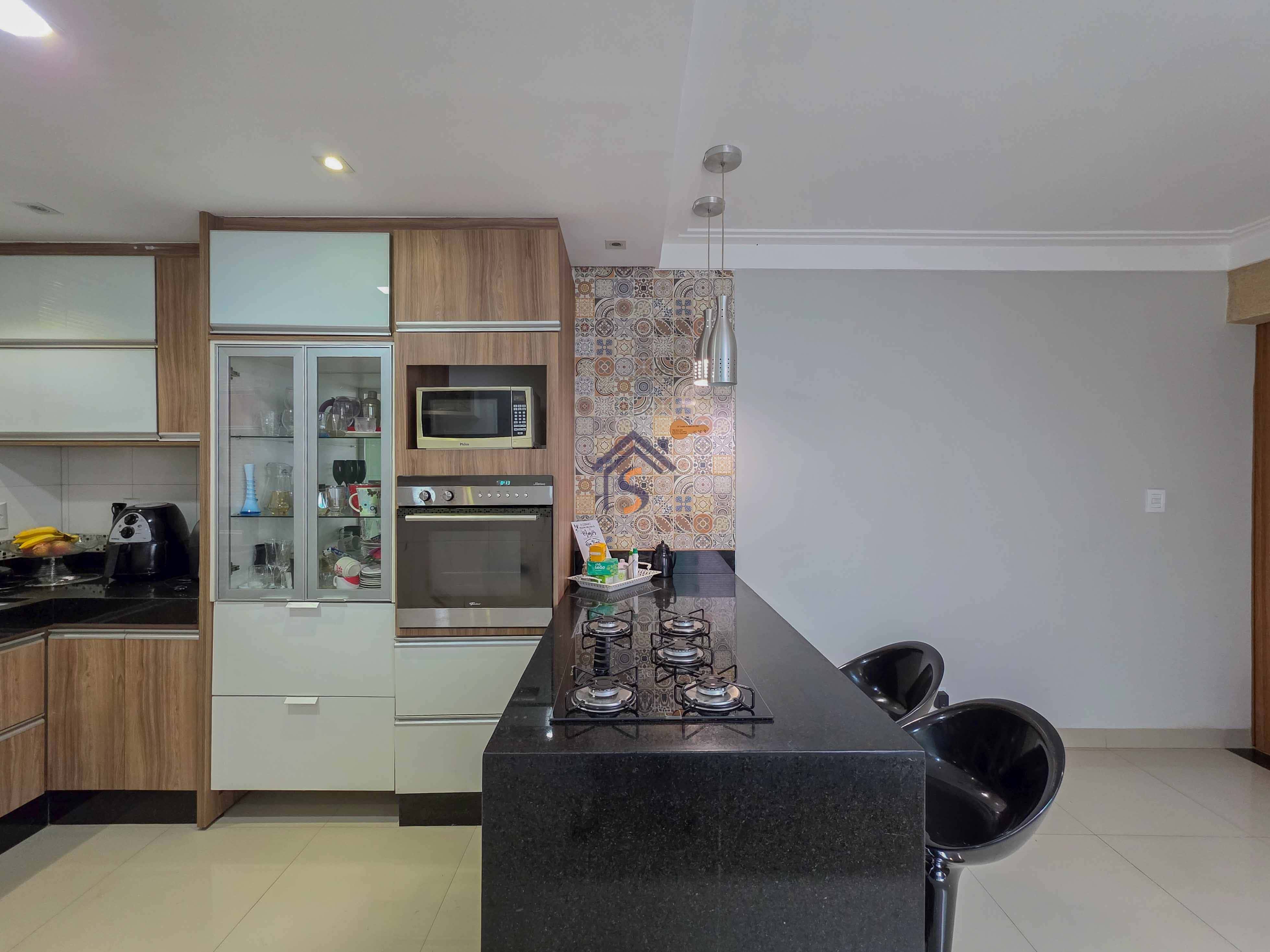 Acabamento sofisticado, porcelanato polido e rodapé embutido dentro da casa, porcelanato acetinado fora da casa, sala de estar e jantar com pé direito duplo,cozinha com armários, cooktop, forno, dois quartos com ar-condicionado e armários planejados, cortinas, rebaixamento de gesso, projeto luminotécnico, sete banquetas na área de lazer e cooktop, mantendo o mesmo padrão nos acabamentos.