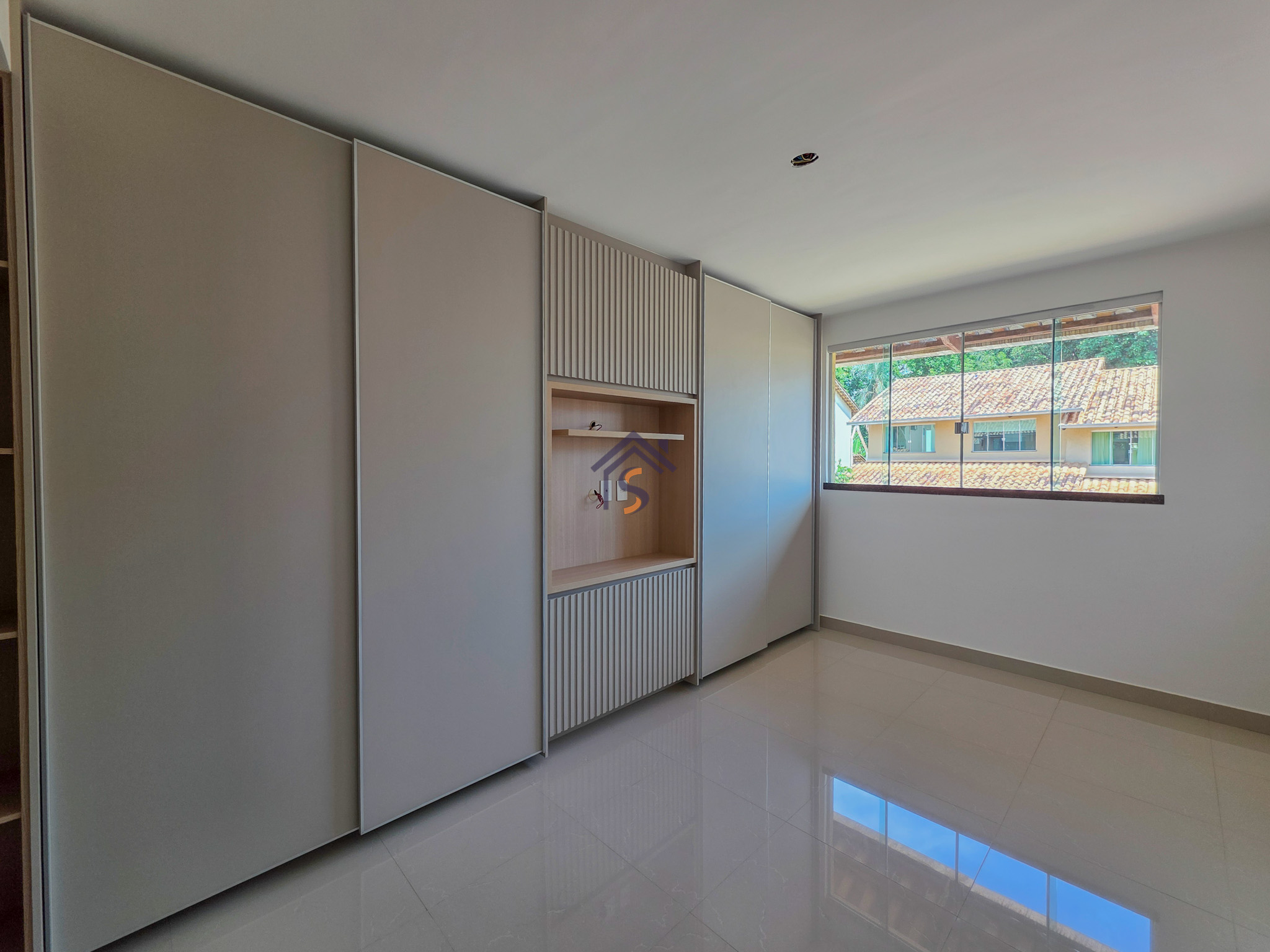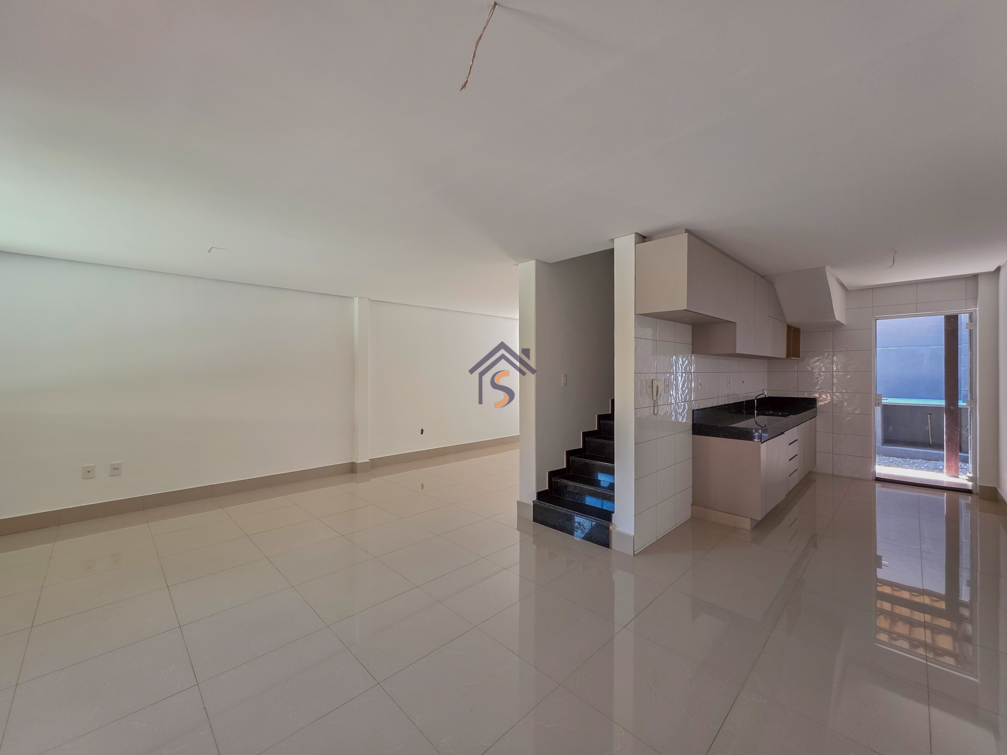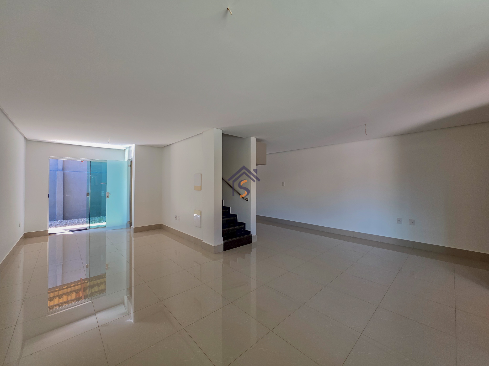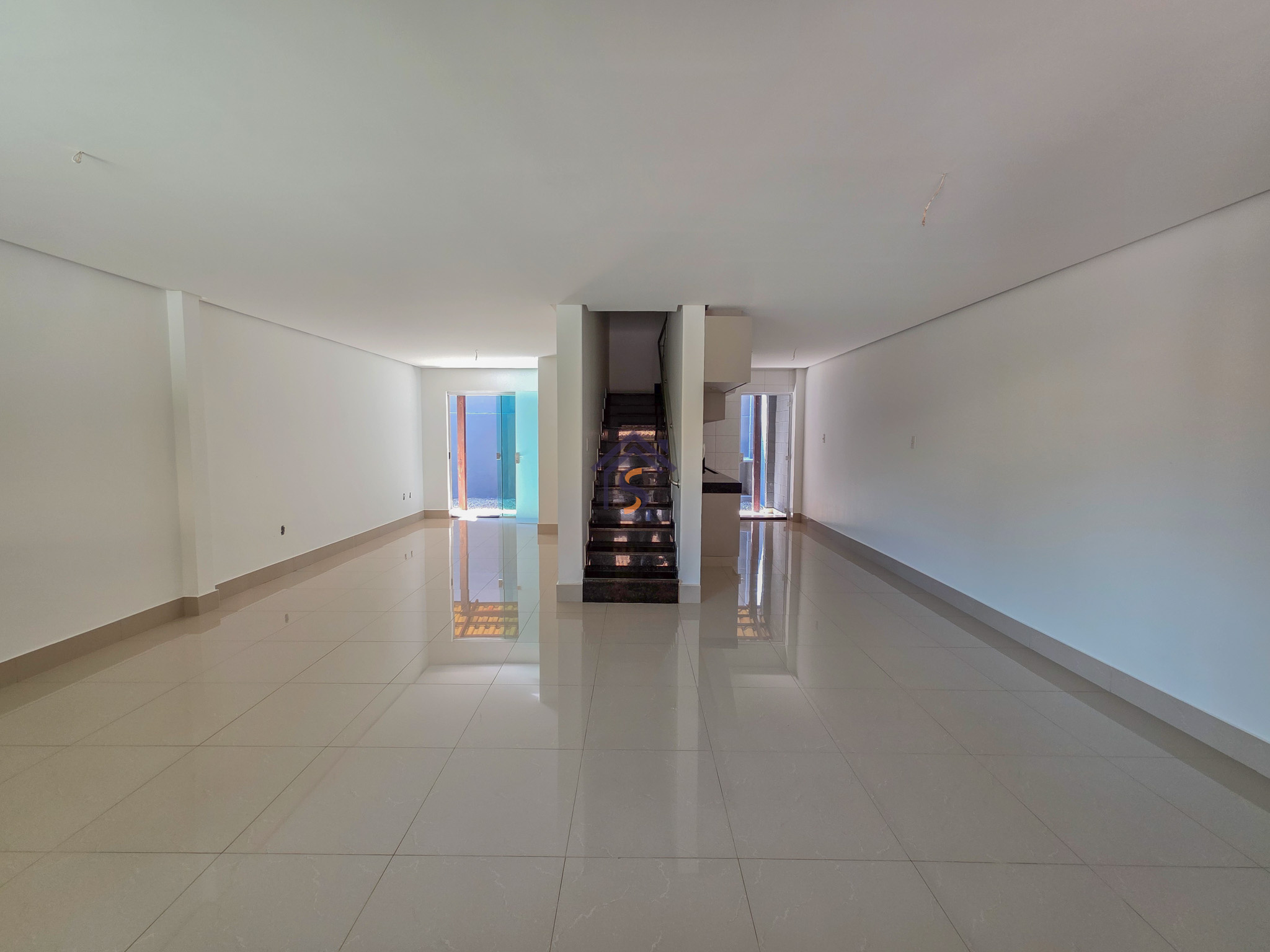Acabamento sofisticado em alto padrão, rebaixamento de gesso com sanca invertida, cozinha com armários, dois quartos com armários, janelas em vidro temperado tipo blindex, porcelanato 60×60, peitoris das janelas em granito, escada em granito e corrimão de aço inox, previsão para ar-condicionado tipo split nas suítes.