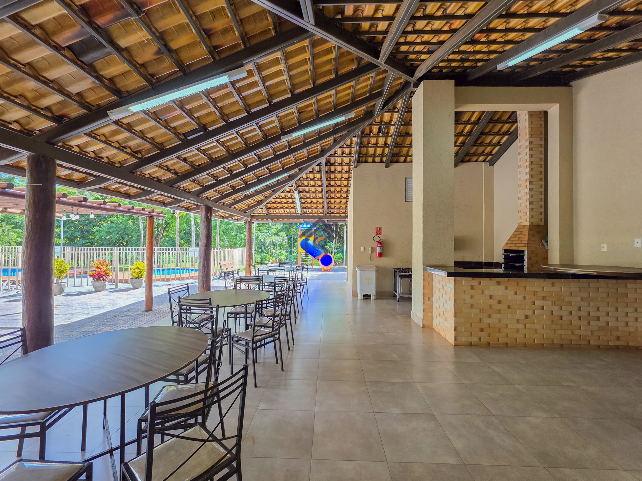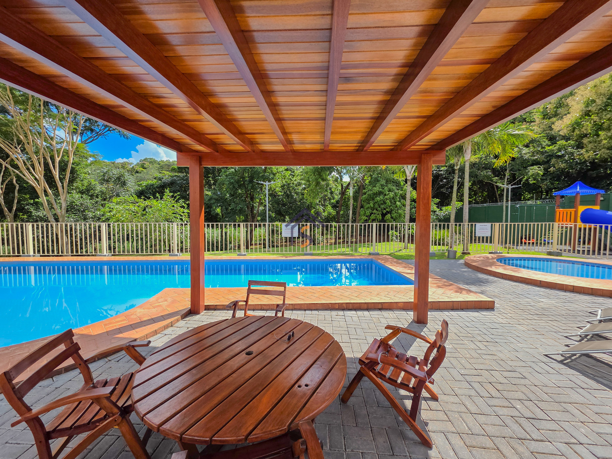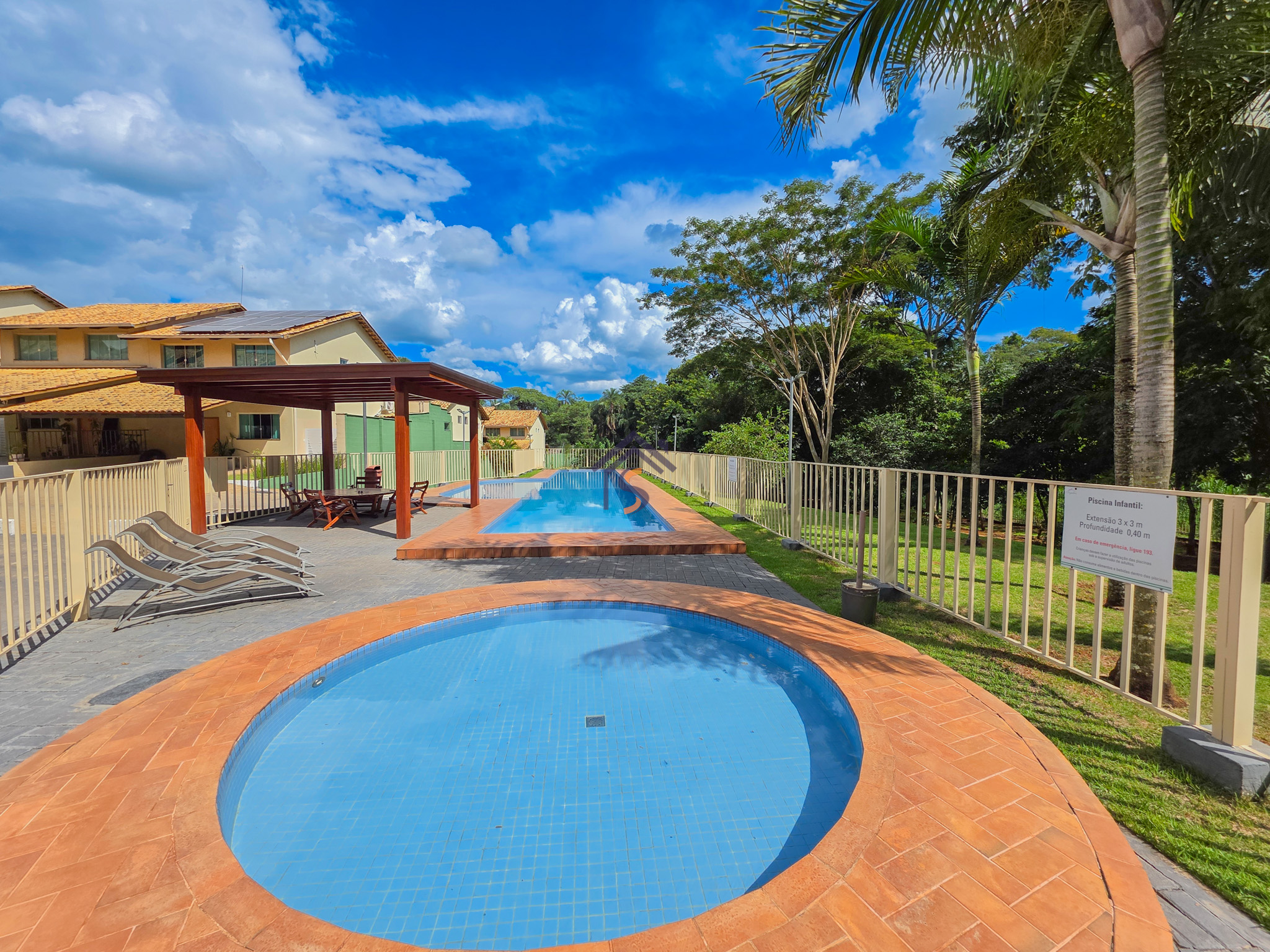 Área de lazer com piscina adulto e infantil, churrasqueira integrada ao salão de festas, playground e área verde de reserva do condomínio.