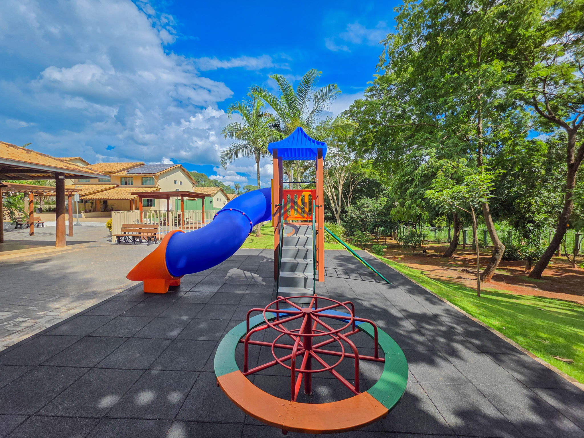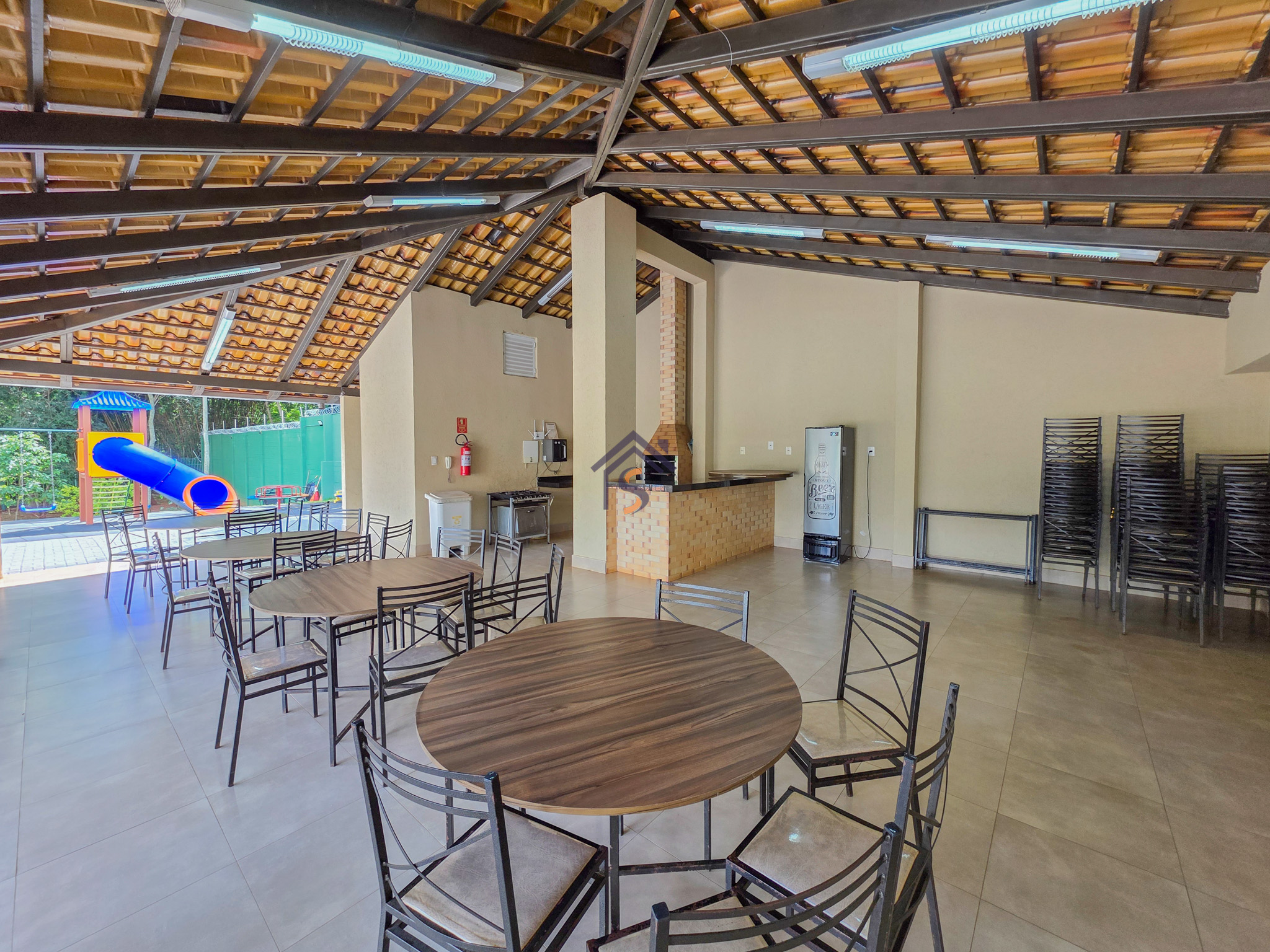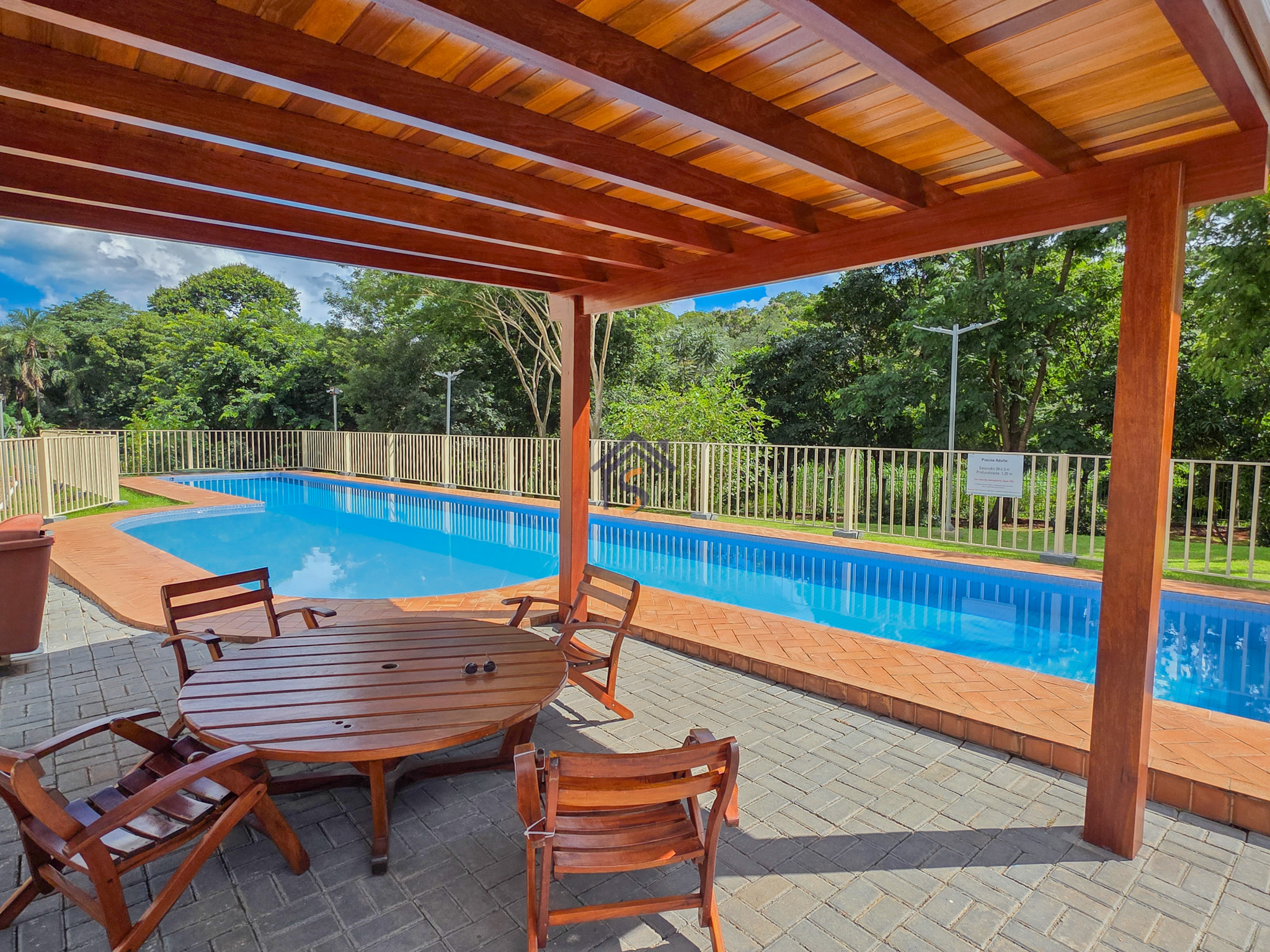 Área de lazer com piscina adulto e infantil, churrasqueira integrada ao salão de festas, playground e área verde de reserva do condomínio.