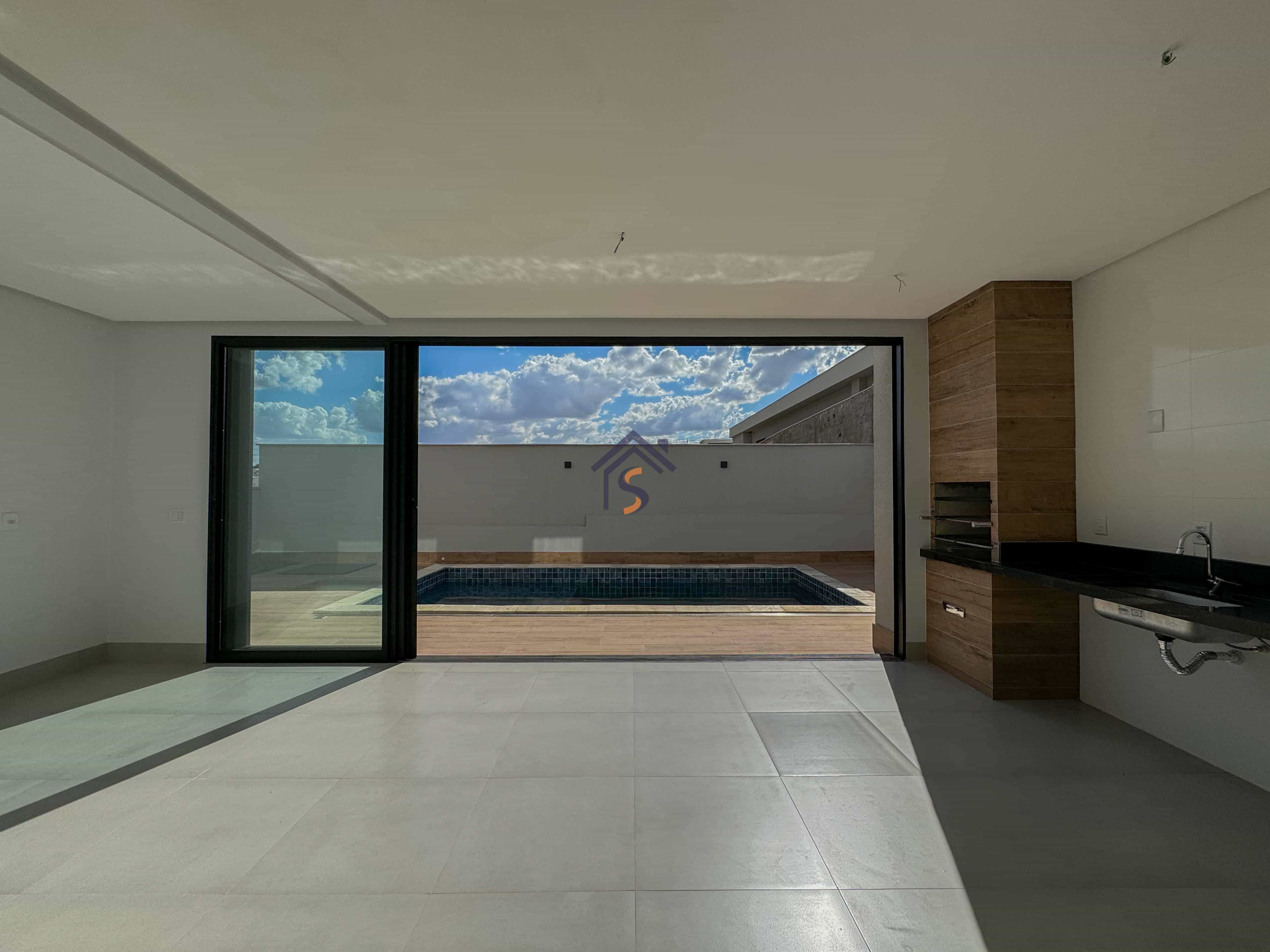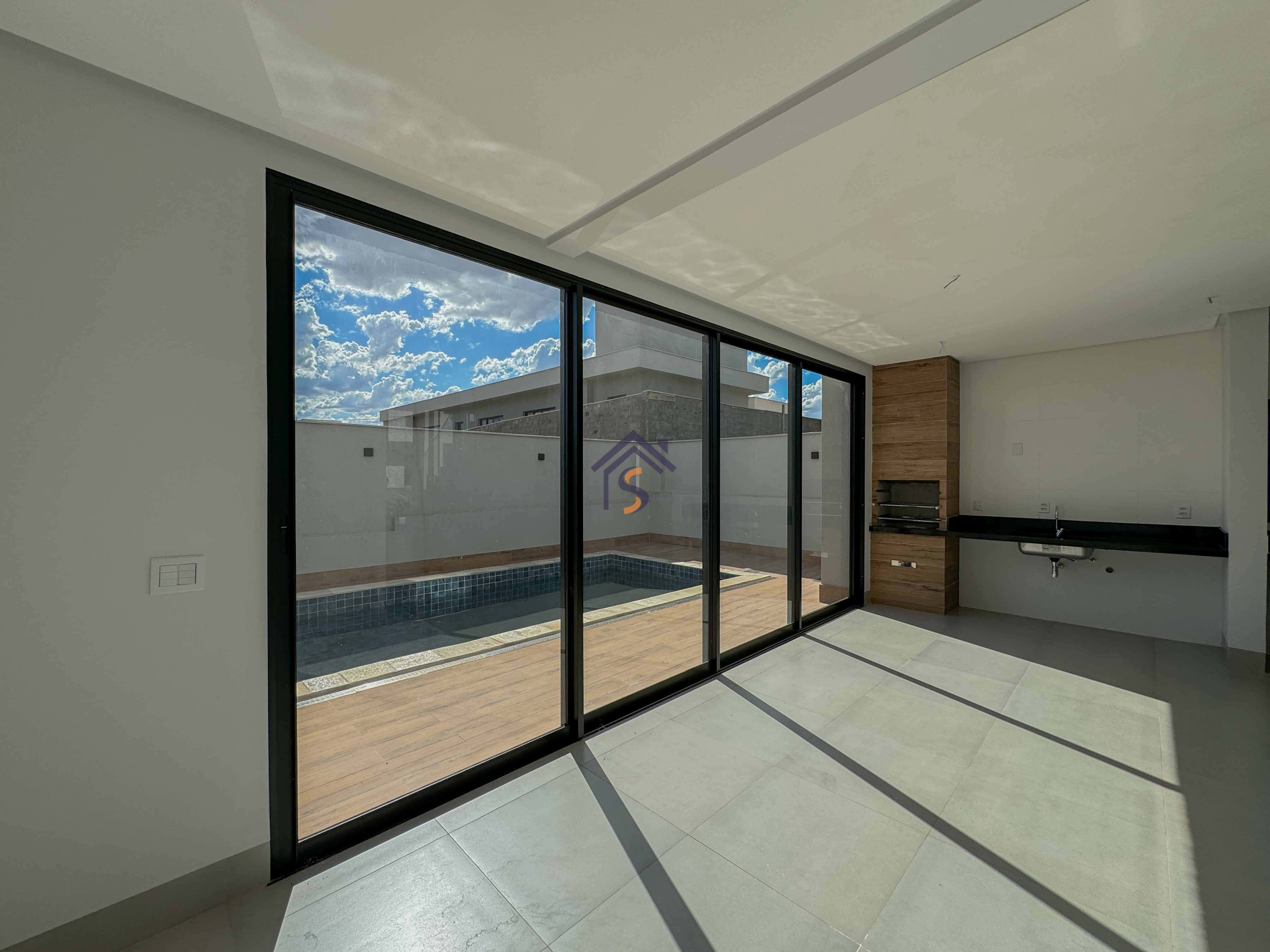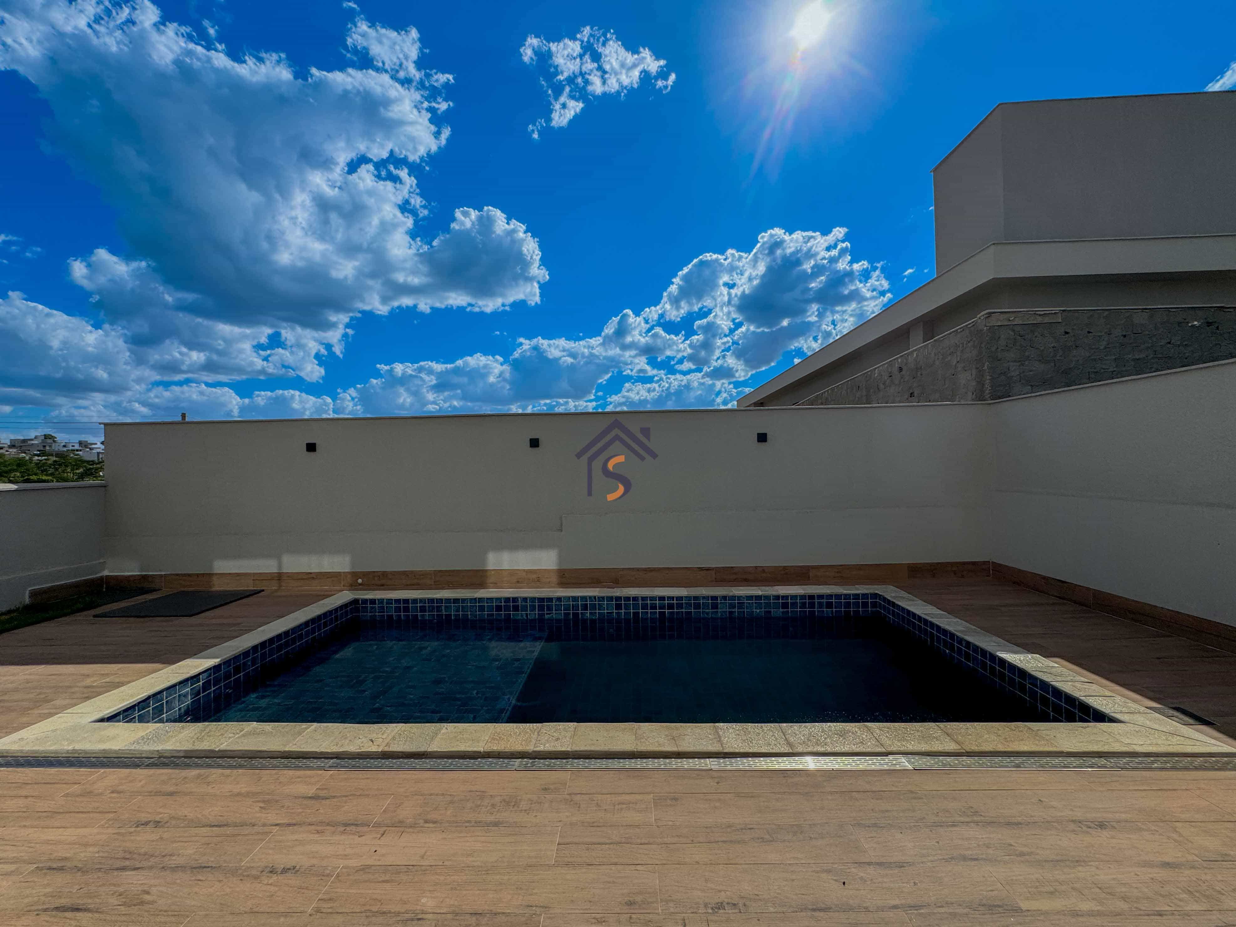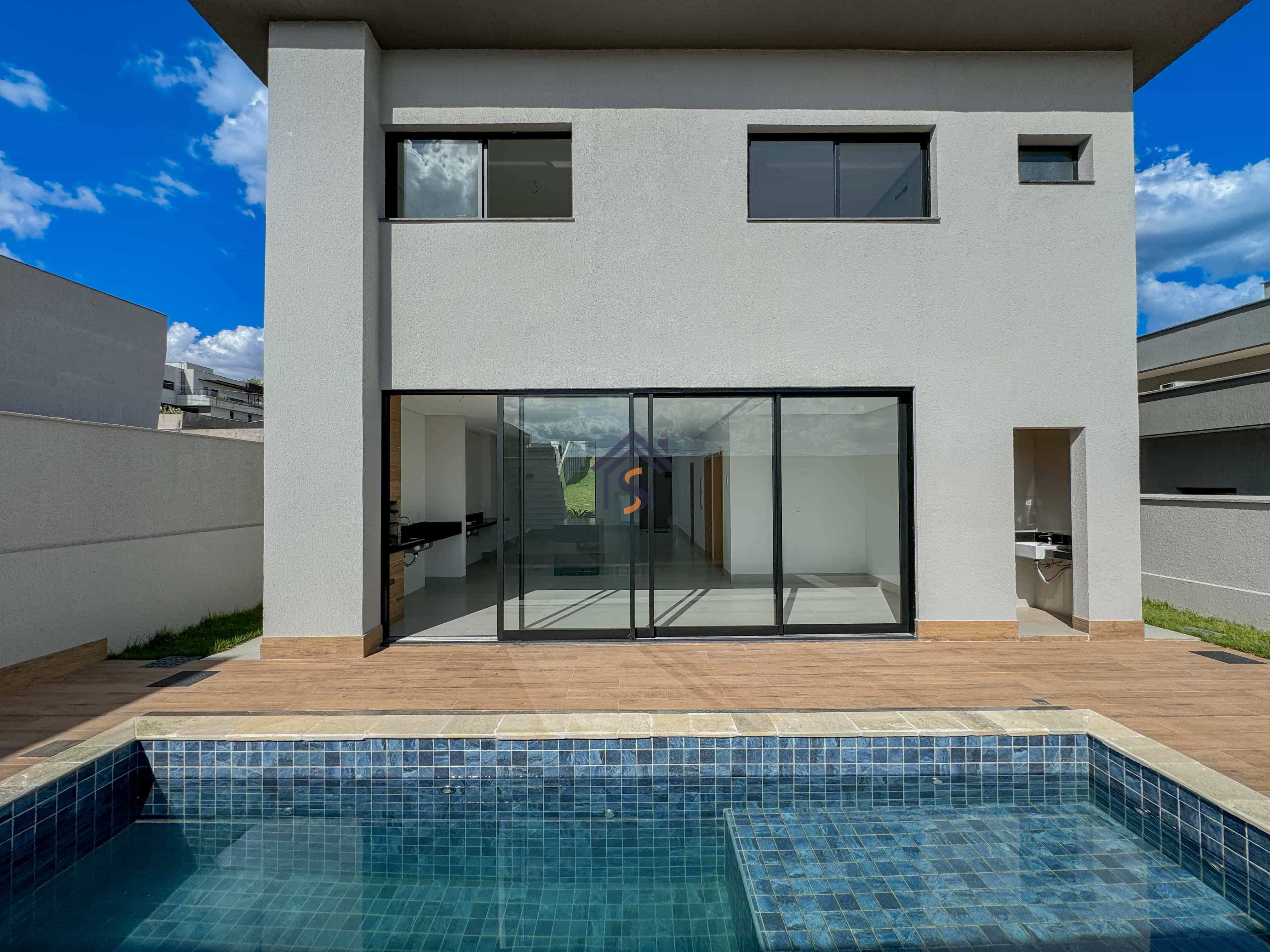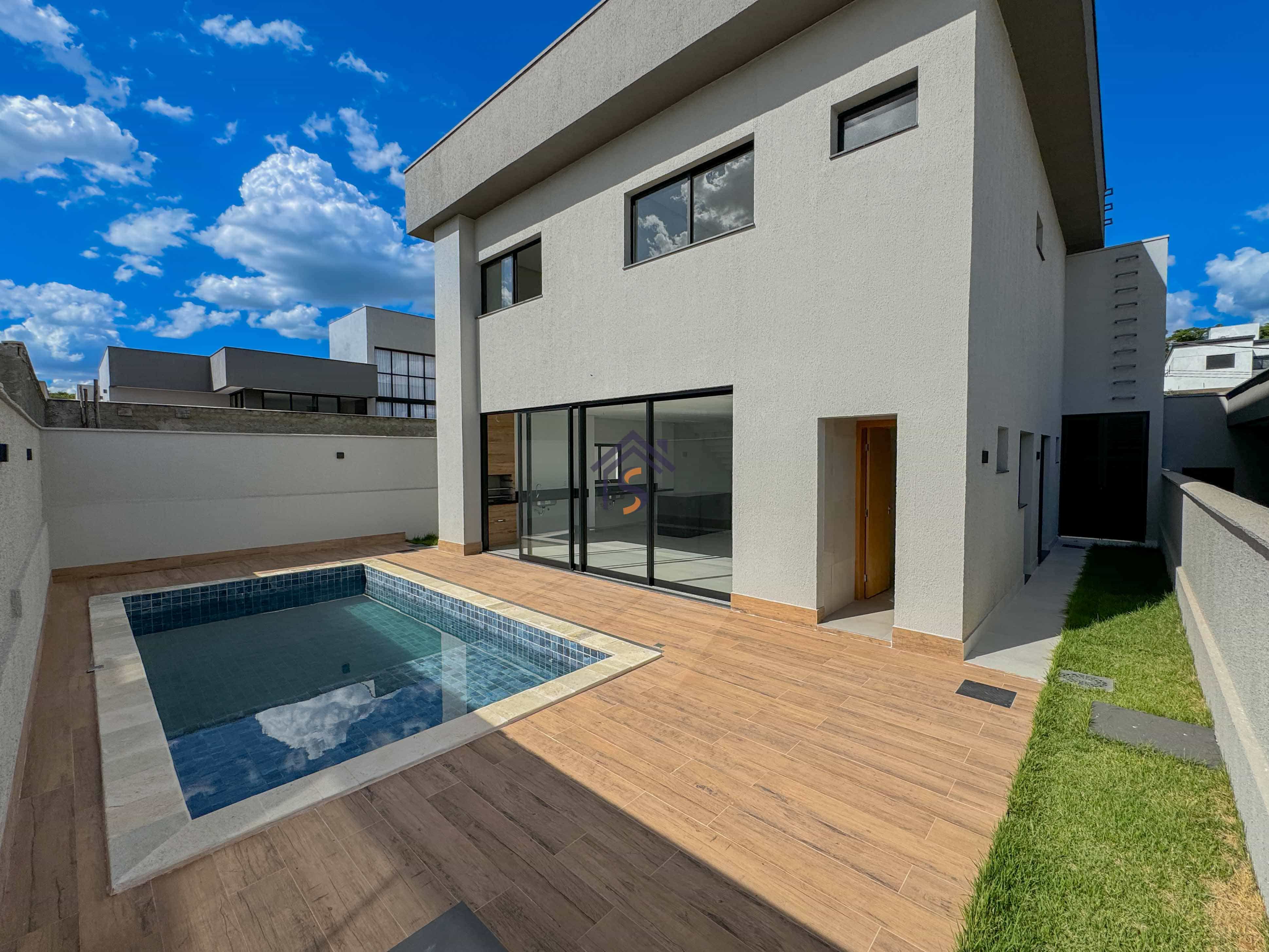 Sobrado em condomínio com quatro suítes plenas, sendo uma suíte máster com espaço para closet, sala de estar e sala de jantar ampla, lavabo, cozinha, piscina, área de serviço coberta, quatro vagas de garagens, sendo duas vagas cobertas.