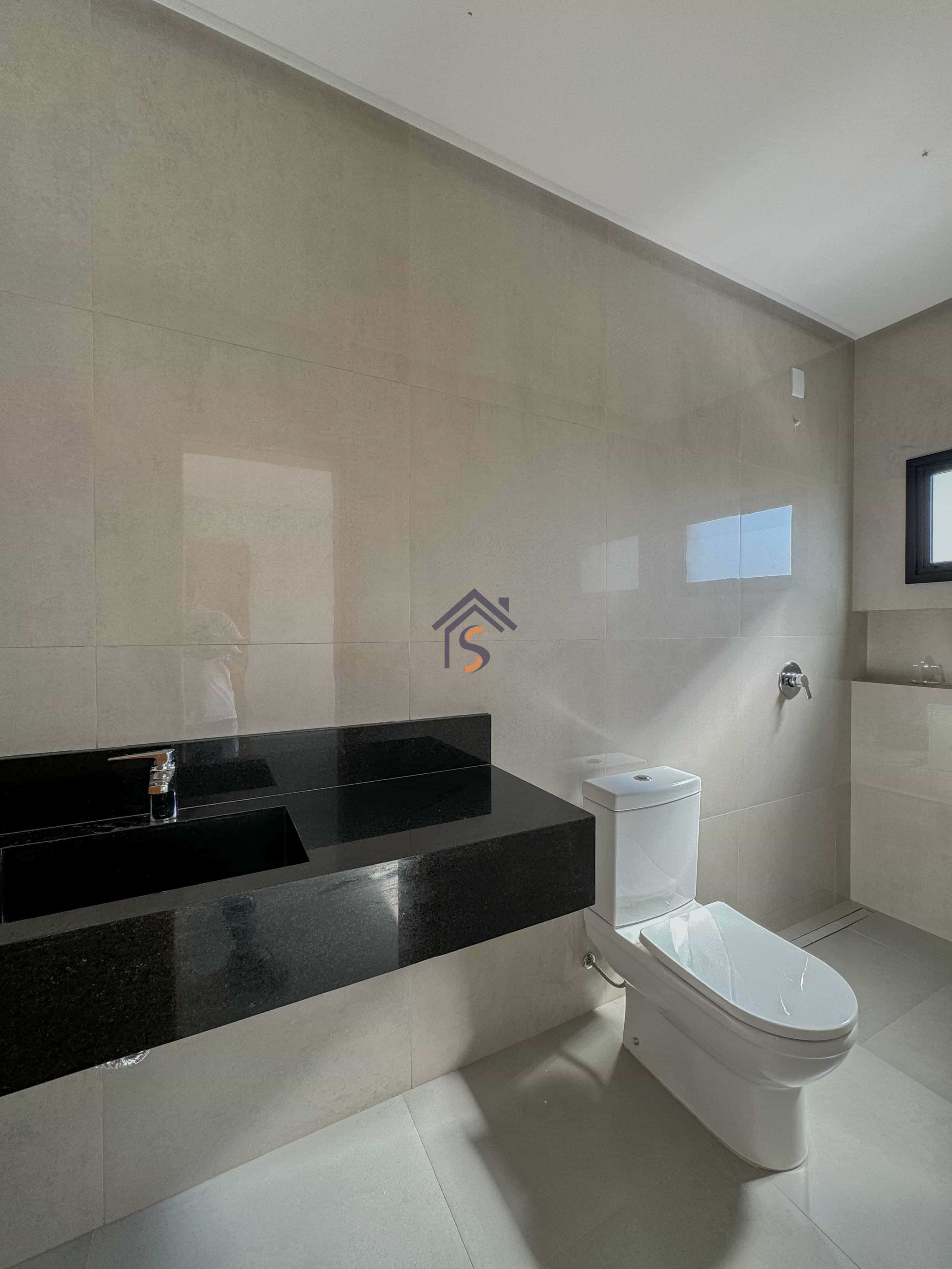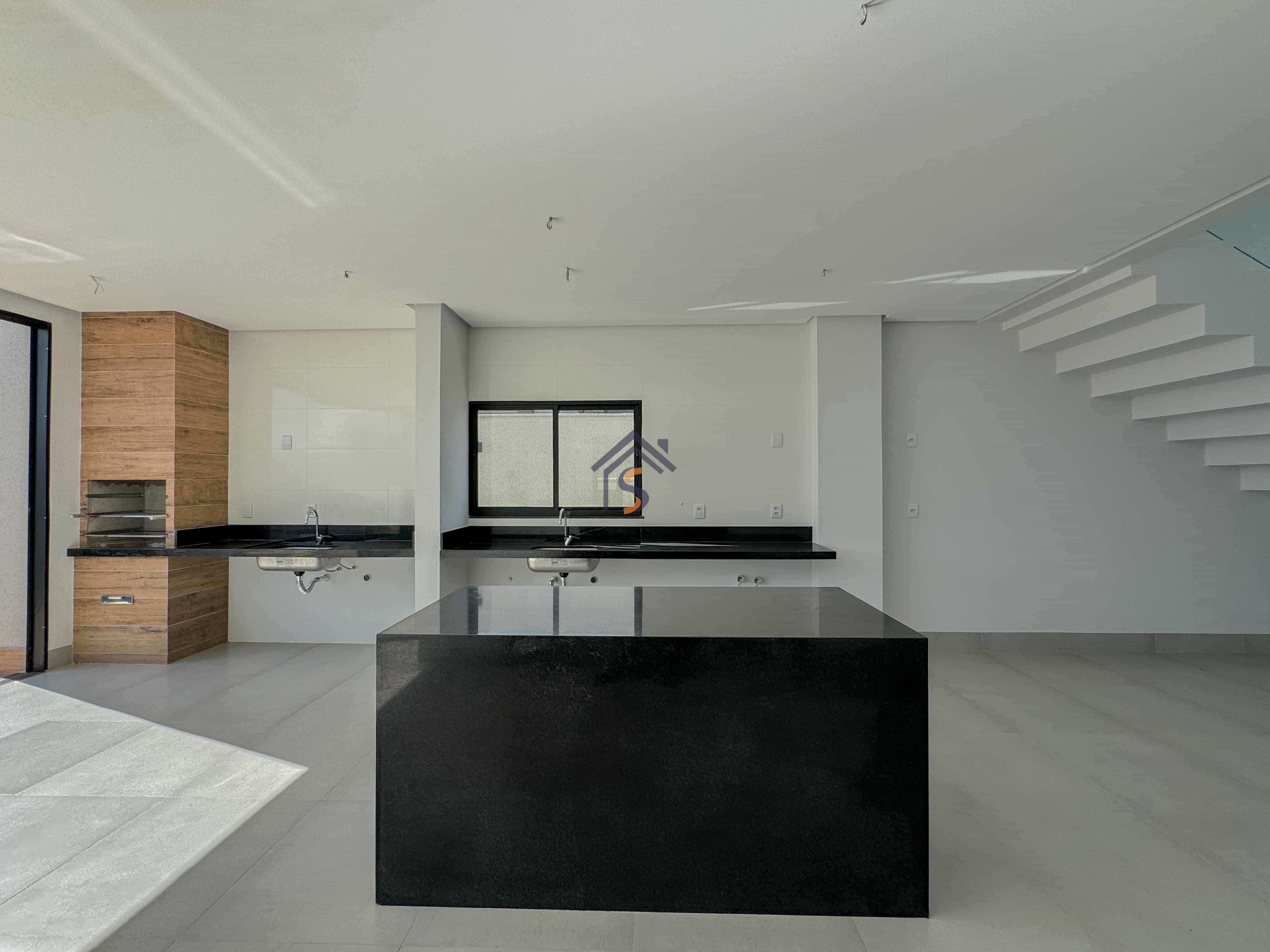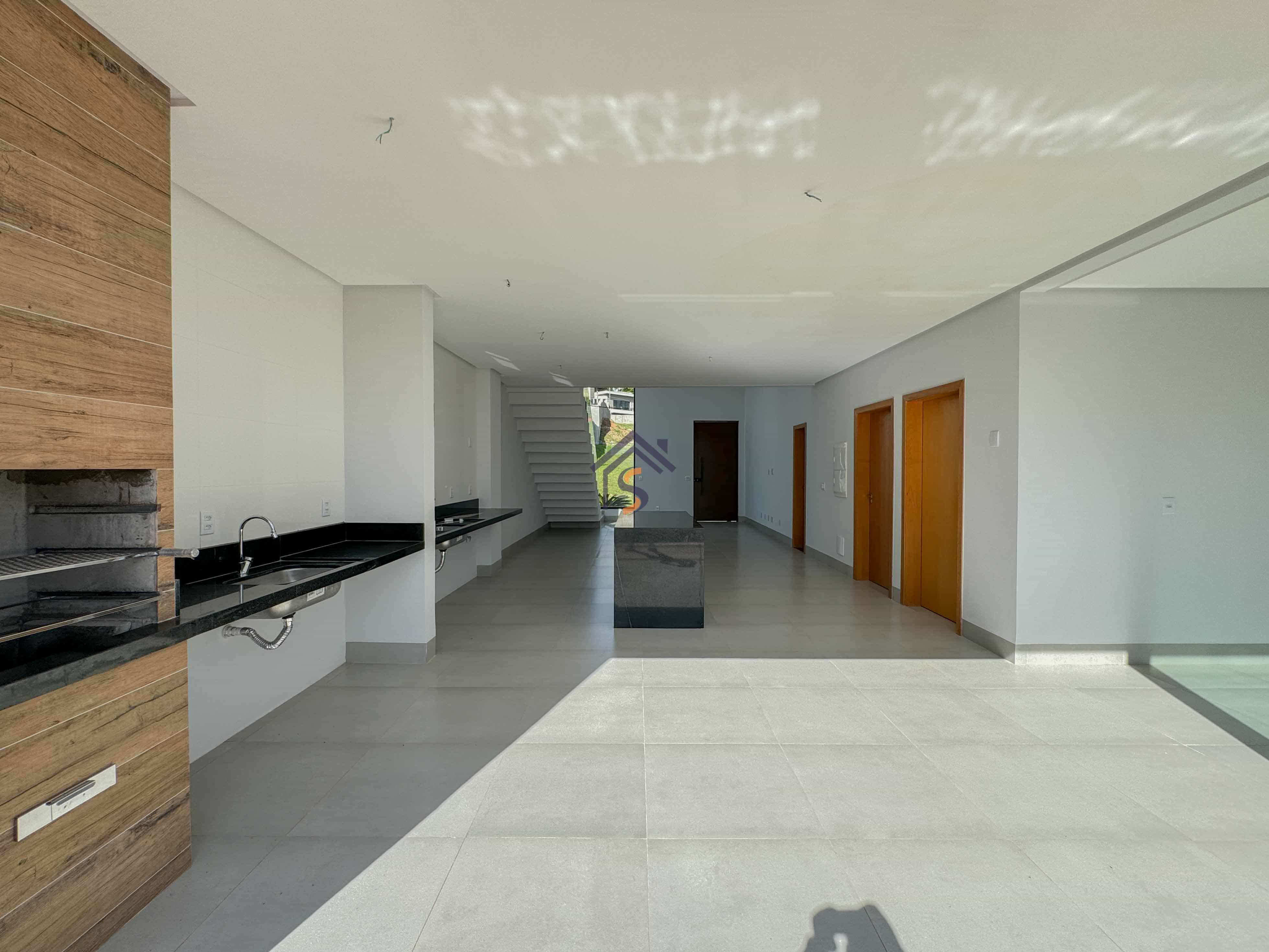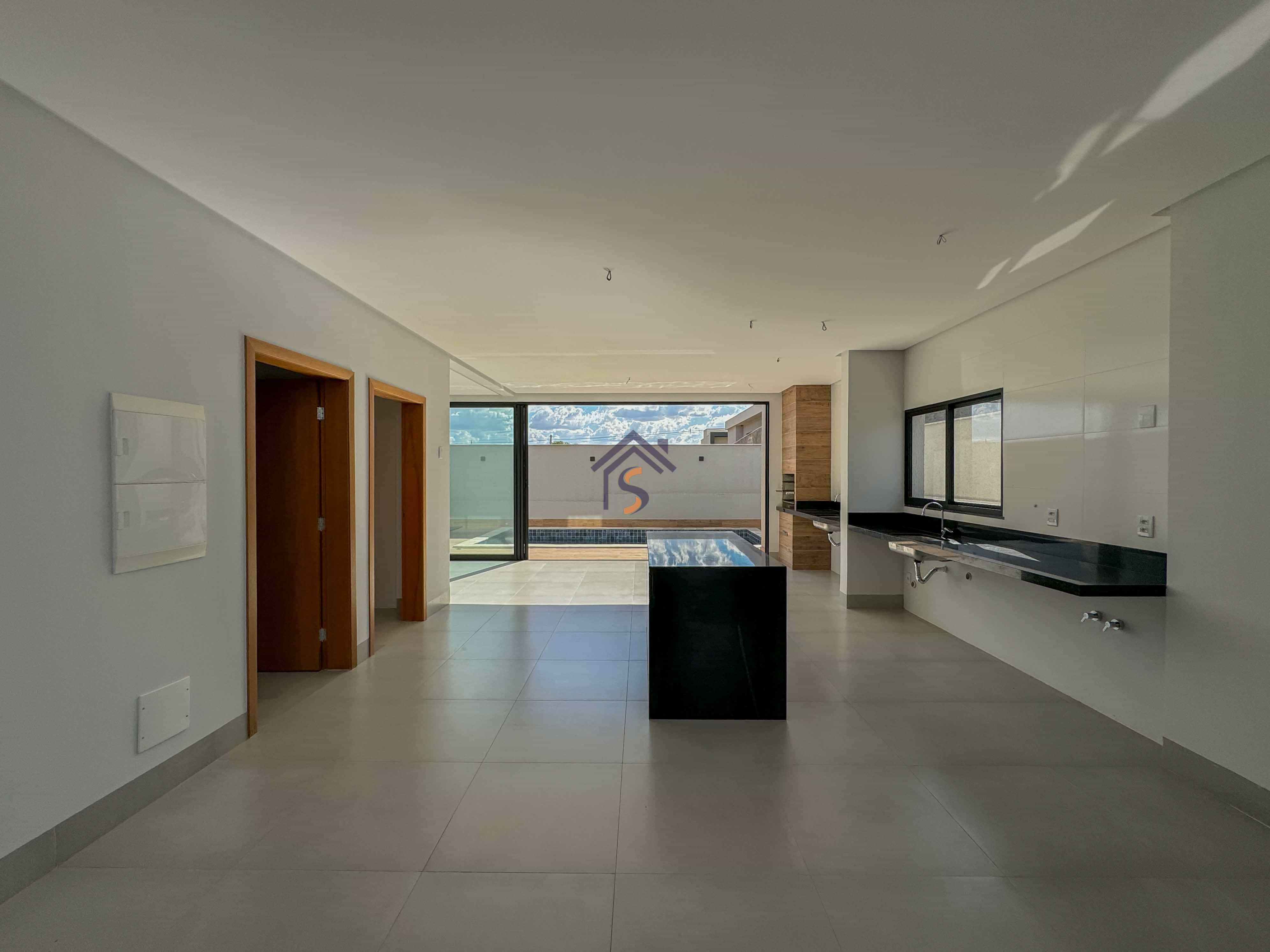 Acabamento sofisticado em alto padrão, com piscina moderna com revestimento Hijau azul com Deck molhado e Deck seco, esquadrias na cor preta linha Supreme, louças e metais premium deca e docol, todas as torneiras misturador monocomando prontas para receber água quente e fria na cozinha, área gourmet e banheiros, revestimento em porcelanato Delta e Calacata, bancadas da cozinha e ilha gourmet em pedra Preto São Gabriel, bancadas dos banheiros em pedra esculpida preto São Gabriel, fachada moderna com vidros e na posição nascente, churrasqueira à carvão na área gourmet, sistema de iluminação em Led na garagem, paisagismo na frente e nas laterais da casa.