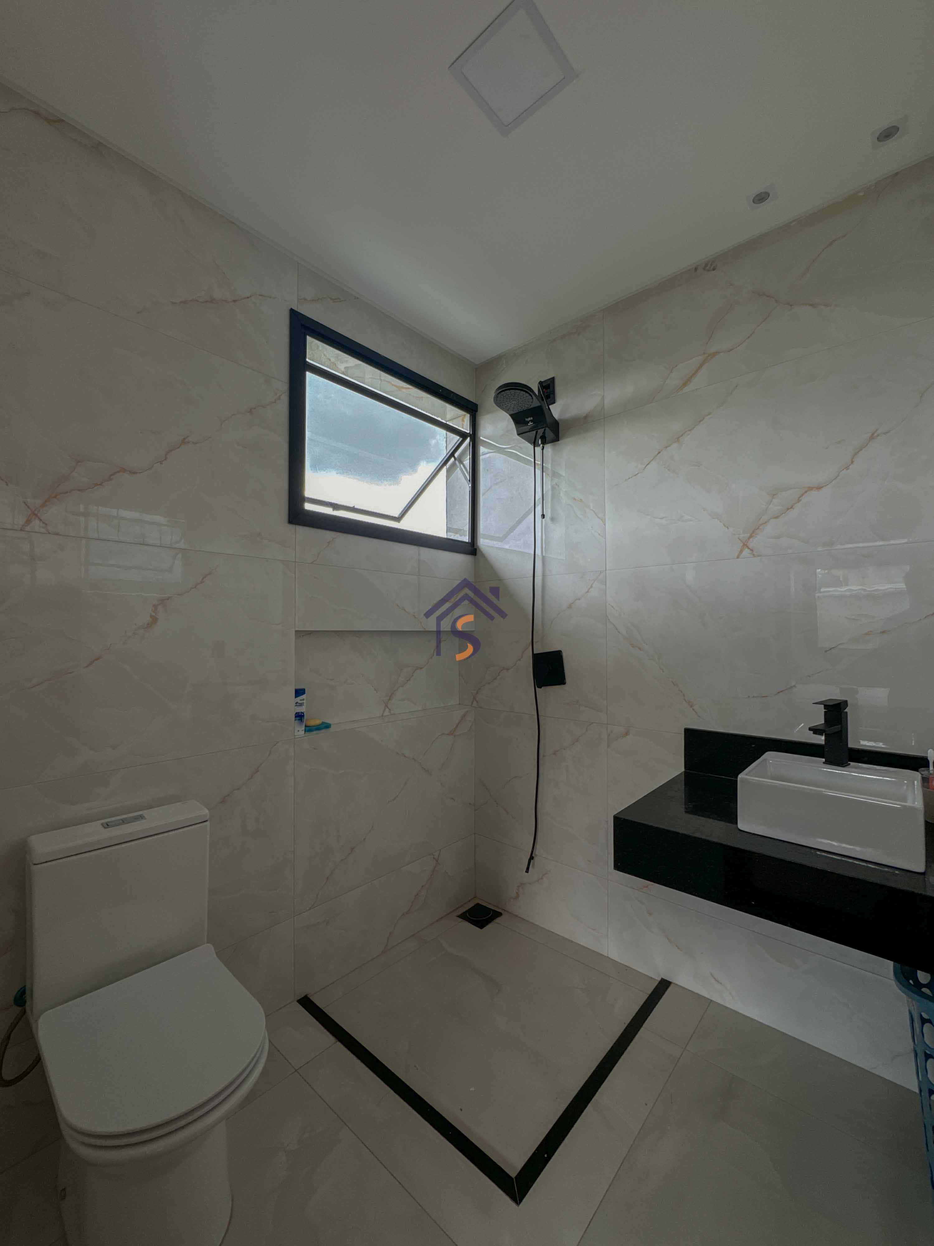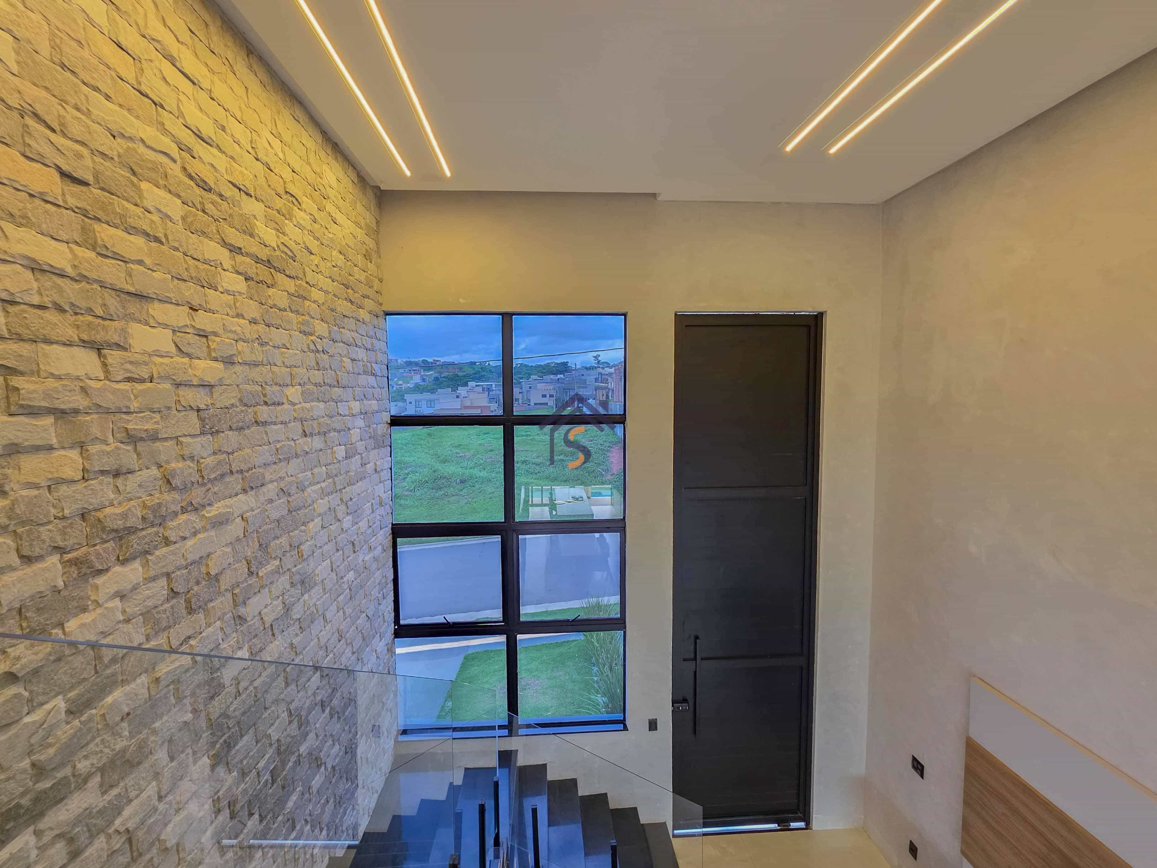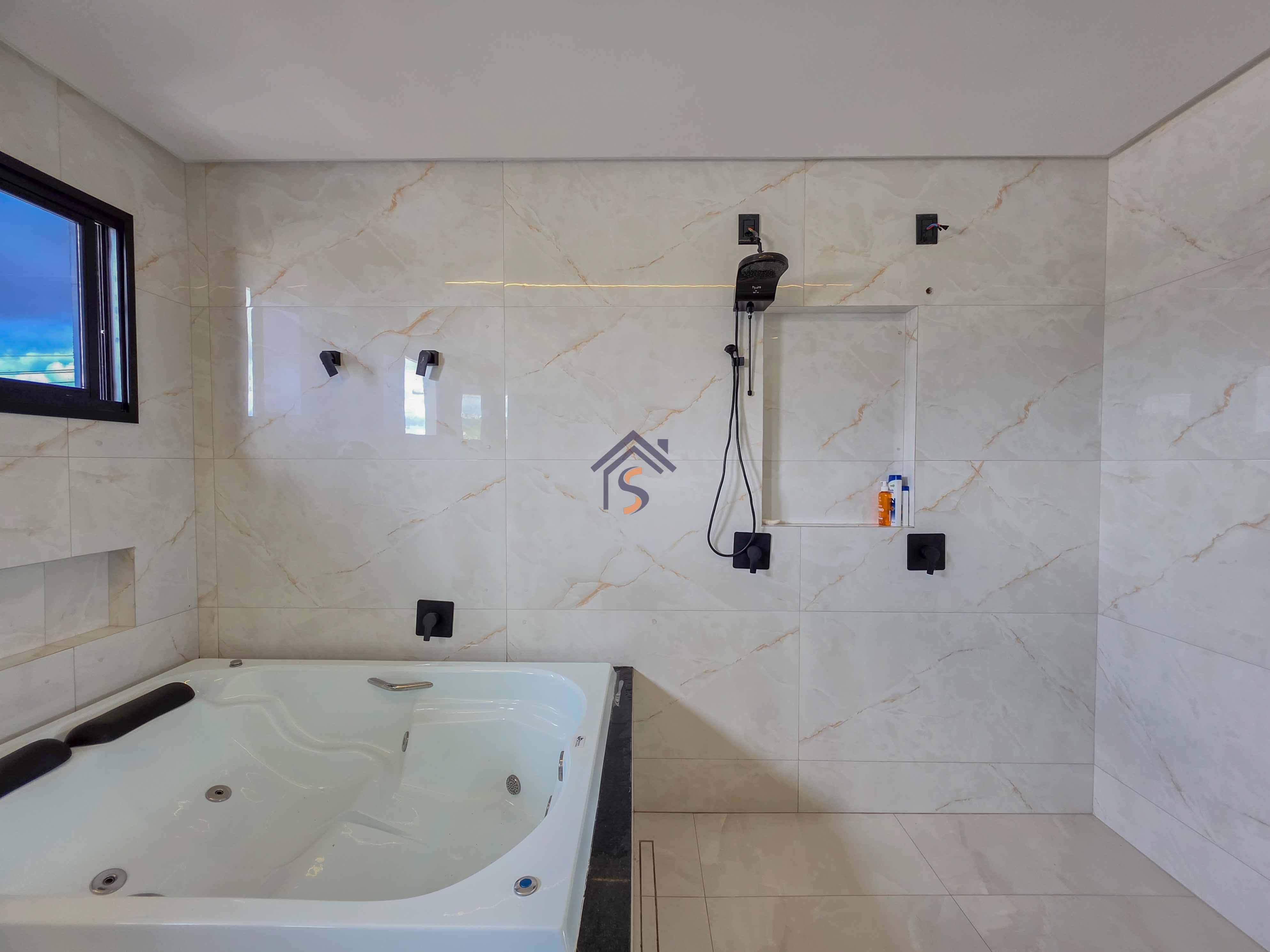 Acabamento sofisticado em alto padrão, porcelanato 1.23×1.23, projeto luminotécnico, rica em pedras naturais, rebaixamento de gesso, cozinha com armários planejados, dois banheiros com ducha, banheira de imersão, porta social com ripado e fechadura eletrônica, piscina com prainha e aquecimento solar, usina fotovoltaica para 1.000kw/h, esquadrias automatizadas, tomadas com fiação pronta para carregamento de veículos elétricos na garagem, sonorização JBL no teto da área gourmet, seis pontos de ar condicionado (suítes, escritório e salas), esquadrias alumínio preto fosco, paisagismo, mantendo o mesmo padrão nos acabamentos.