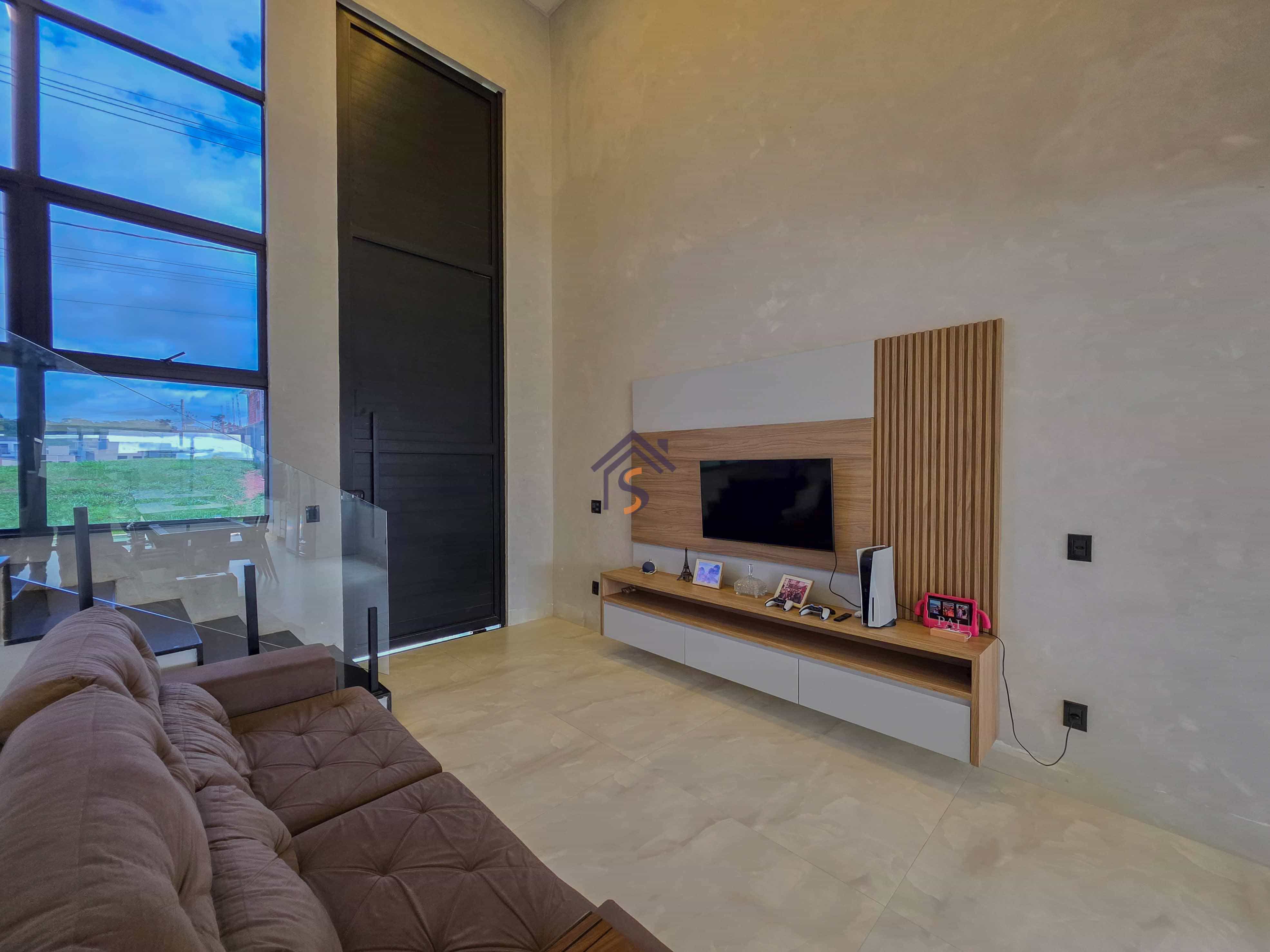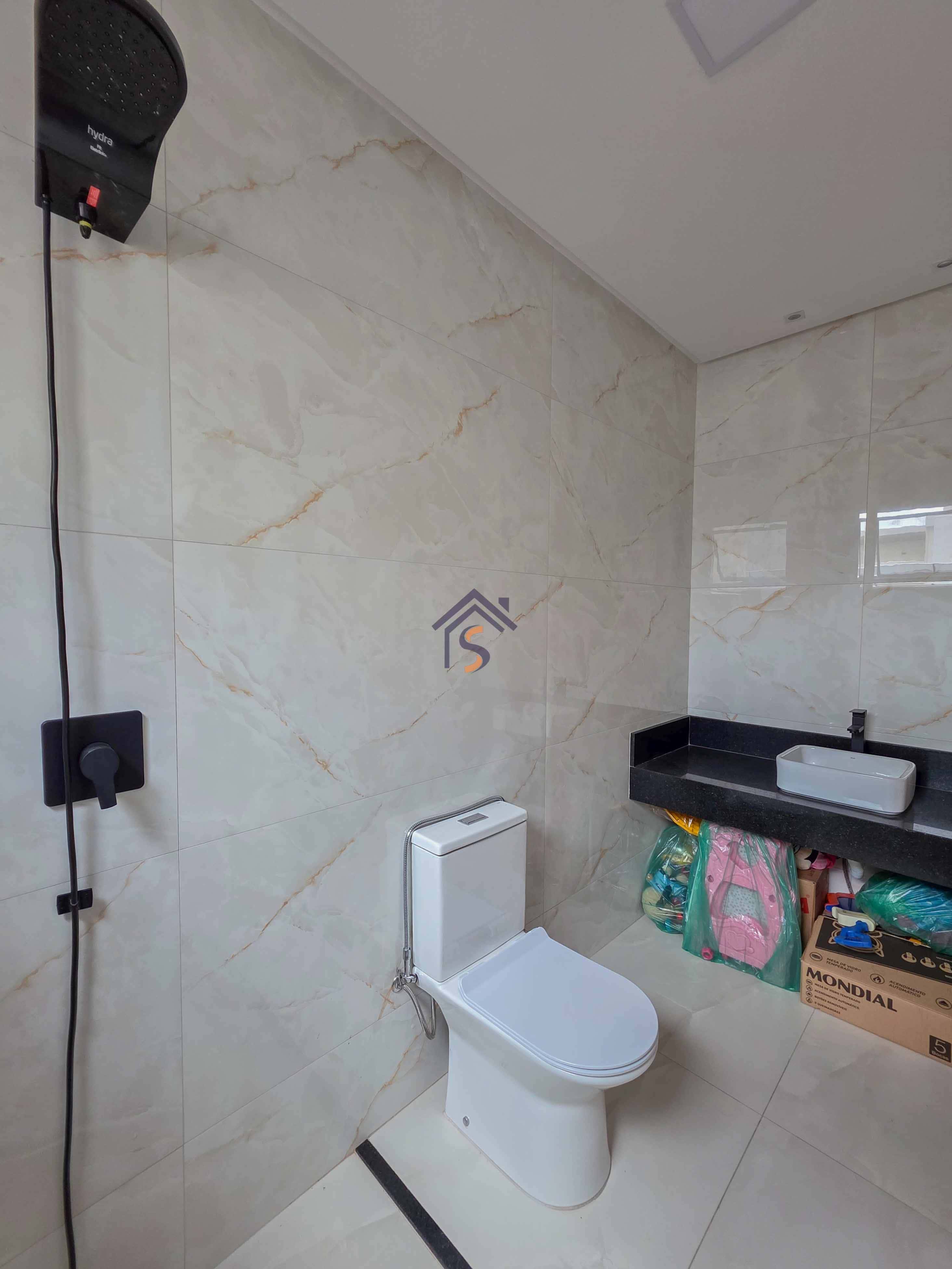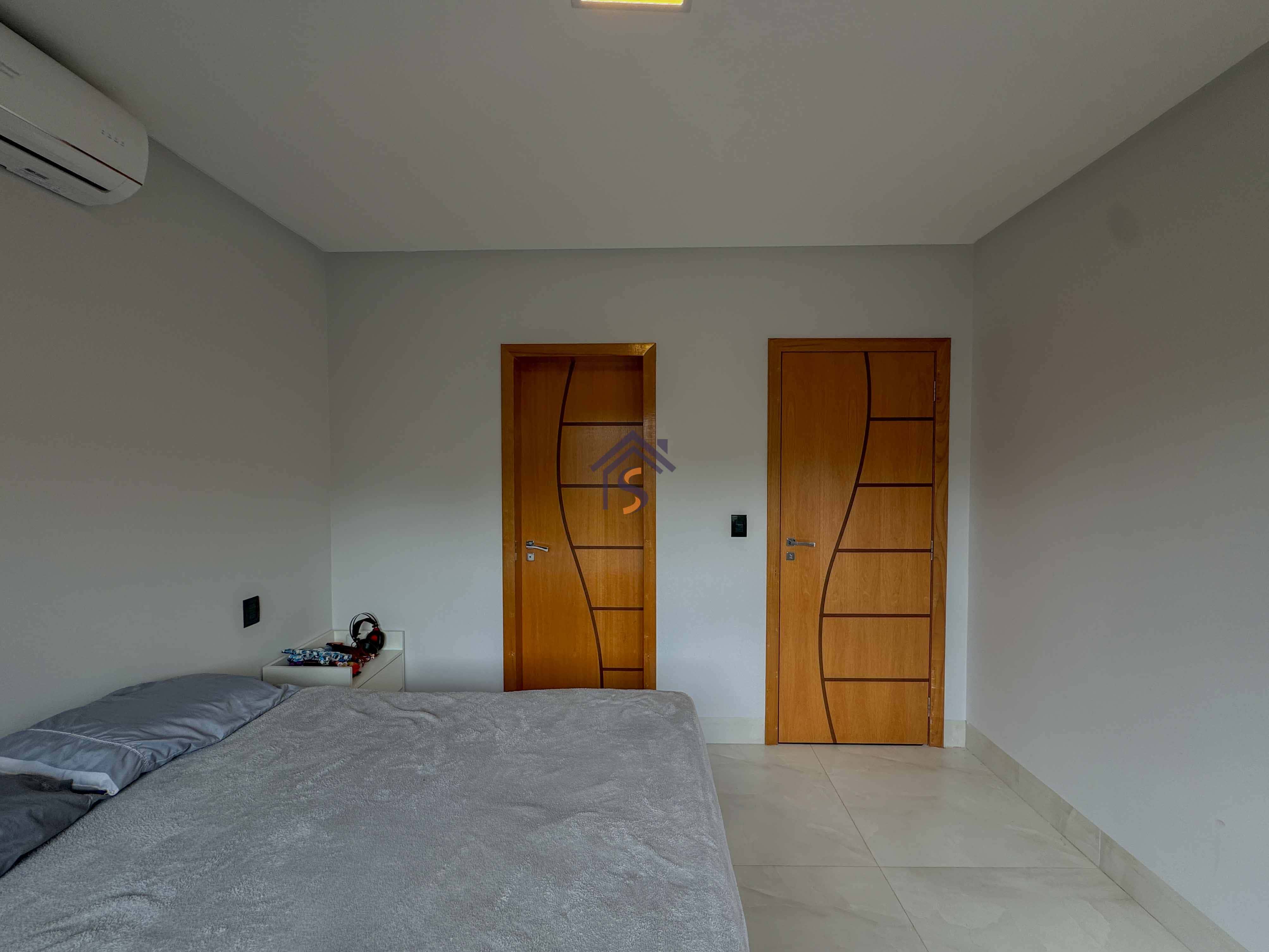 Acabamento sofisticado em alto padrão, porcelanato 1.23×1.23, projeto luminotécnico, rica em pedras naturais, rebaixamento de gesso, cozinha com armários planejados, dois banheiros com ducha, banheira de imersão, porta social com ripado e fechadura eletrônica, piscina com prainha e aquecimento solar, usina fotovoltaica para 1.000kw/h, esquadrias automatizadas, tomadas com fiação pronta para carregamento de veículos elétricos na garagem, sonorização JBL no teto da área gourmet, seis pontos de ar condicionado (suítes, escritório e salas), esquadrias alumínio preto fosco, paisagismo, mantendo o mesmo padrão nos acabamentos.