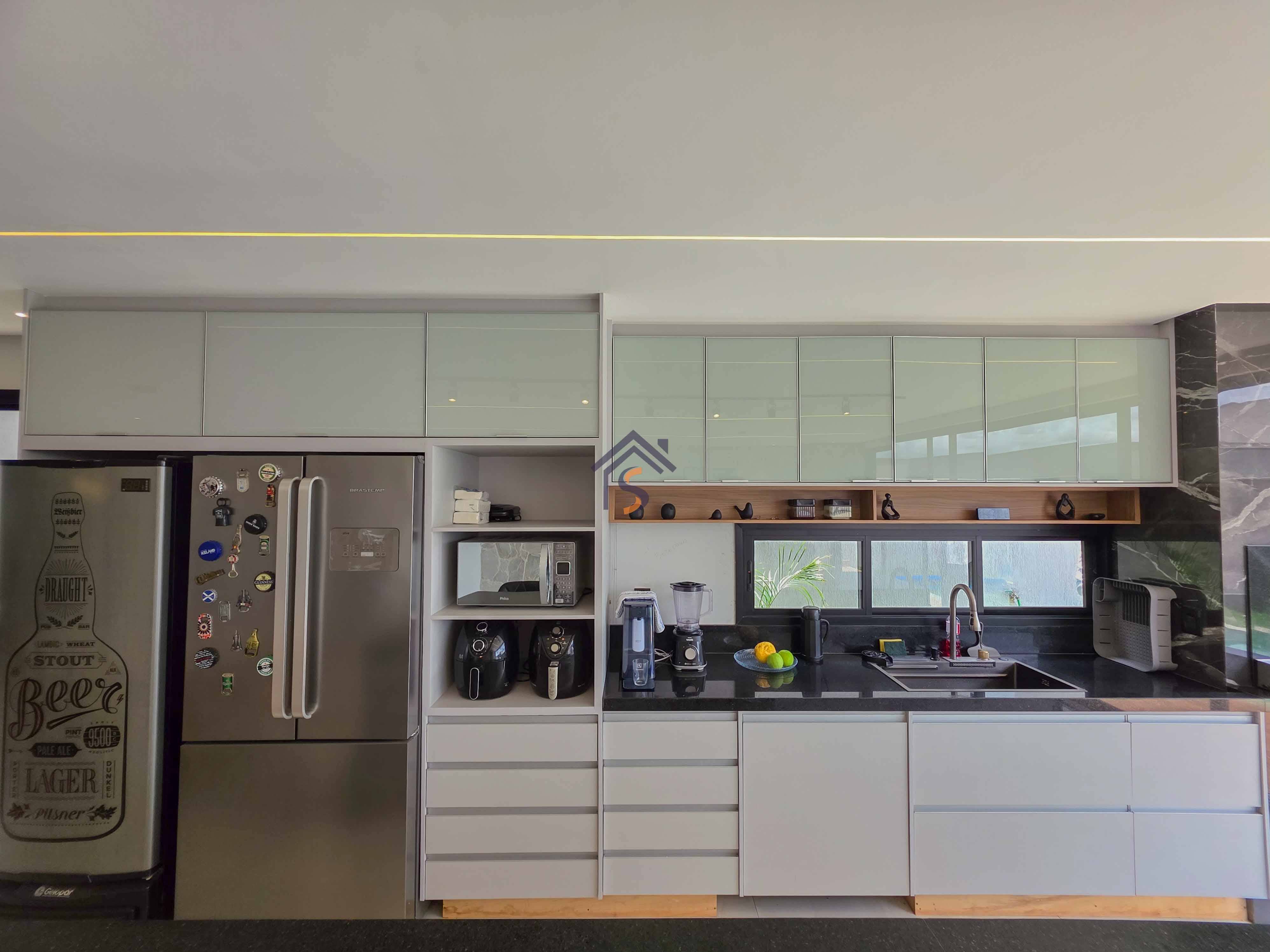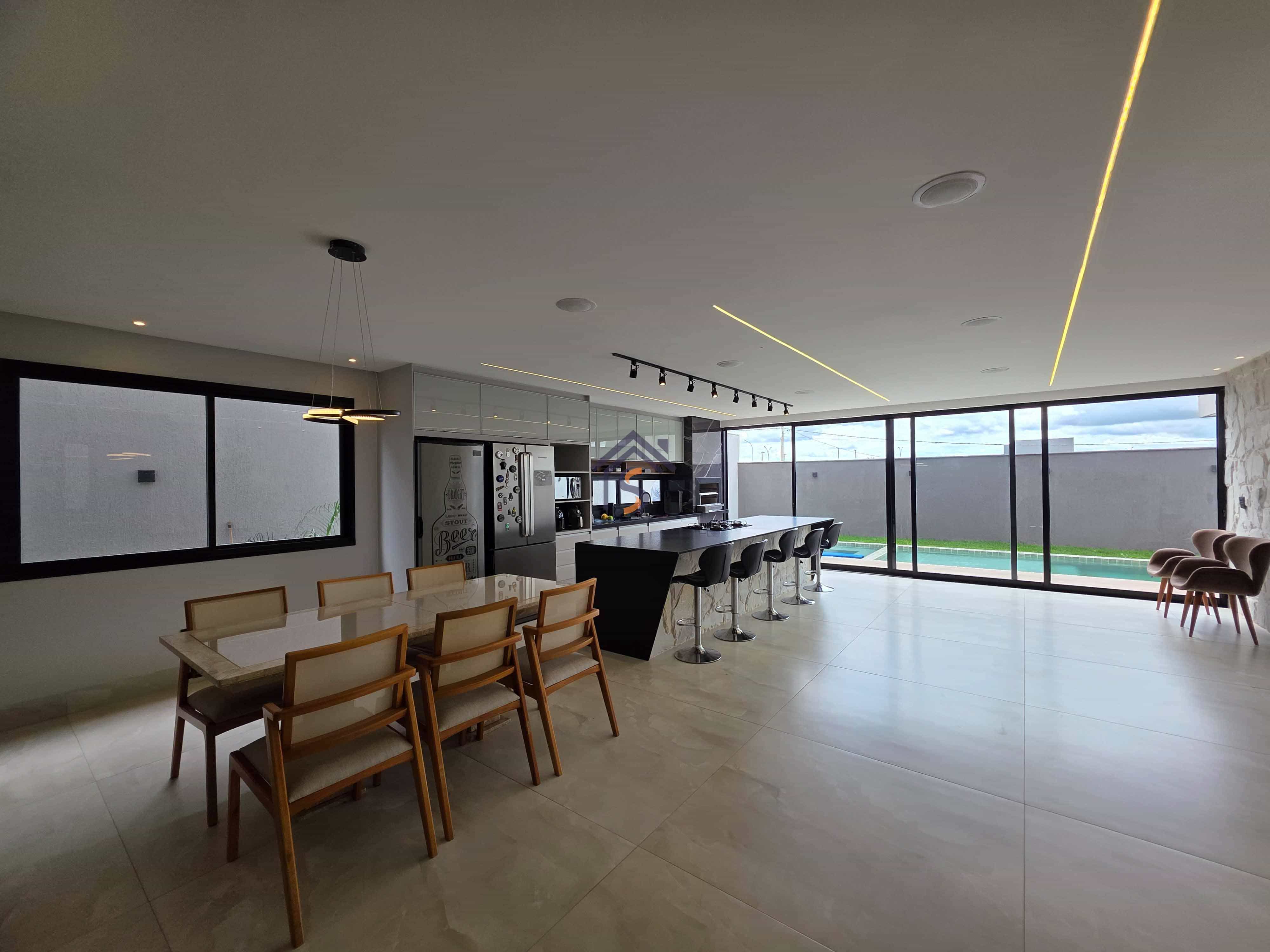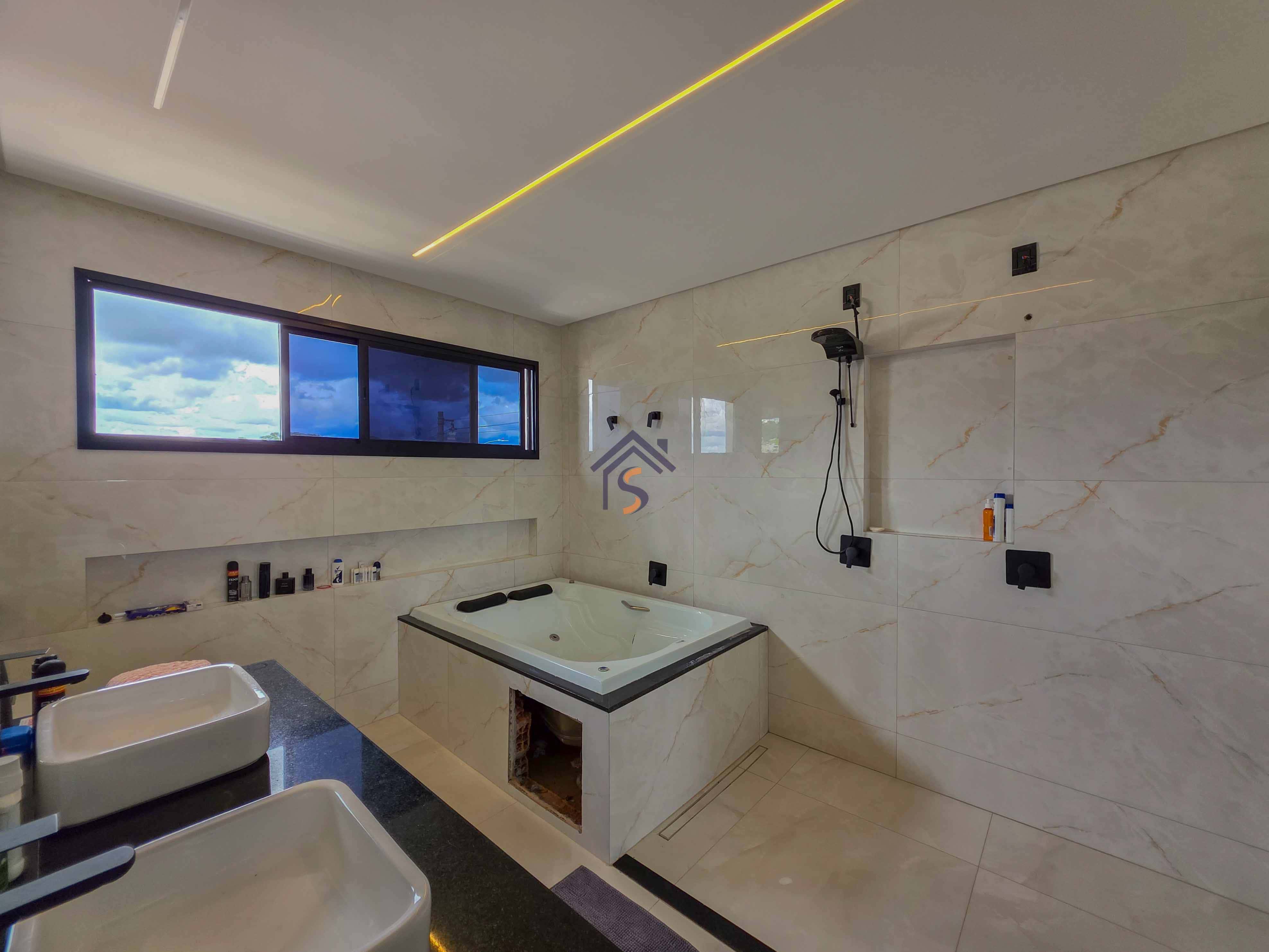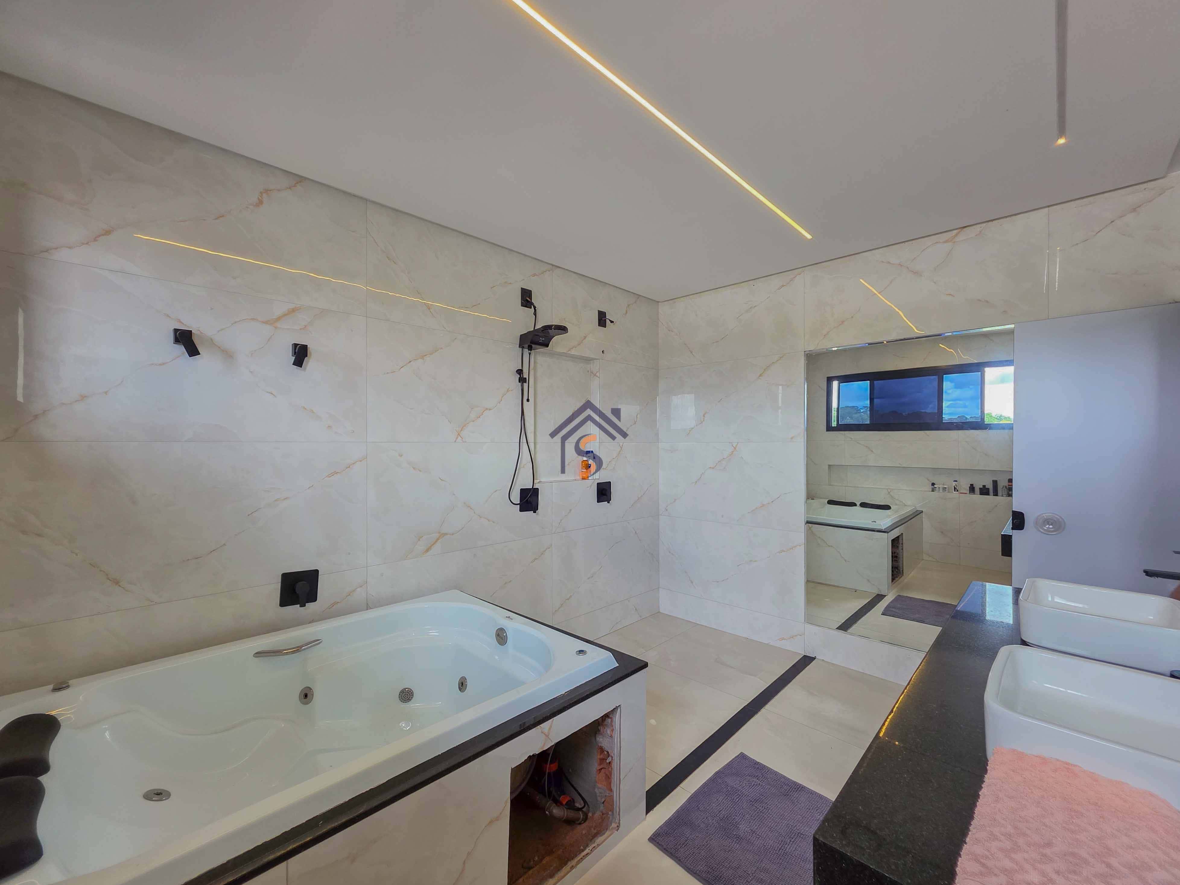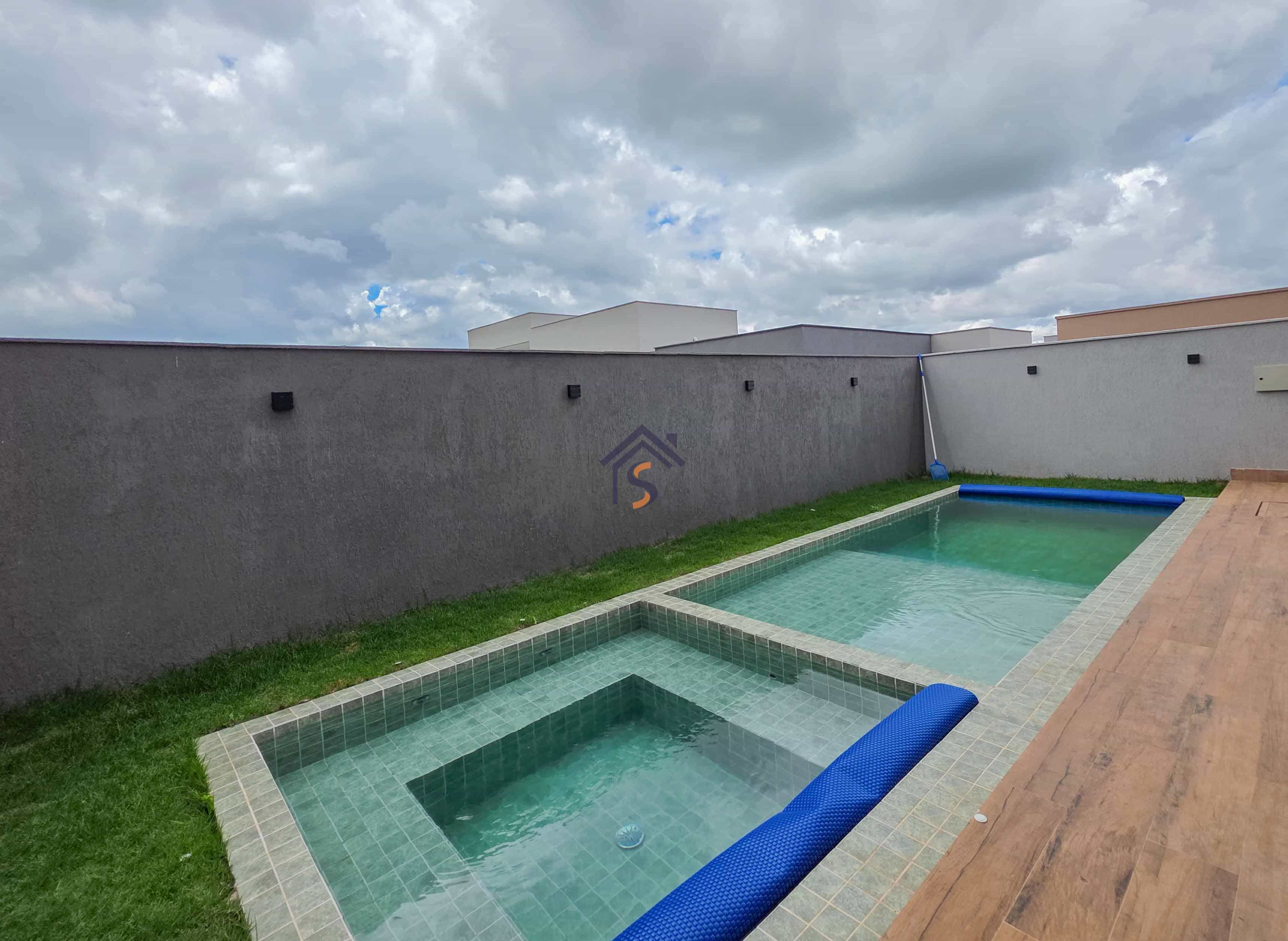 Sobrado em condomínio com quatro suítes plenas, sendo uma suíte máster com banheira, sala de estar e sala de jantar ampla, lavabo, cozinha, piscina com hidromassagem, escritório reversível para quarto no térreo, despensa com área de serviço coberta, quatro vagas de garagens, sendo duas vagas cobertas.