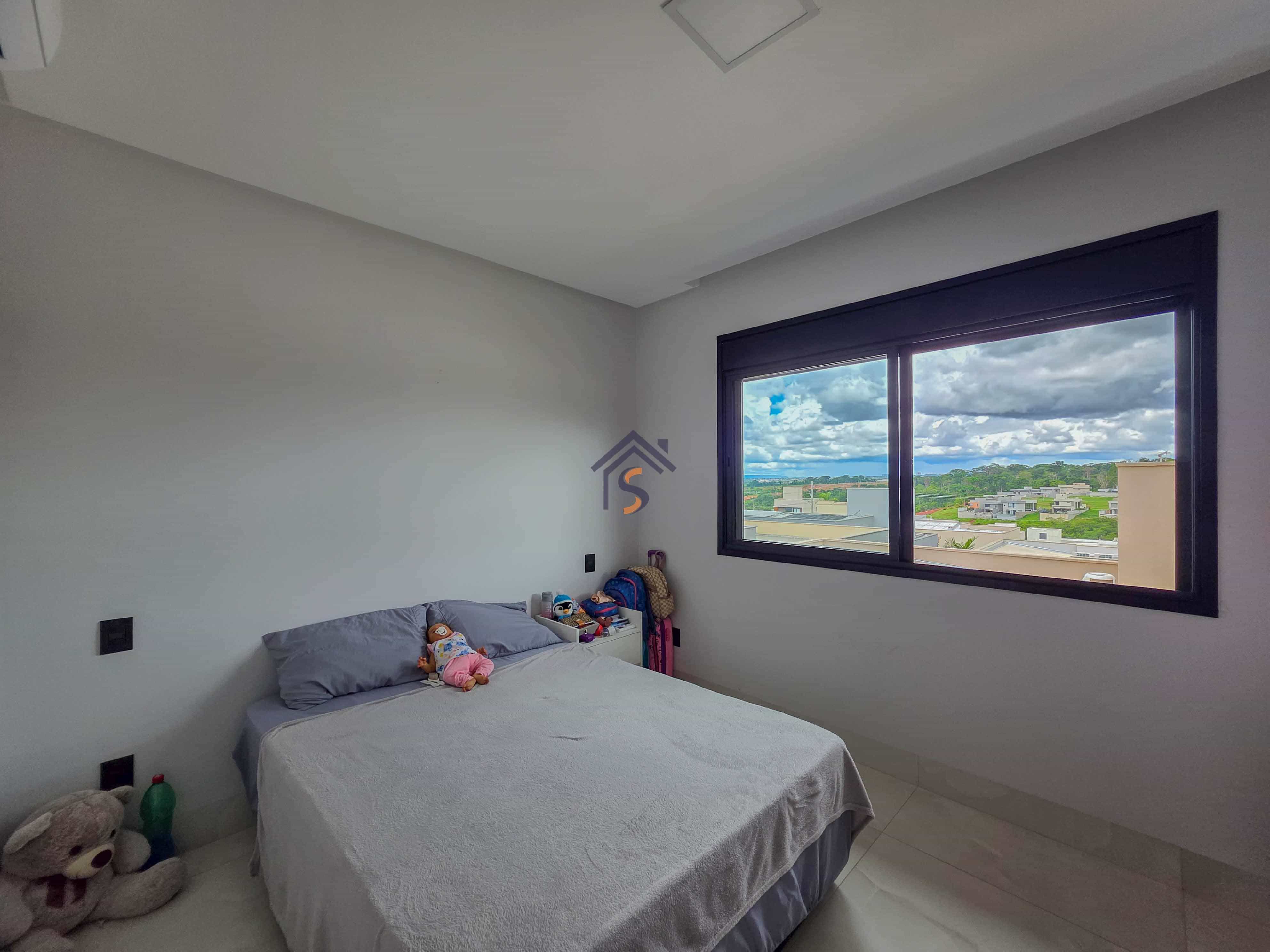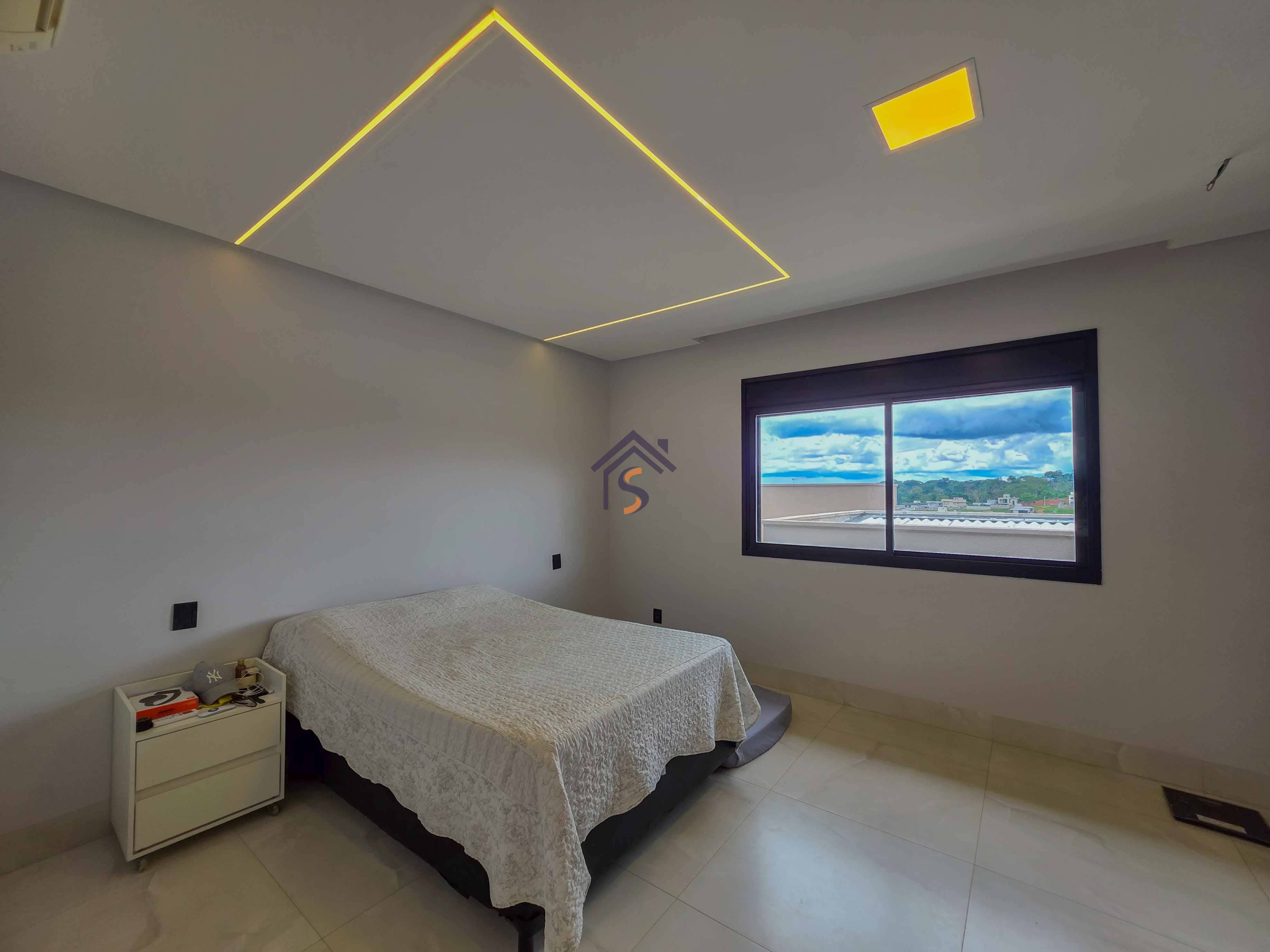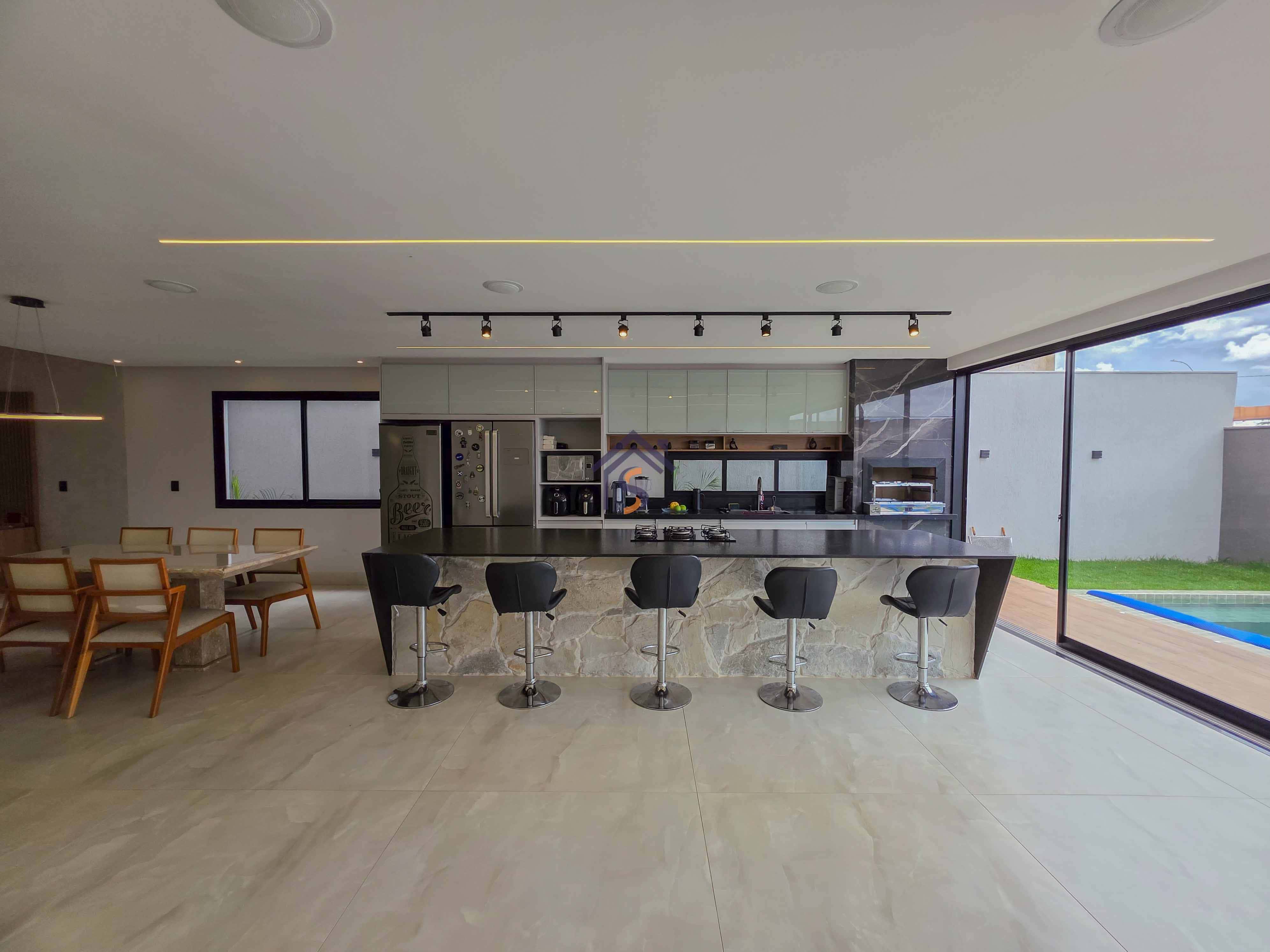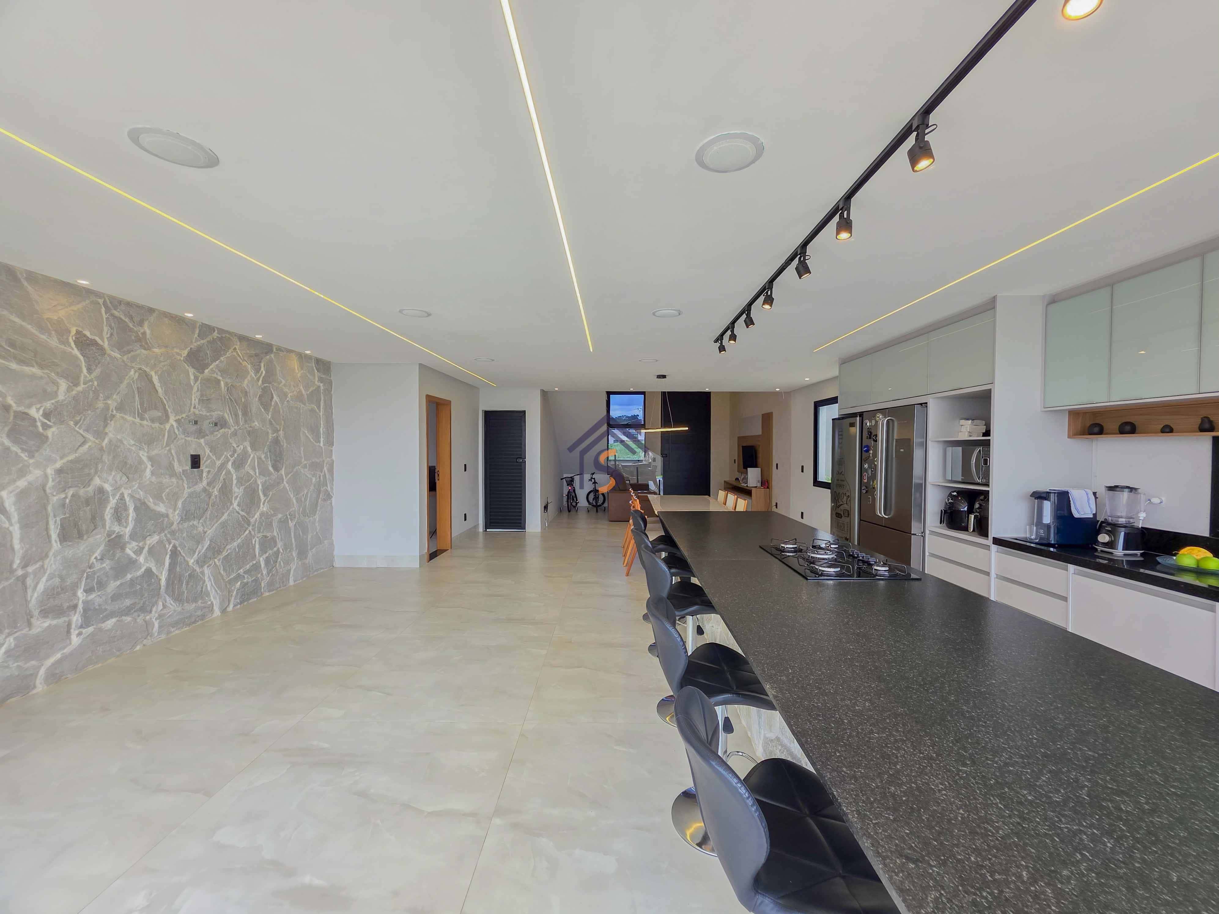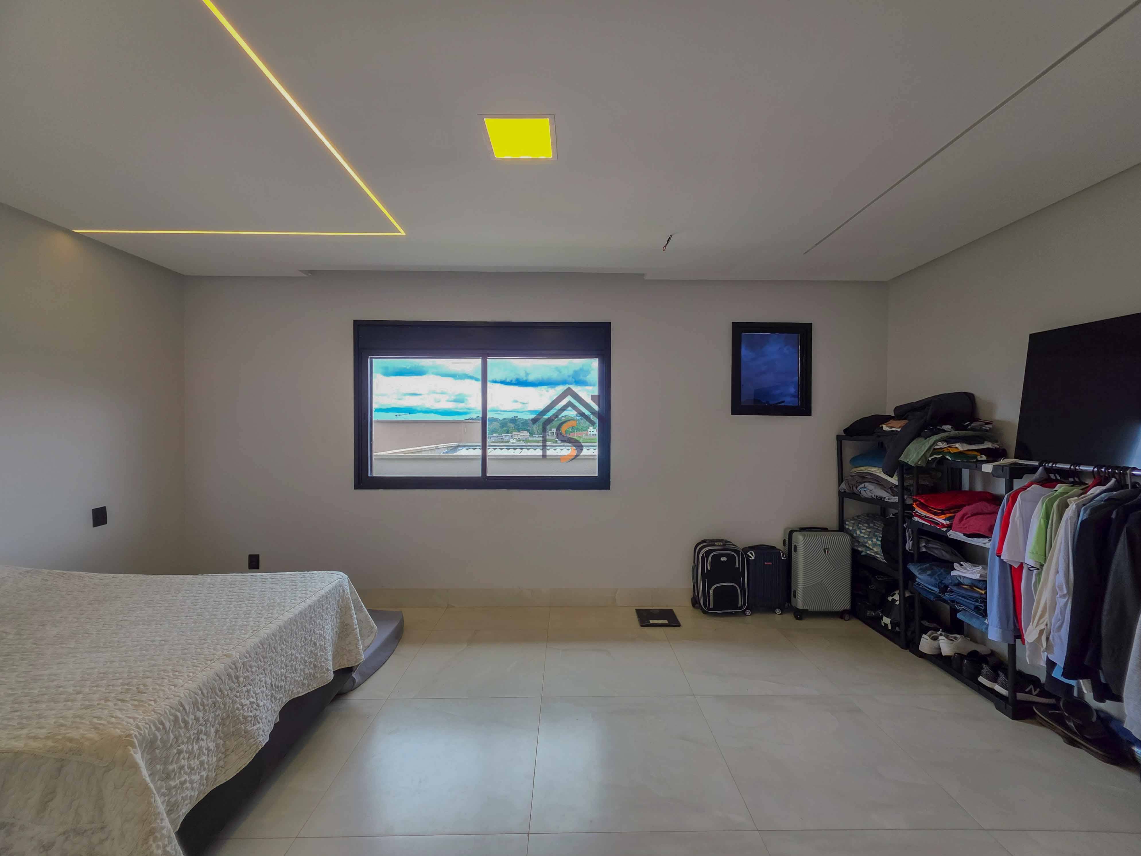 Sobrado em condomínio com quatro suítes plenas, sendo uma suíte máster com banheira, sala de estar e sala de jantar ampla, lavabo, cozinha, piscina com hidromassagem, escritório reversível para quarto no térreo, despensa com área de serviço coberta, quatro vagas de garagens, sendo duas vagas cobertas.