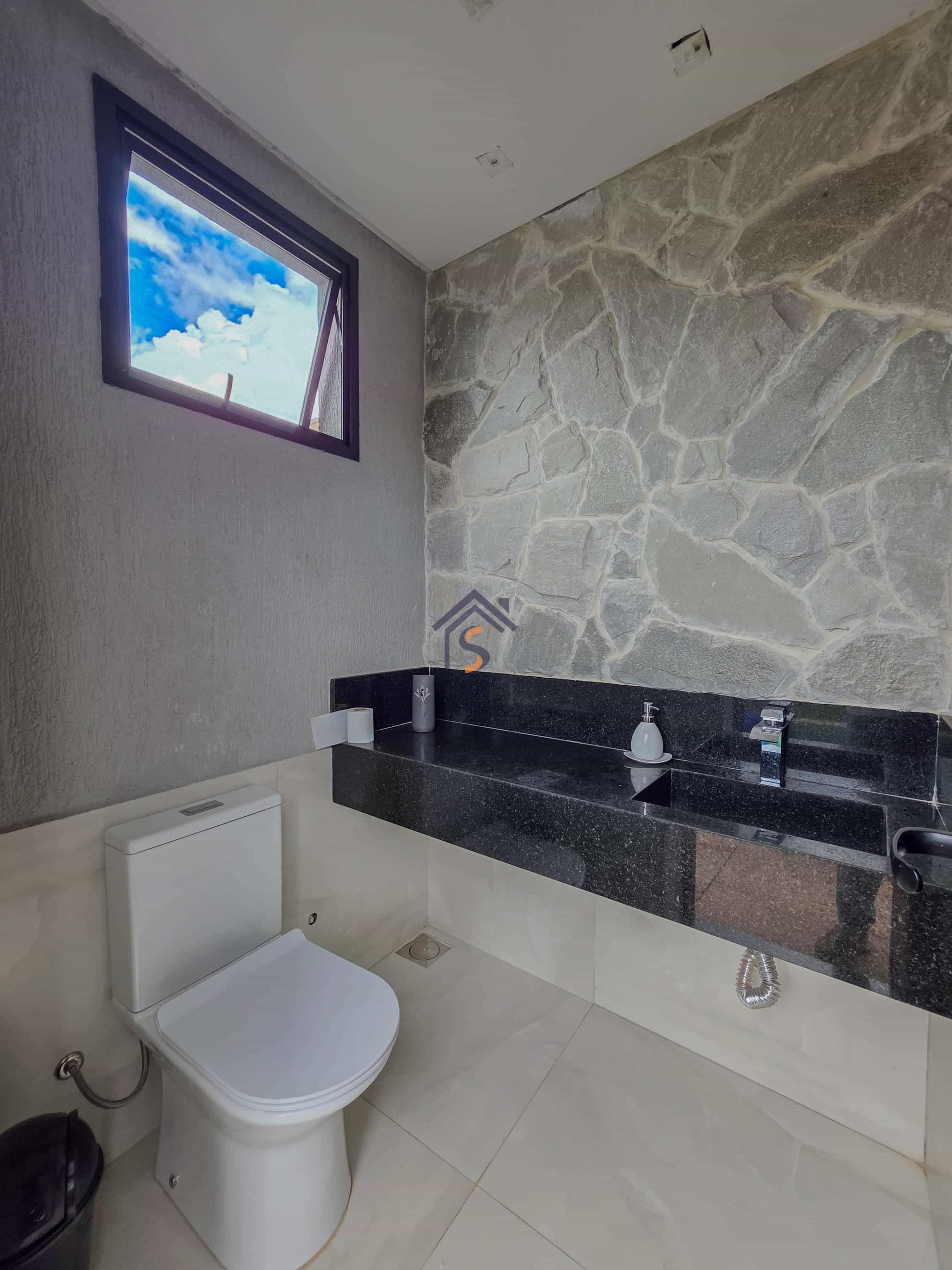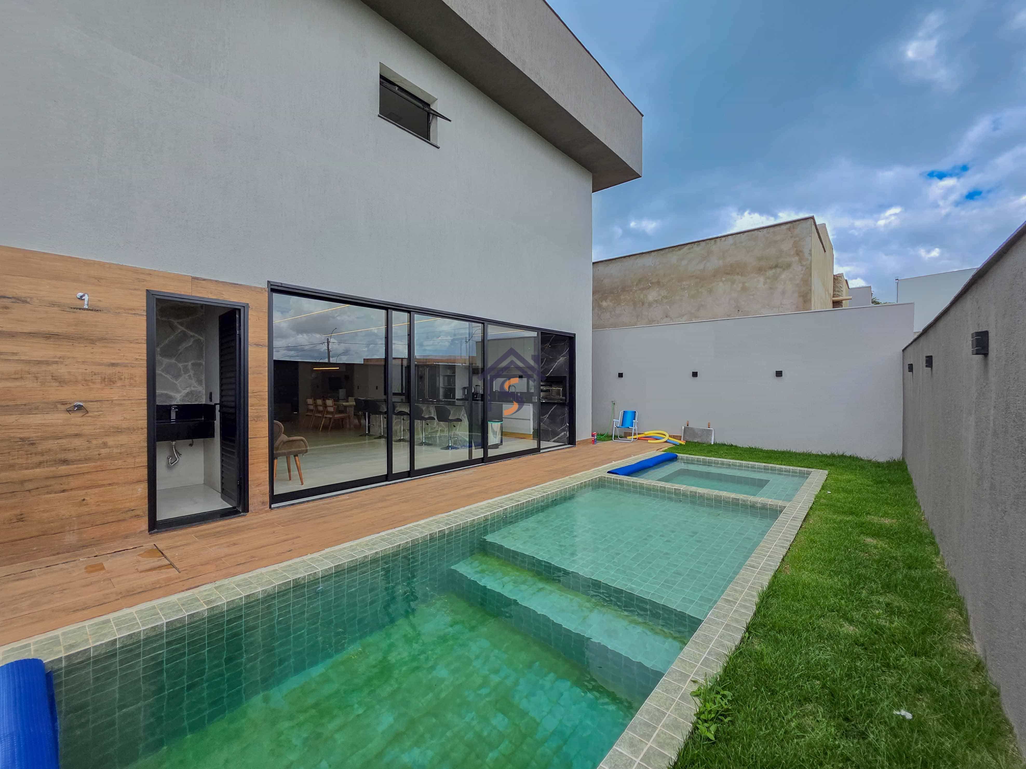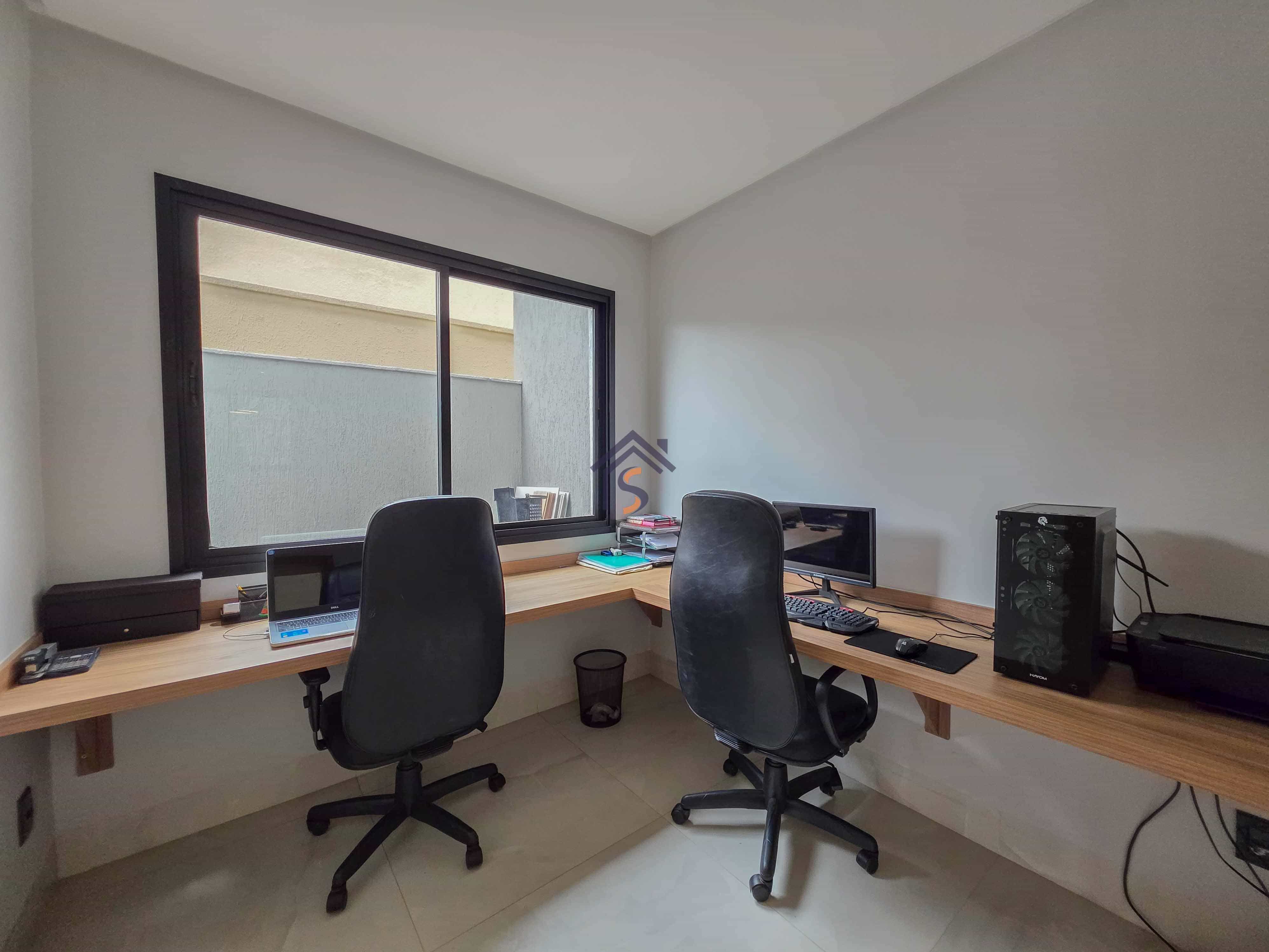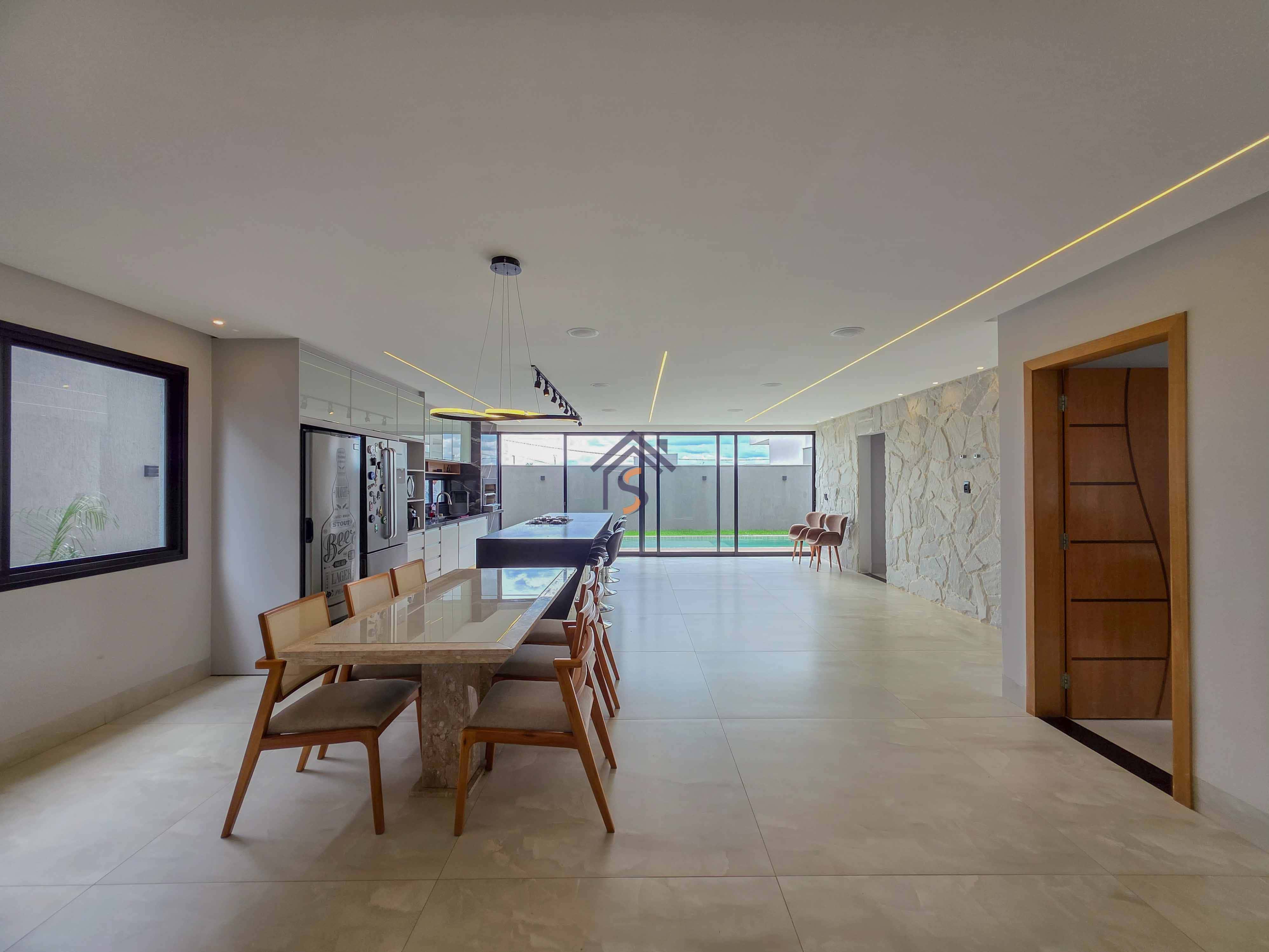 Sobrado em condomínio com quatro suítes plenas, sendo uma suíte máster com banheira, sala de estar e sala de jantar ampla, lavabo, cozinha, piscina com hidromassagem, escritório reversível para quarto no térreo, despensa com área de serviço coberta, quatro vagas de garagens, sendo duas vagas cobertas.